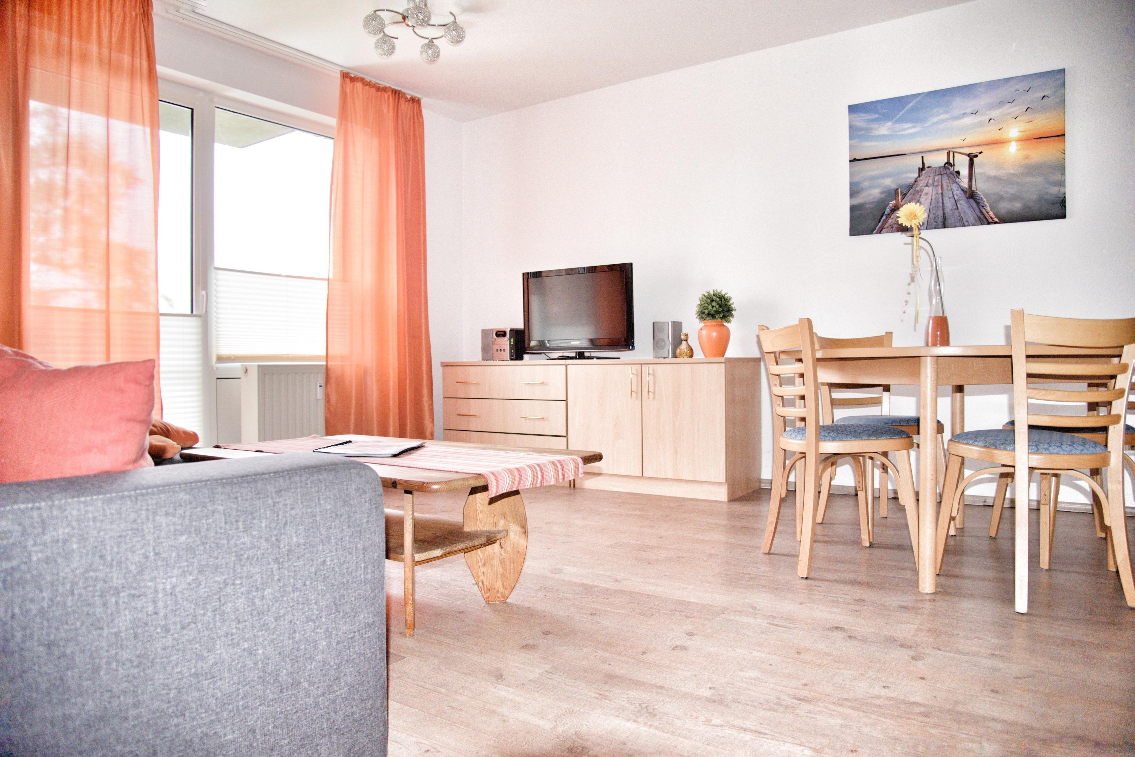 Ihr lichtdurchflutetes Wohnzimmer verfügt über einen Esstisch mit vier Stühlen, ein ausziehbares Schlafsofa mit einem Schlafplatz für zwei Personen und zwei Sessel. Die Wohnküche ist zum Wohnzimmer hin offen, was den Raum noch weitläufiger erscheinen lässt. Multimedial steht Ihnen hier ein großer Flachbildfernseher mit Kabel-TV zur Verfügung. Auch einige Gesellschaftsspiele dürfen im Bestand nicht fehlen. Im Schlafzimmer befinden sich ein komfortables Doppelbett sowie ein großzügig bemessener Kleiderschrank. Hier können Sie Ihre Koffer bequem auspacken. Ihre Küchenzeile ist voll ausgestattet. Bestandteile sind unter anderem ein Kochfeld, eine Kaffeemaschine, eine Mikrowelle, ein Backofen, viel Geschirr sowie einen Kühlschrank mit Gefrierfach. Hier können Sie sich kulinarisch voll entfalten. Ihr Badezimmer hat eine Dusche mit Duschkabine und Ablageflächen. Ihre mitgebrachten Utensilien werden Sie hier gut verstauen können. In Ihrem Flur finden Sie eine Garderobe und einen großen Spiegel vor. Das Appartement Muschel liegt im Erdgeschoß des Hauses Regatta, im Eingang 3. In unmittelbarer Nähe dieses Appartements befinden sich weiter Ferienappartements unserer Gesellschaft. Eine gemeinsame Anmietung ist hier sehr gut möglich.