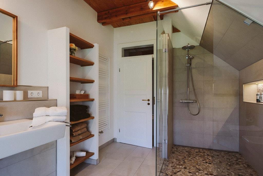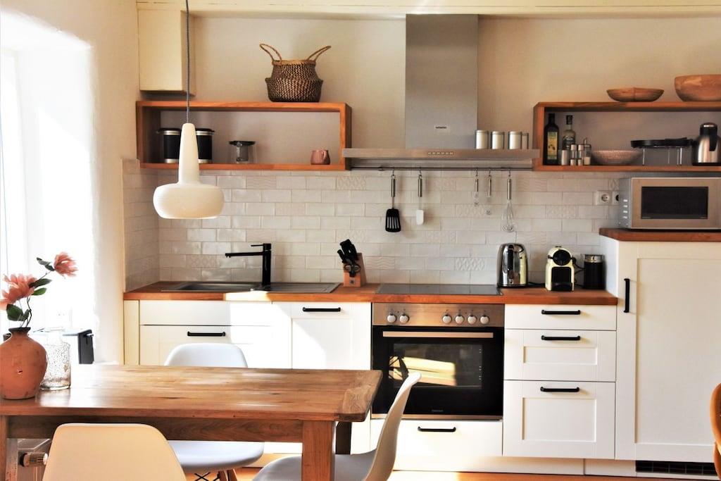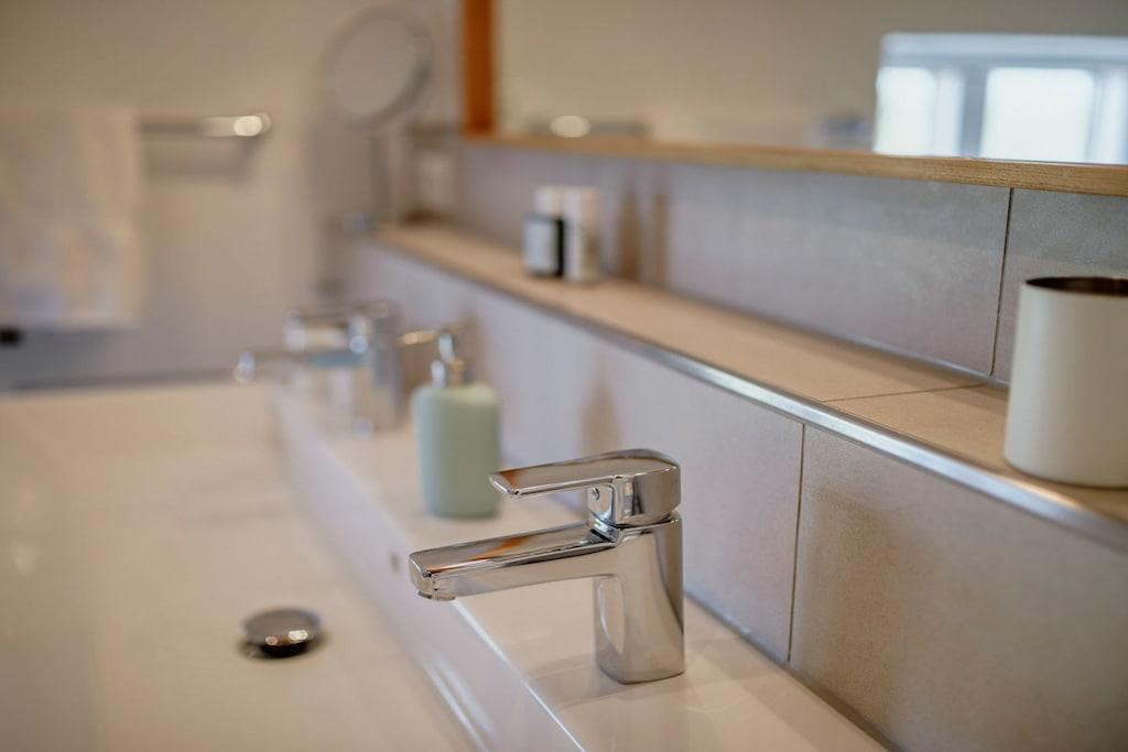 *** Besuchen Sie unsere Webseite: www.huus-uelvesbuell.de *** Inmitten der weiten Marschlandschaft Eiderstedts steht unser fast 120 Jahre altes Reetdachhaus Huus Uelvesbüll, das wir 2017 mit Liebe zum Detail grundlegend saniert haben. Aus jedem Fenster unseres lichtdurchfluteten Hauses mit den drei Hausteilen Ost, Süd und West schauen Sie in die Weite: auf Deiche, Felder und grasende Schafe. Die äußere Weite wird auch innen spürbar: durch eine schnörkellose, skandinavisch inspirierte und sehr hochwertige Einrichtung und Ausstattung. Im Hausflügel Richtung Süd-Ost finden Sie auf 200 qm ein Wohnzimmer mit einem Jugendstilofen und angrenzender offener Küche und Terrasse, vier Schlafzimmer für bis zu 8 Personen (9./10. Person auf Anfrage), drei Bäder sowie eine Gästetoilette. Im Haus steht Ihnen ein großzügiger Saunabereich mit Ruheraum zur Verfügung. Eine Aufladesäule für E-Autos ist auf dem Parkplatz des Hauses verfügbar.
