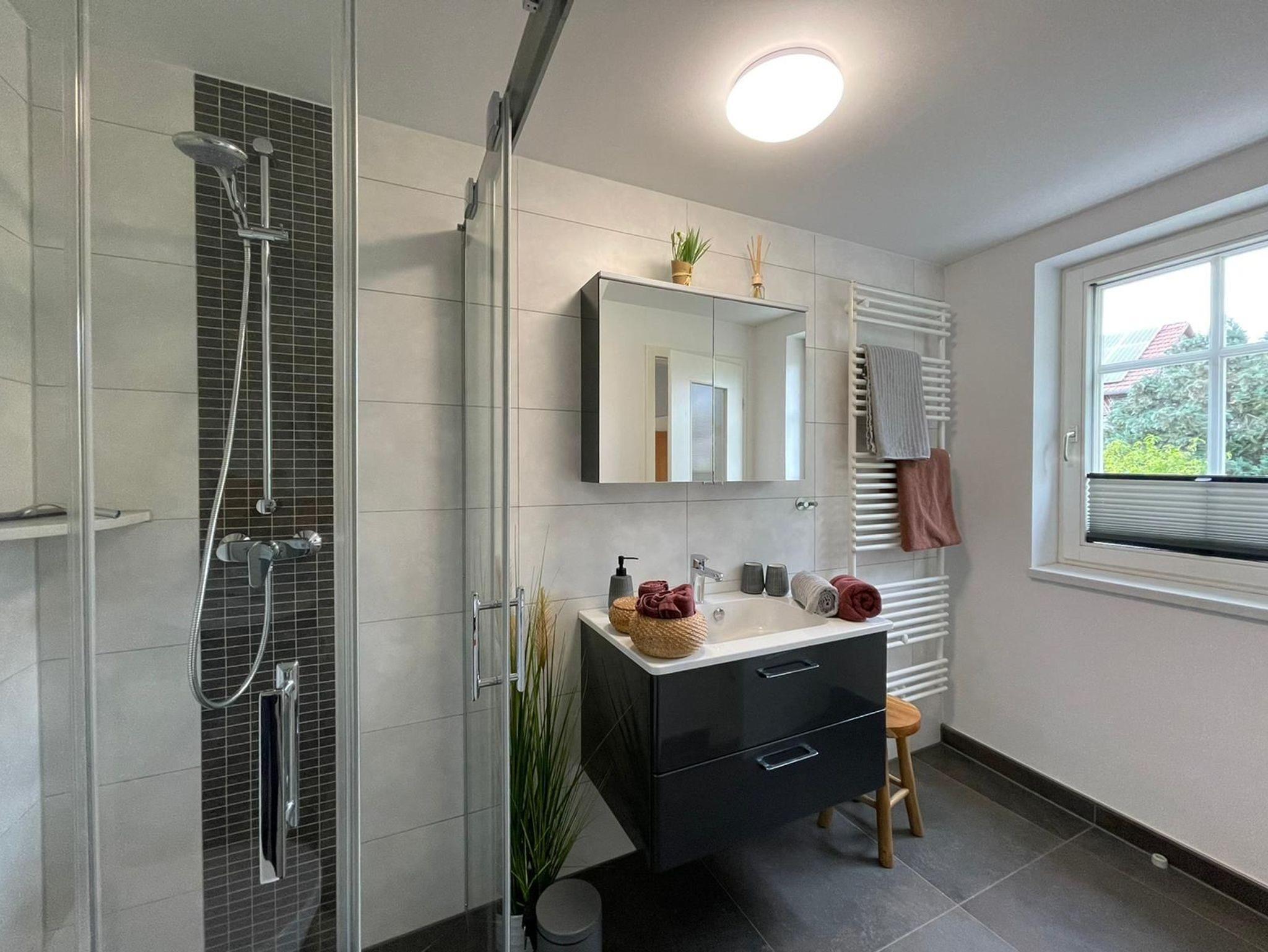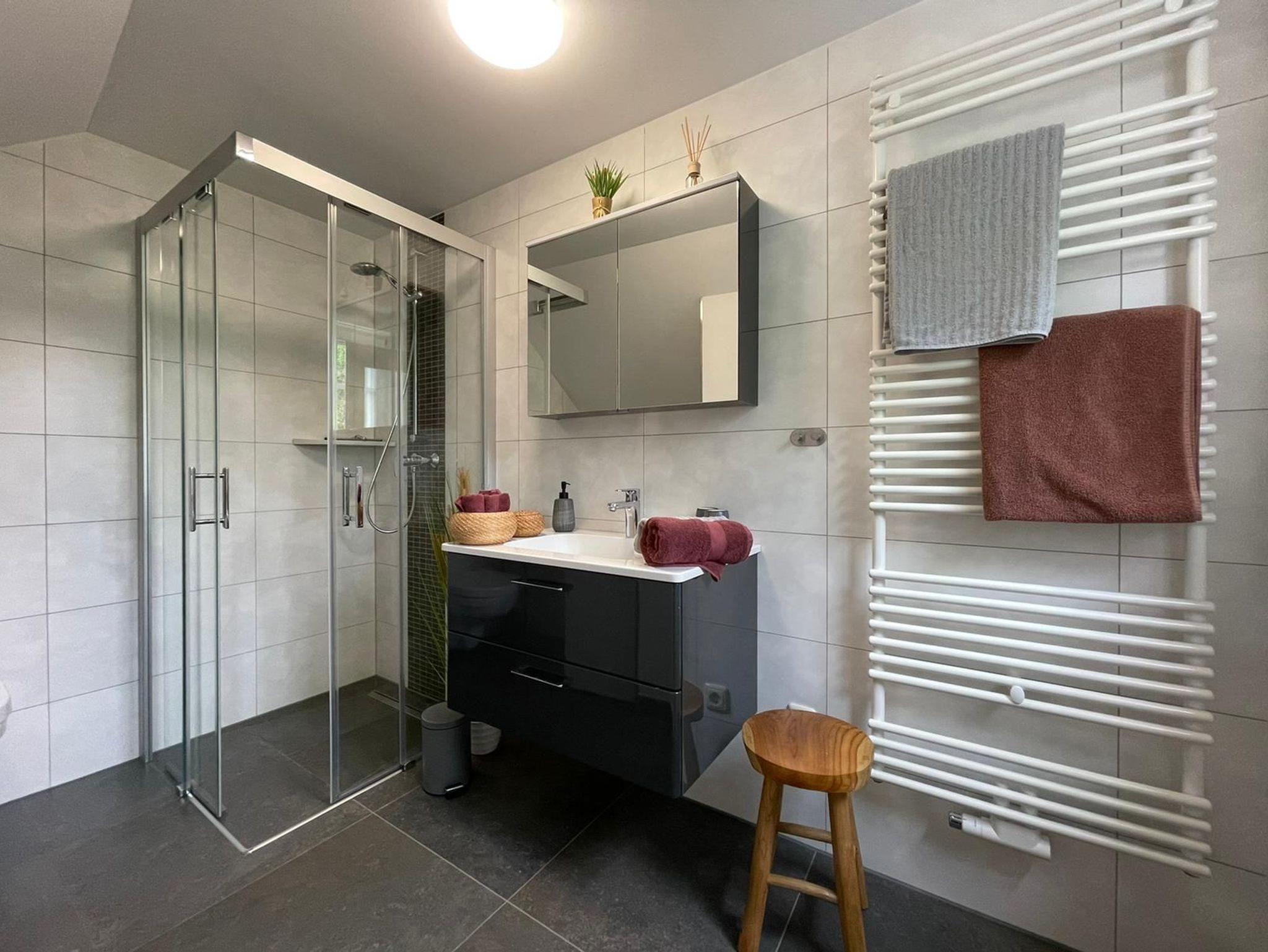 • 1 Badezimmer mit ebenerdiger Dusche, Toilette, Waschmaschine, Haartrockner, Handtücher