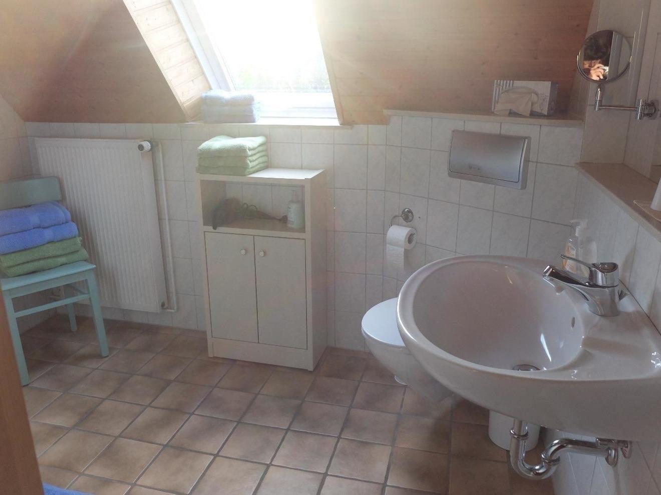 Das Badezimmer verfügt über Dusche und WC, Fön, Kosmetikspiegel.