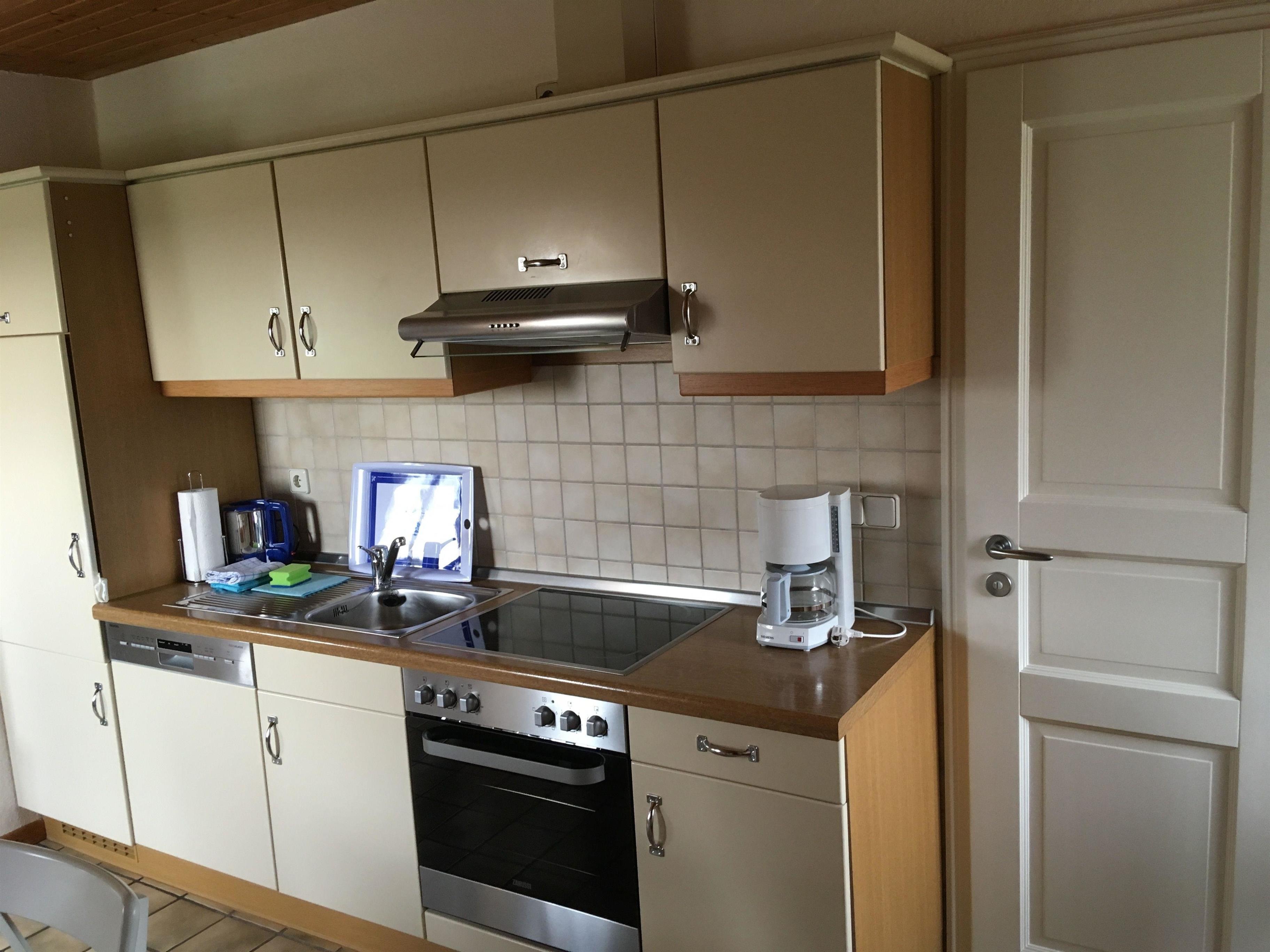 Der offene Koch- und Essbereich hat einem großem Tisch, vier Stühle, Sitzbank, Toaster und Babyhochstuhl. Die umfangreich und vollausgestattete Küche mit Herd, Ceran -Kochfeld, Dunstabzugshaube, Geschirrspülmaschine, Spüle, Kühlschrank, Wasserkocher, Kaffeemaschine, sowie allem was zur Küche gehört. Geschirr und Besteck ist ausreichend vorhanden.