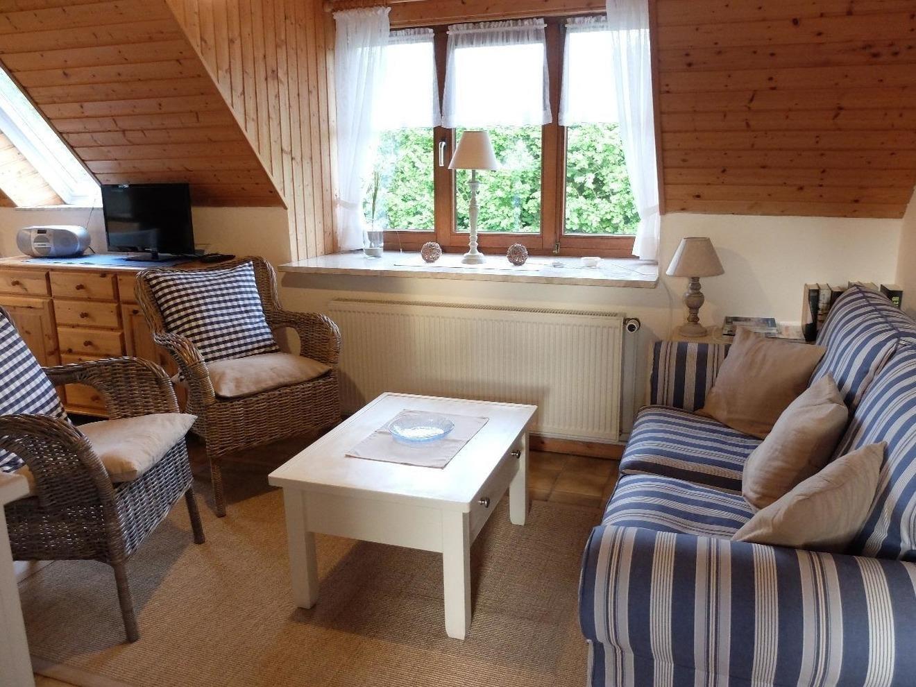 Der Wohnbereich ist mit einem Zweisitzer Sofa, zwei Korbstühlen, Couchtisch, Radio mit MP3 - Anschluss, Flachbildfernseher und DVD - Blue Ray Player ausgestattet. WLAN kostenfrei.