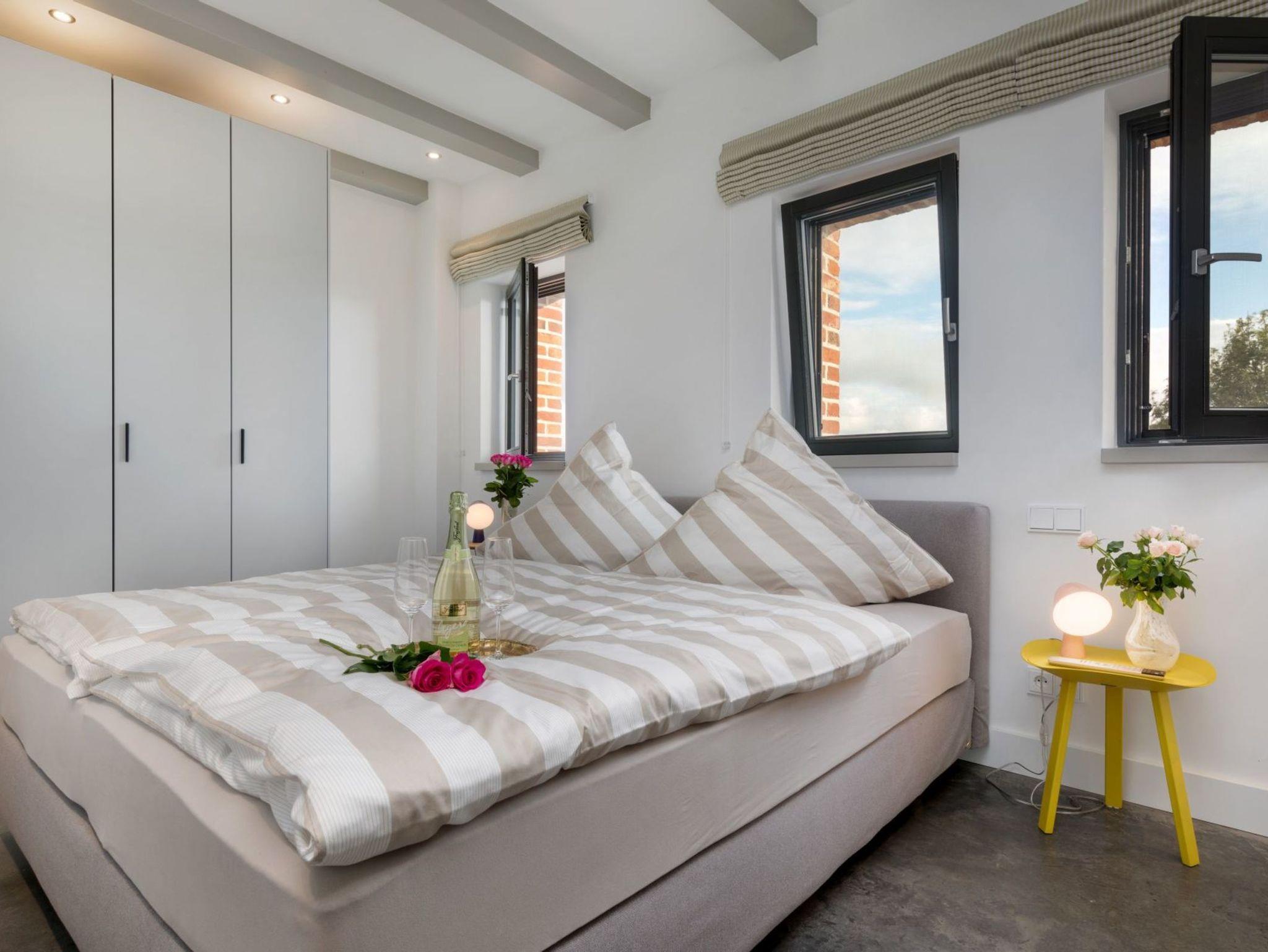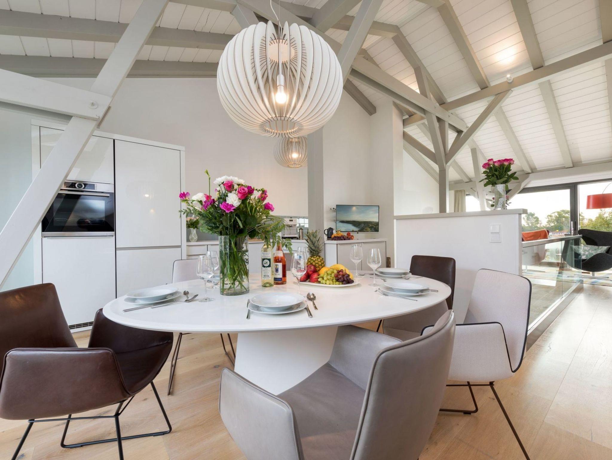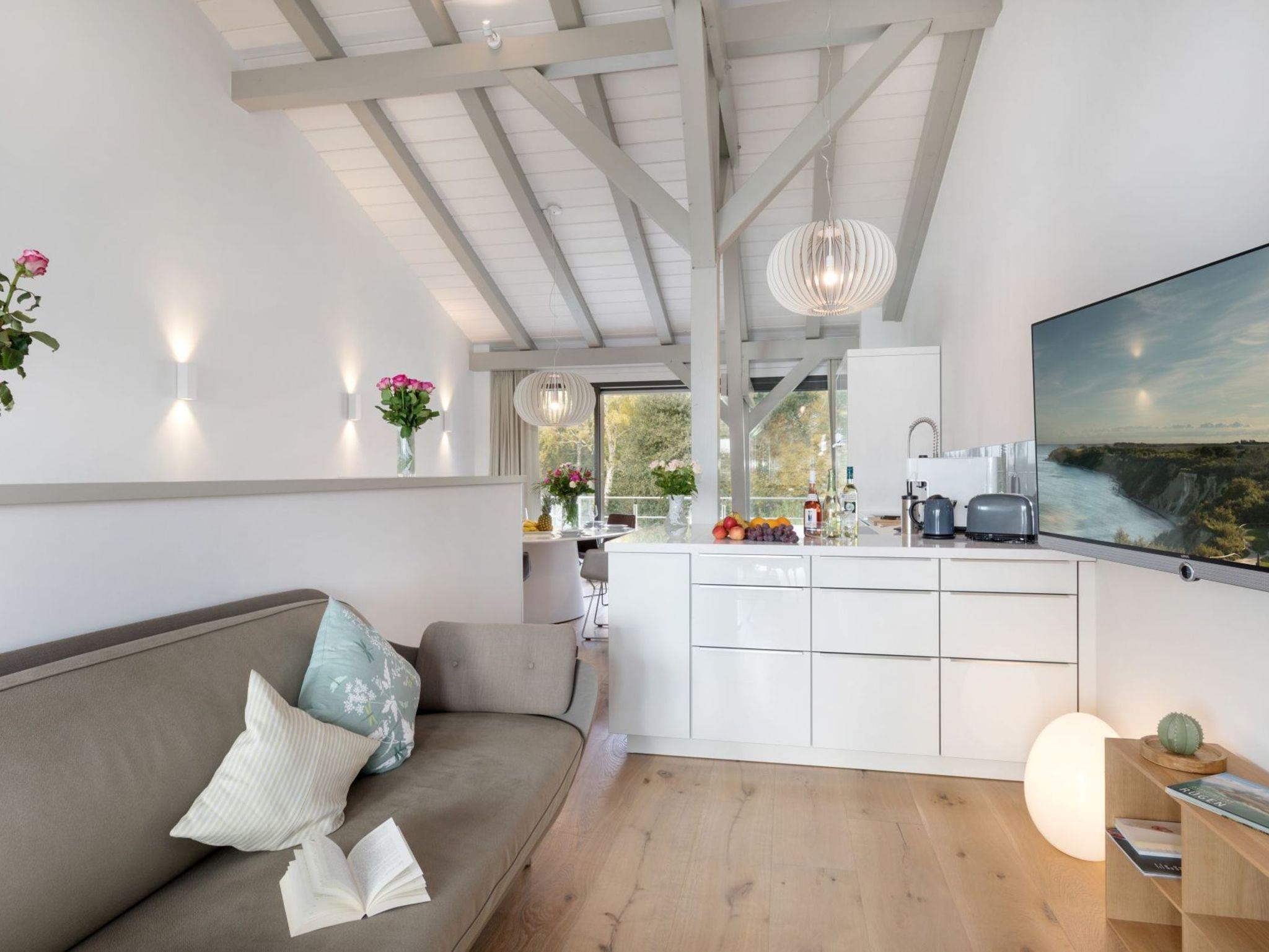 Vor allem aber hat die Aussicht vom Wohnzimmer aus ihren Reiz, denn dort kann man seinen Blick über den Ausläufer der Ostsee schweifen lassen. Der Balkon auf der Westseite lädt darüber hinaus dazu ein, die Sonnenstrahlen ganz entspannt zu genießen.