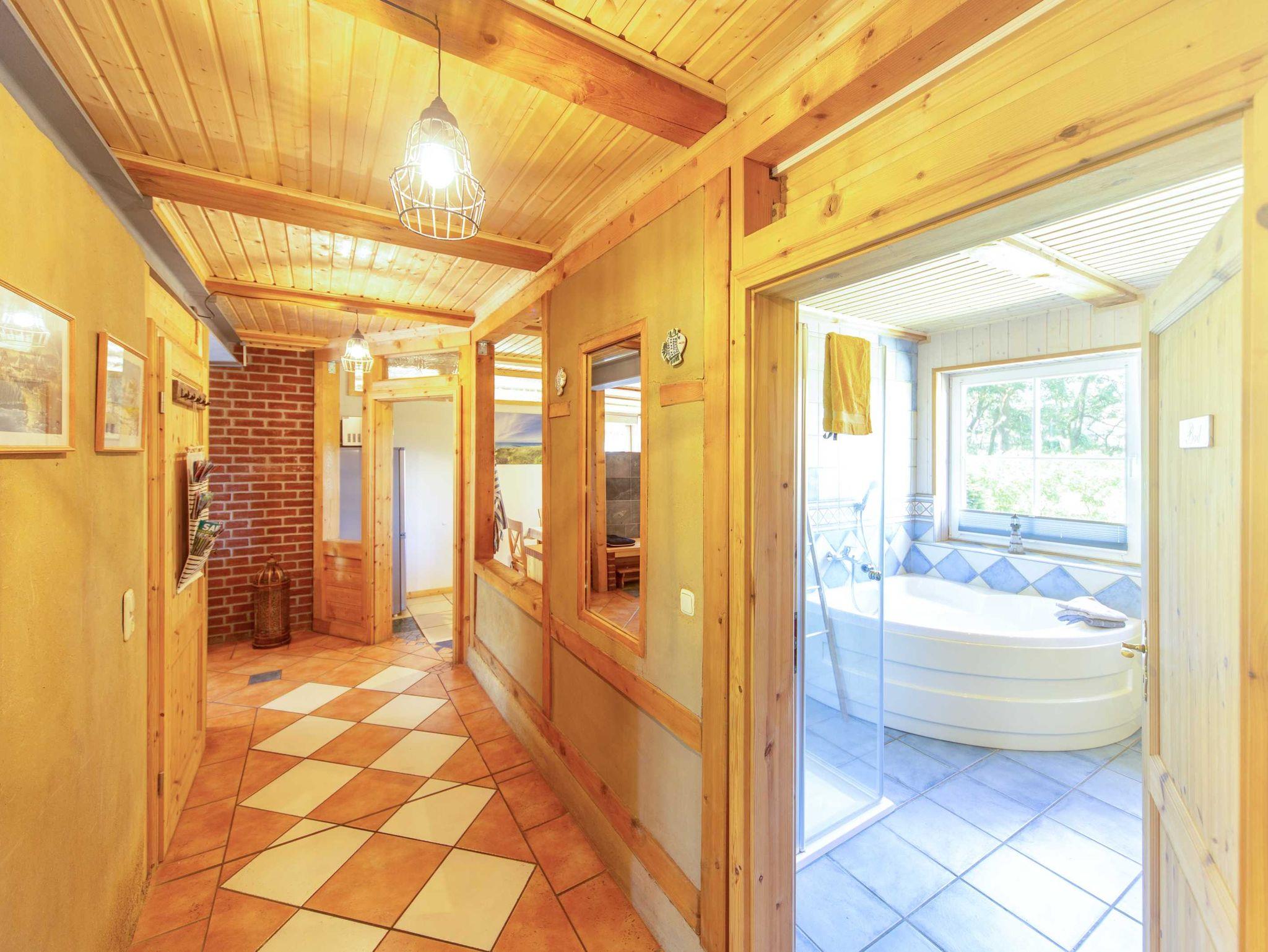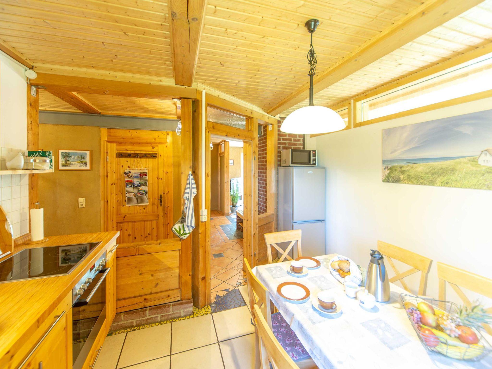 Die Ferienwohnung befindet sich im Erdgeschoss des Reetdachhauses. Das helle Wohnzimmer mit Kaminofen, Couch und TV besitzt auch einen Zugang zur Terrasse. Die beiden Schlafzimmer verfügen jeweils über ein Doppelbett (180x200, bzw. 160x200; beide mit getrennten Matratzen), Nachttisch, Leselicht und Radiowecker sowie diverse Verstaumöglichkeiten für Ihre Kleidung und Gepäck. Die Küche ist mit Kühlschrank, E-Herd, Geschirrspüler, Wasserkocher, Toaster, Kaffeemaschine und weiteren nützlichen Küchenhelfern ausgestattet. Im Badezimmer befinden sich eine Eckbadewanne, Dusche, WC und ein Fön. Eine Aufbettung mit einem Klappbett (90x200) ist im Wohnzimmer möglich.