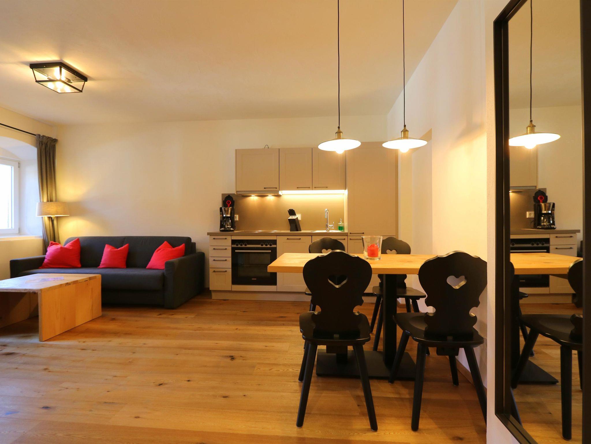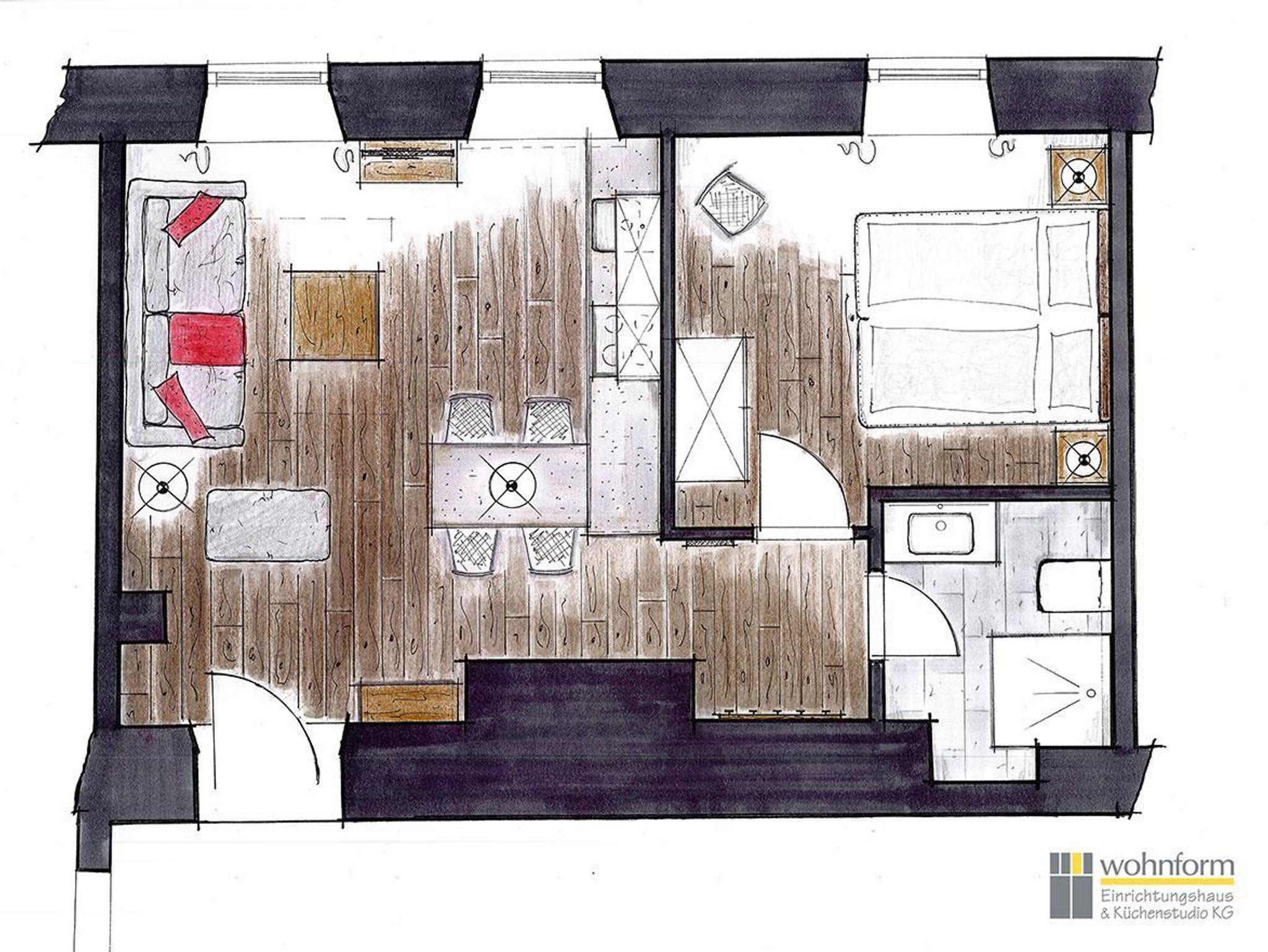Diese Ferienwohnung für 2-4 Personen verfügt über ein zentral in der Wohnung gelegenen Wohnbereich mit integrierter Küche mit Essbereich und einem separaten Schlafzimmer. Sie verfügt über eine Küche mit Kühlschrank, Spülmaschine, Ceran-Herd, Wasserkocher, Toaster und Kaffeemaschine sowie ein Bad mit Dusche und WC.