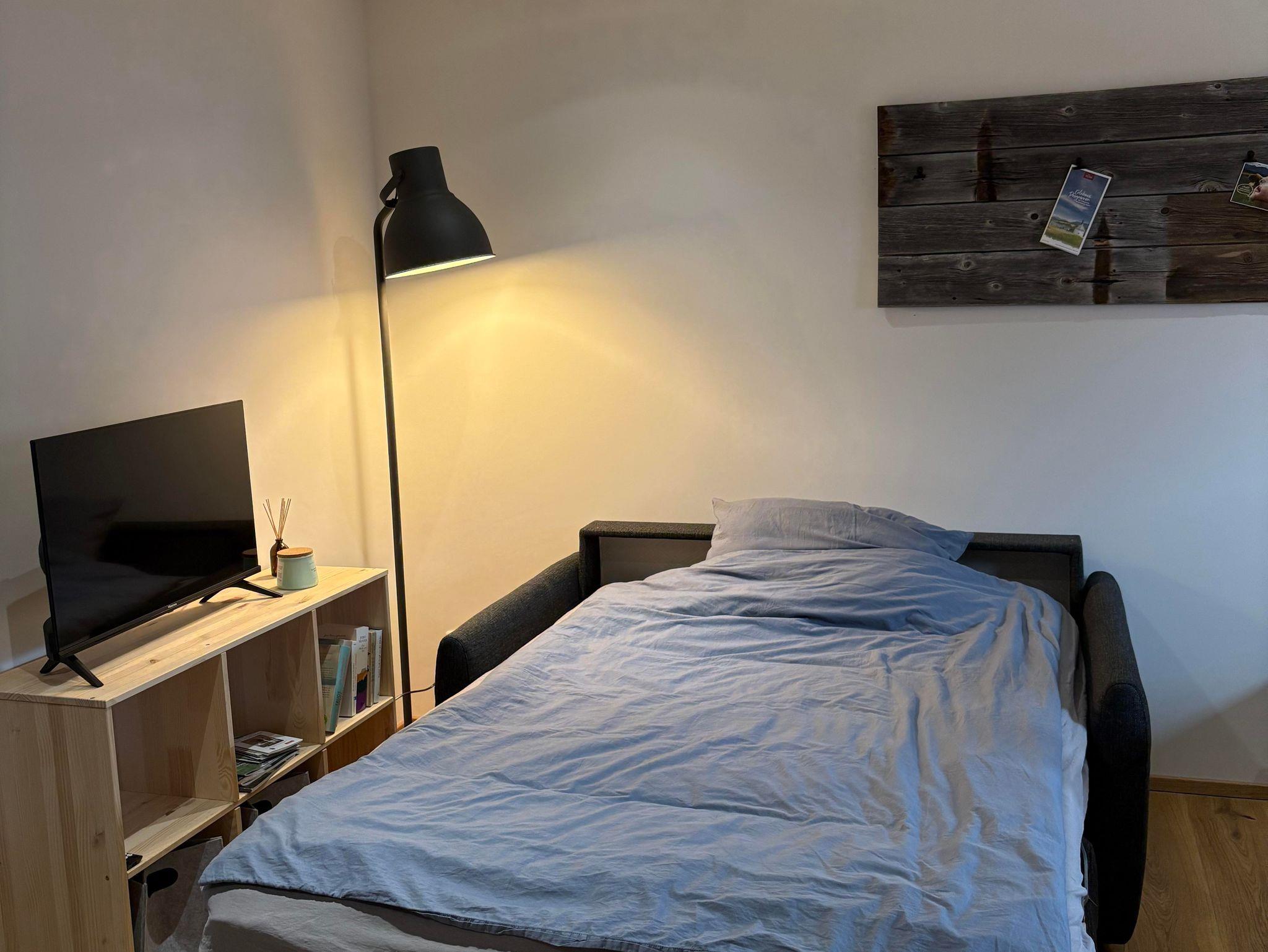 Ebenfalls dort befindet sich das Ausziehsofa mit Lattenrost und Matratze für die dritte Person oder für zwei Kinder (125 cm breit). Ein Fernseher steht bereit, allerdings werden die privaten Fernsehsender nicht empfangen.