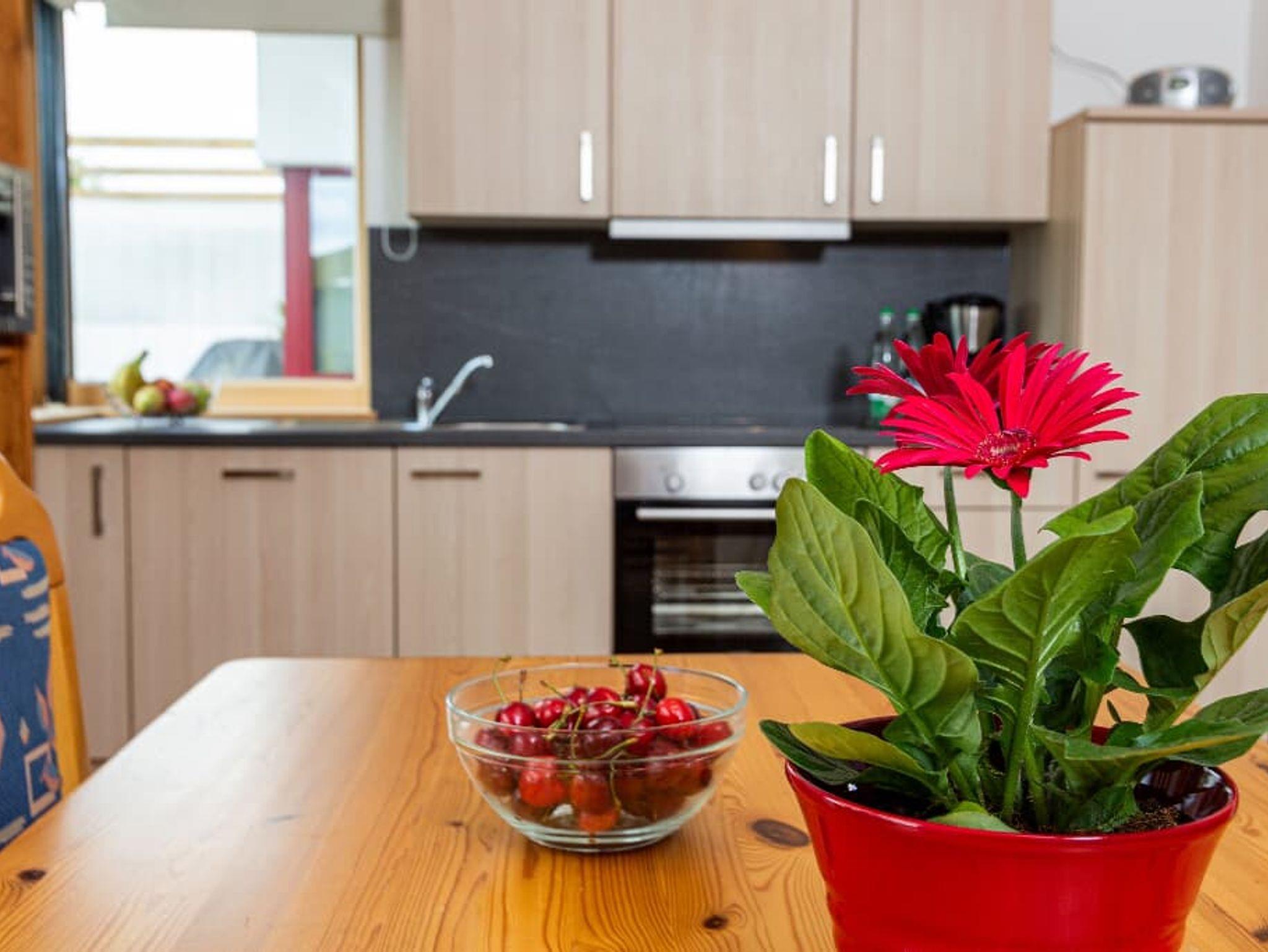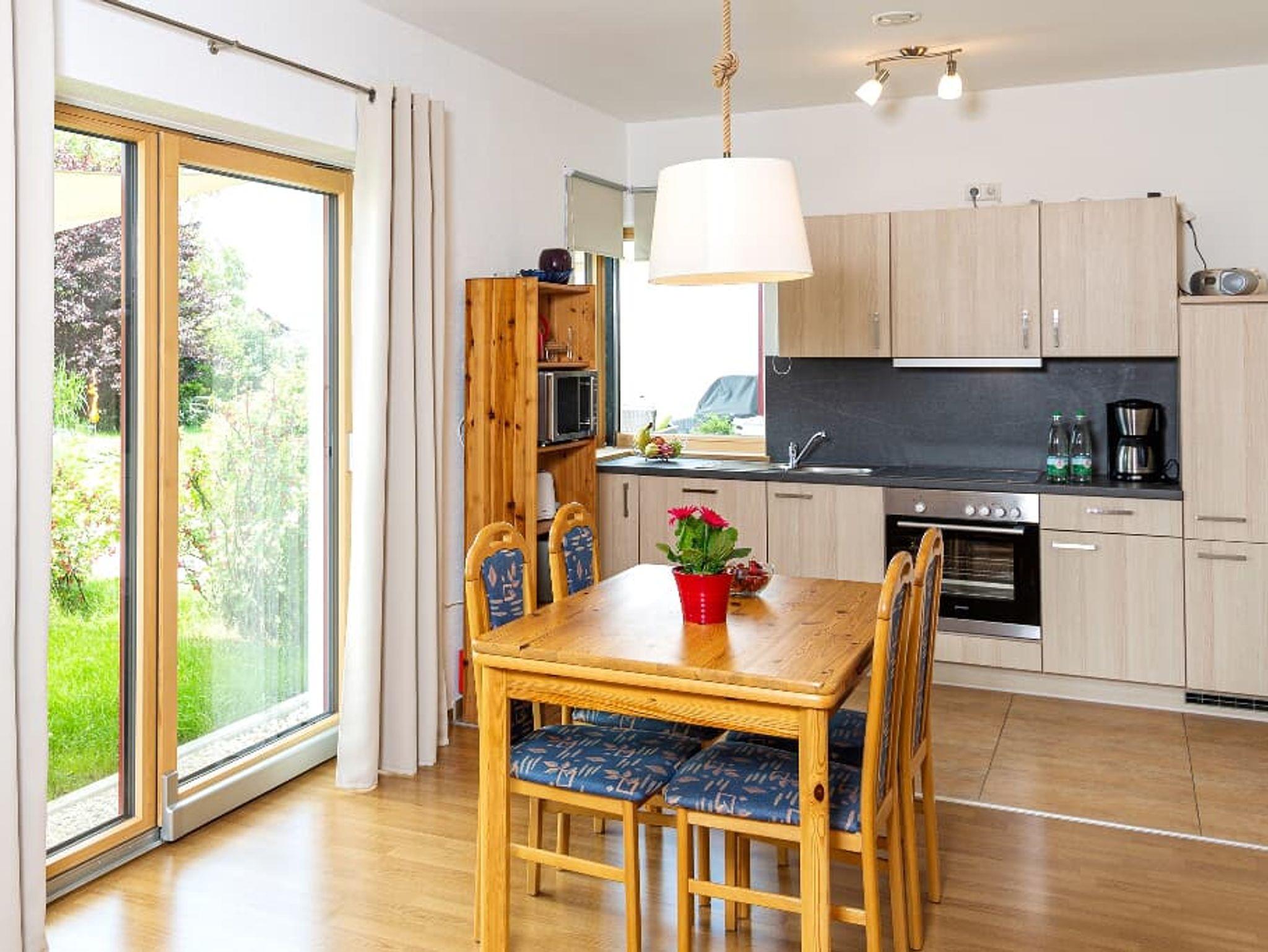 Die Ferienwohnung (60qm) befindet sich im Erdgeschoss und ist geeignet für bis zu 4 Personen. In der Wohnküche finden Sie eine gemütliche Schlafcouch mit Couchtisch, LED-TV, einen Esstisch und eine voll ausgestattete Küchenzeile mit Einbaubackofen, Cerankochfeld, Microwellenherd, Geschirrspülmaschine, Kühlschrank mit Gefrierfach, Kaffeemaschine, Wasserkocher, Toaster, Mixer, Pfannen, Töpfe & Geschirr. Ein Kinderstuhl steht auf Anfrage zur Verfügung. Das Schlafzimmer verfügt über ein Doppelbett (1,60 m x 2,00 m) und ein Etagenbett für 2 Personen (je 0,80 m x 2,00 m). Das Badezimmer mit Dusche (1x1m, stufenlos begehbar), WC, Haartrockner und Waschmaschine rundet das Gesamtbild ab. Bettwäsche und Handtücher, kostenloses WLAN und ein Parkplatz stehen kostenfrei zur Verfügung. Es gibt eine Abstellkammer mit Staubsauger, Wischmop, Besen, Bügelbrett und Bügeleisen. Von der Wohnung haben Sie Zugang zum Garten mit Gartenstühlen und Tisch. Gerne können Sie gemütliche Grillabende verbringen.