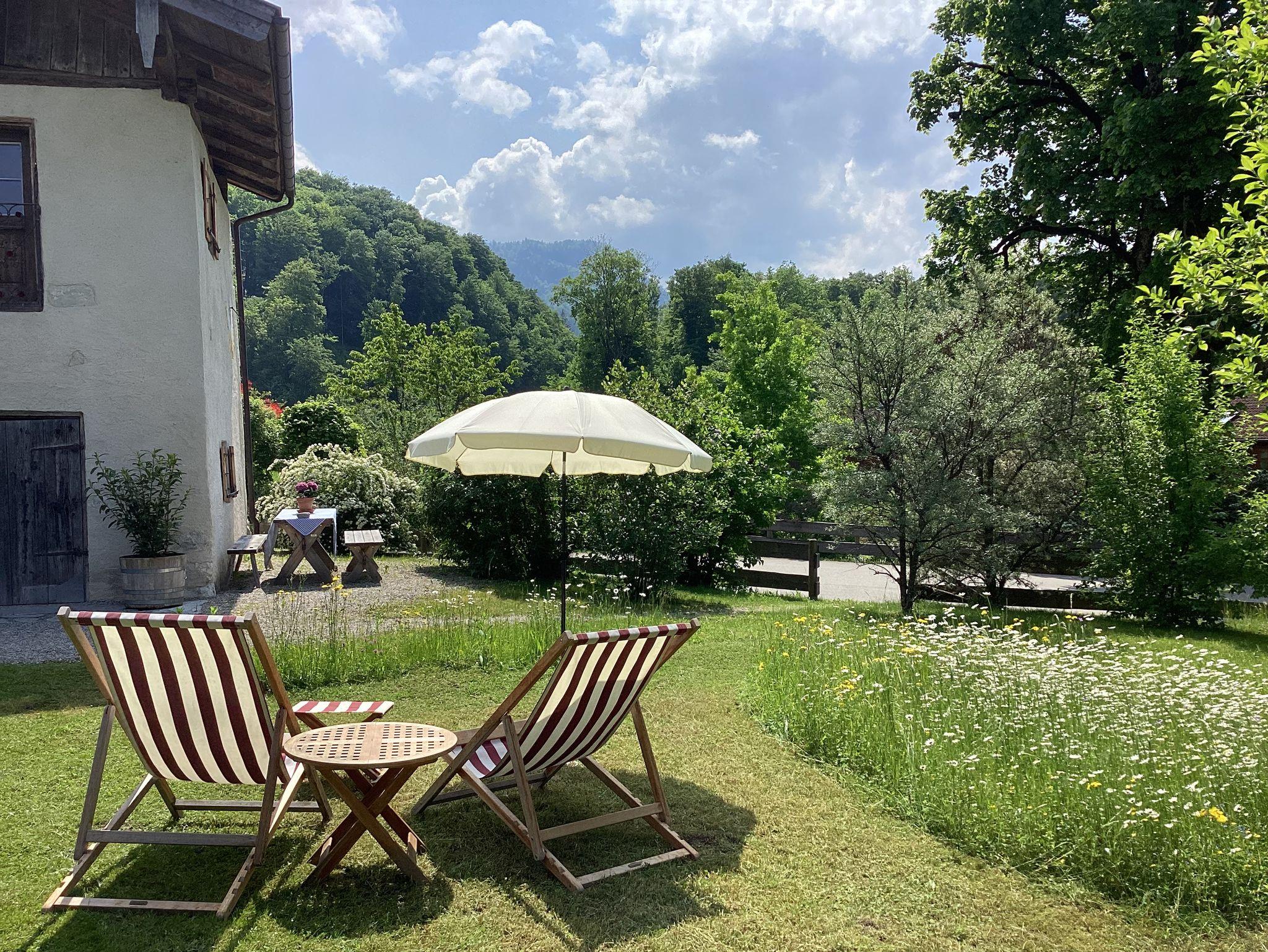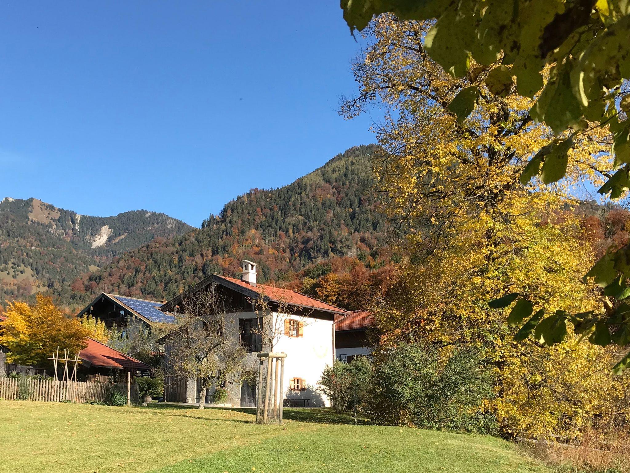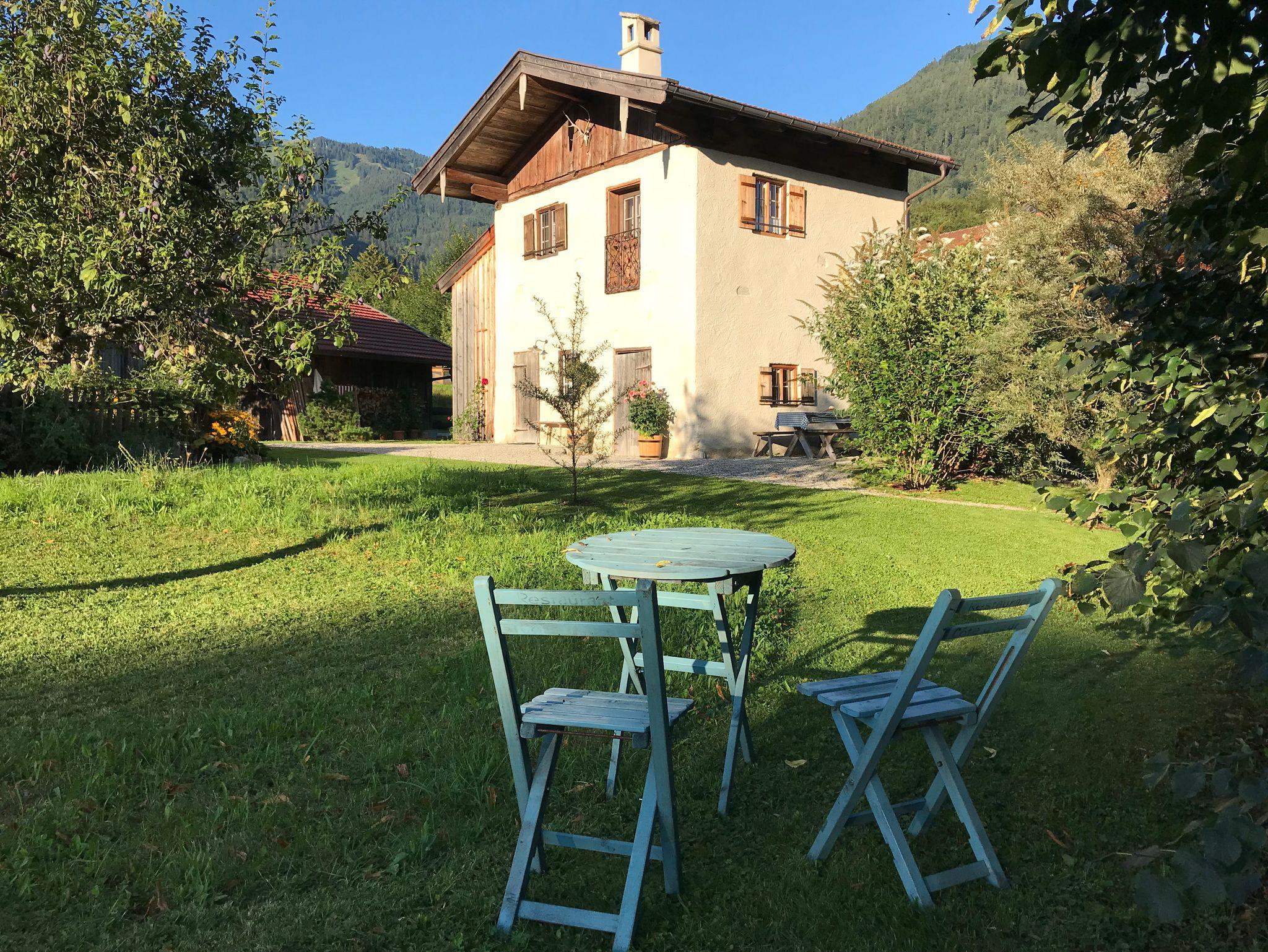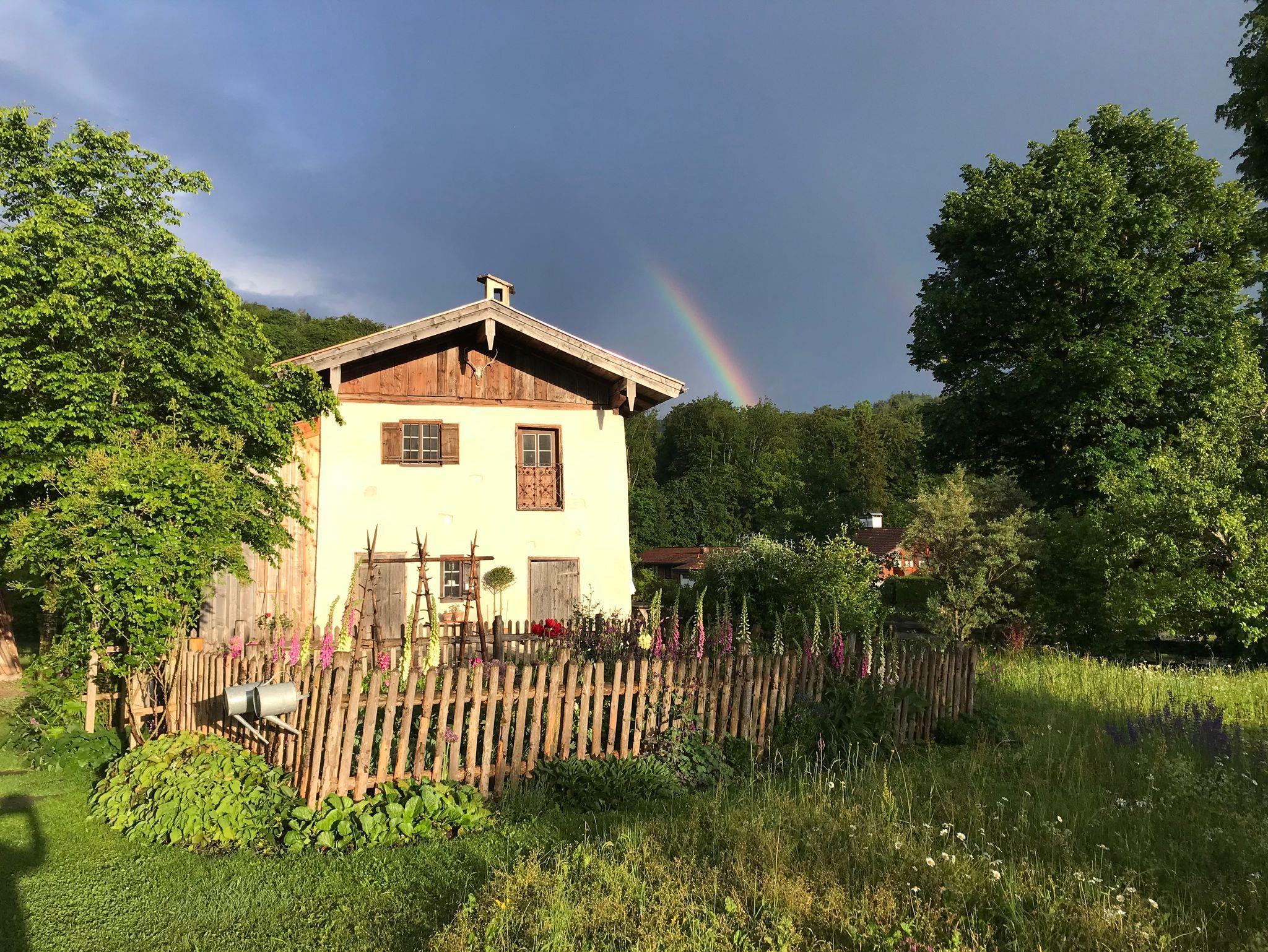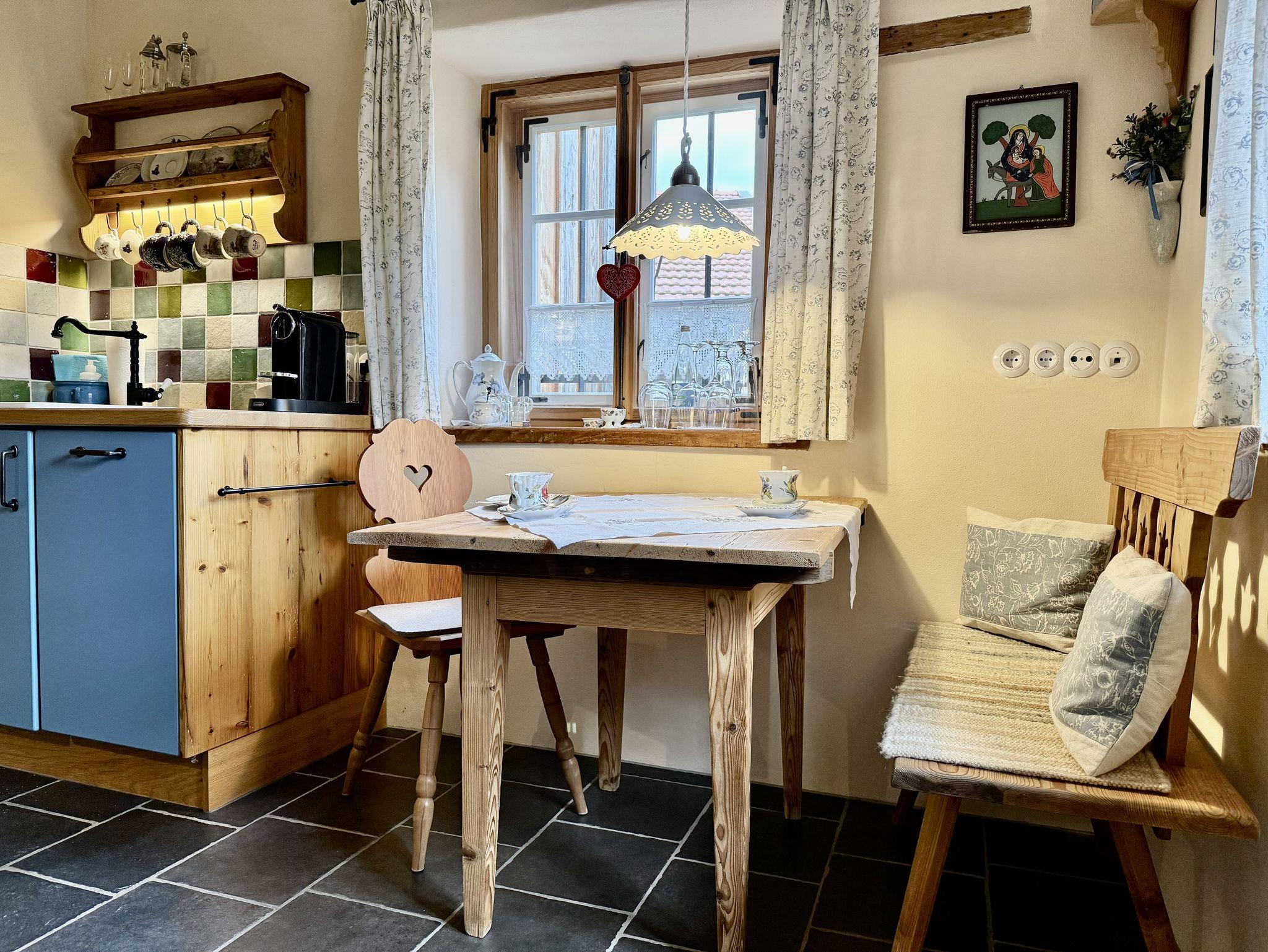 Für Gäste, die das Besondere zu schätzen verstehen: ein denkmalgeschütztes Zuhäusl auf einem uralten Bauernanwesen mit Blick über den Bauerngarten und die weitläufige Streuobstwiese auf die umliegenden Berge. Historische Bausubstanz, die kürzlich aufwändig restauriert und mit allem modernen Komfort versehen wurde, bildet den Rahmen für stilvoll und dabei funktionsorientiert eingerichtete Räume: im Erdgeschoß ein kleiner Eingangsflur und die Wohnküche, dazu ein neu angebautes Bad mit Wanne; über eine steile historische Kastentreppe gelangt man ins Obergeschoß mit Wohnraum sowie einem Schlafzimmer mit Doppelbett 180x200 cm. Handgemachte Fliesen, hochwertige Textilien, schreinergefertigte Einbaumöbel, bäuerliche Antiquitäten, Daunenbetten, Battistwäsche, edles weißes Frottee ergänzen das Ensemble. Fußbodenheizung, freies WLAN, Bose-Lautsprecher. Dazu alle Serviceangebote unserer Lohei-Anlage vom absperrbaren Fahrradraum, dem Hofladen, dem Waschmaschinenraum und dem Carport bis zum Grillplatz.
