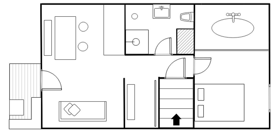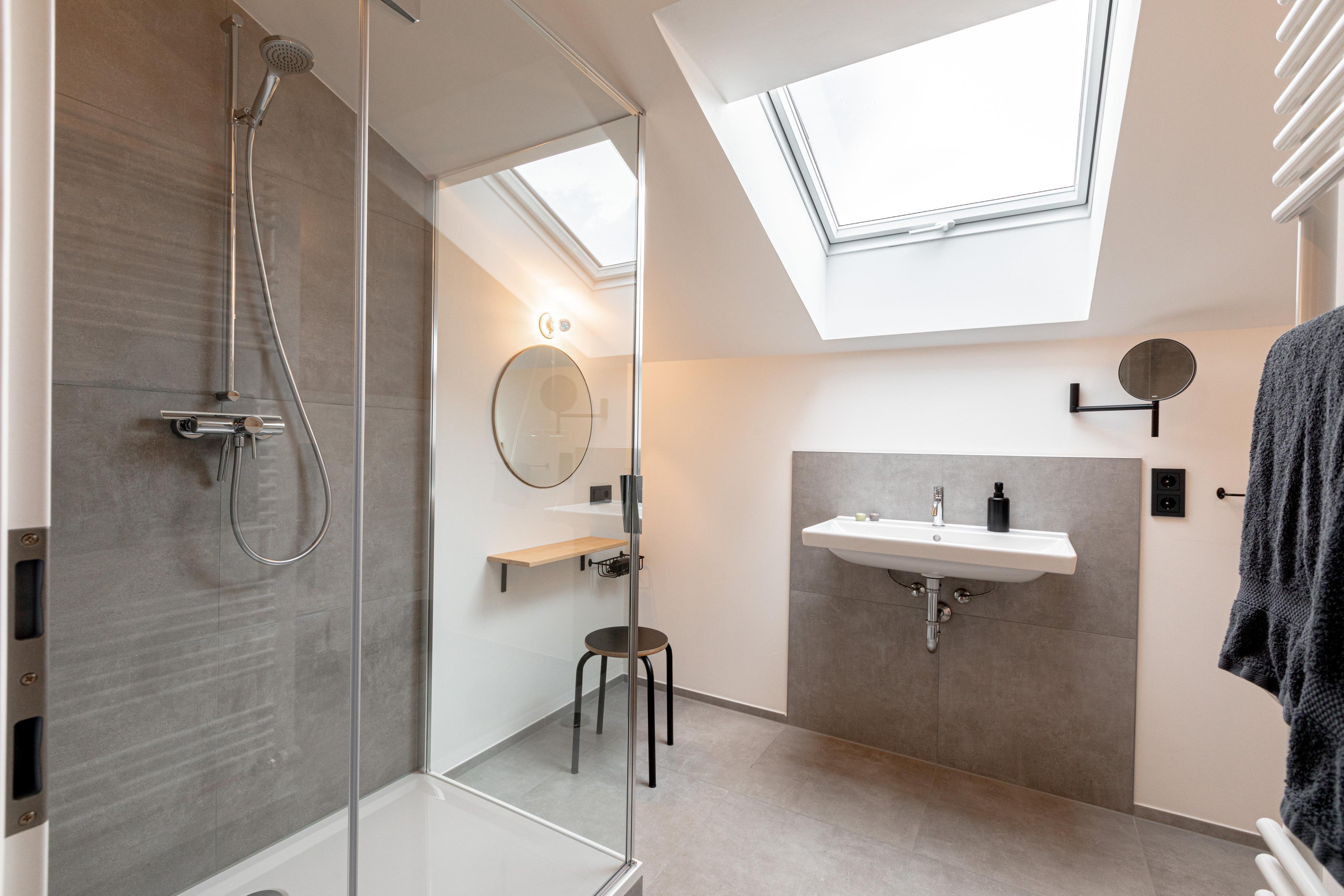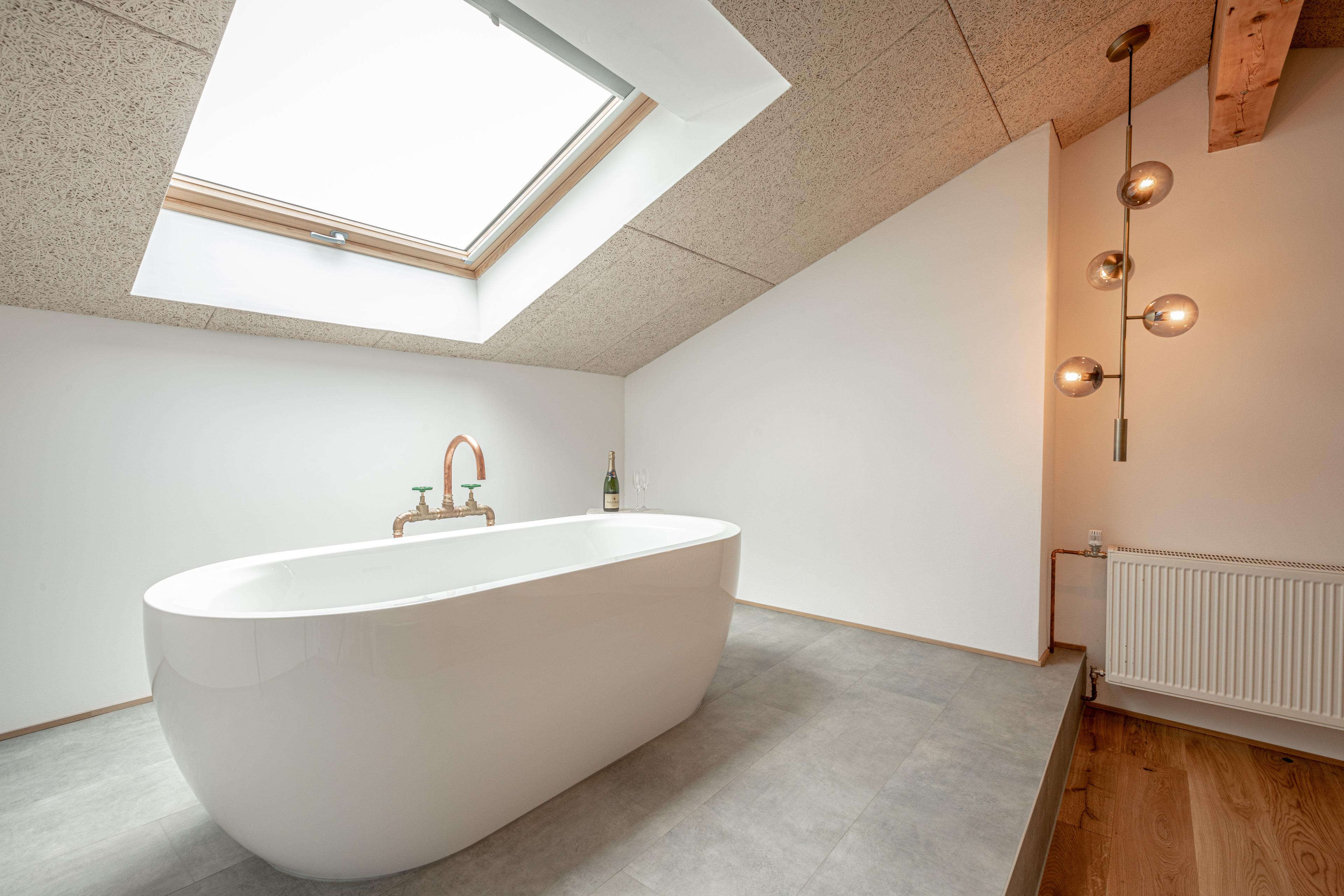 Das Schlafzimmer ist mit einem komfortablen Doppelbett (1,60 x 2,00 m) ausgestattet und überrascht mit einer freistehenden Badewanne für entspannte Momente. Das angrenzende Badezimmer verfügt über eine großzügige Regendusche, einen Schminktisch und WC.