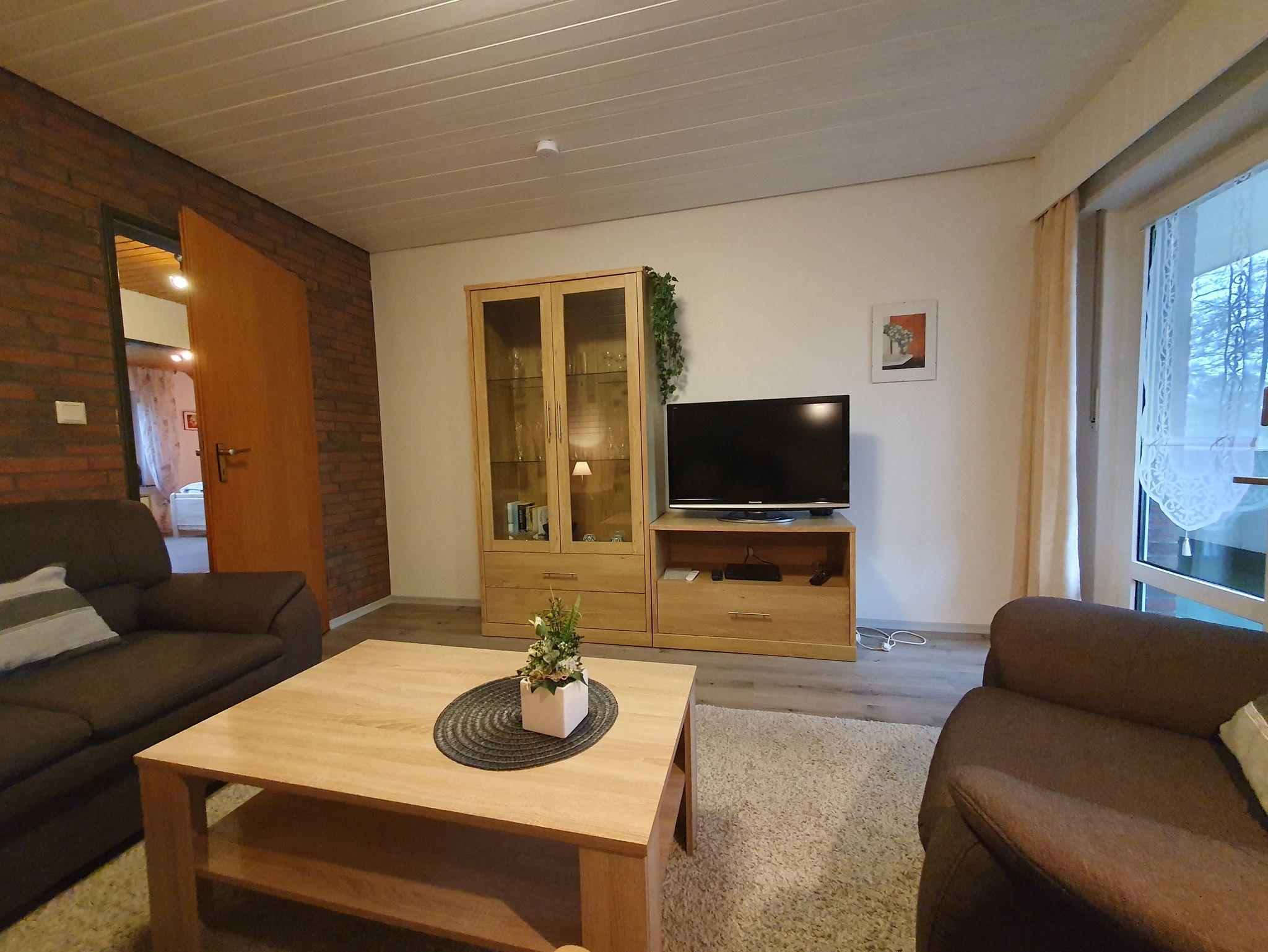 Sehr schöne Ferienwohnung mit zwei Schlafzimmern. Gemütliches Wohnzimmer mit Balkonzugang und Blick auf die typisch ostfriesische Landschaft mit Wallhecken, Wiesen und Wäldern.