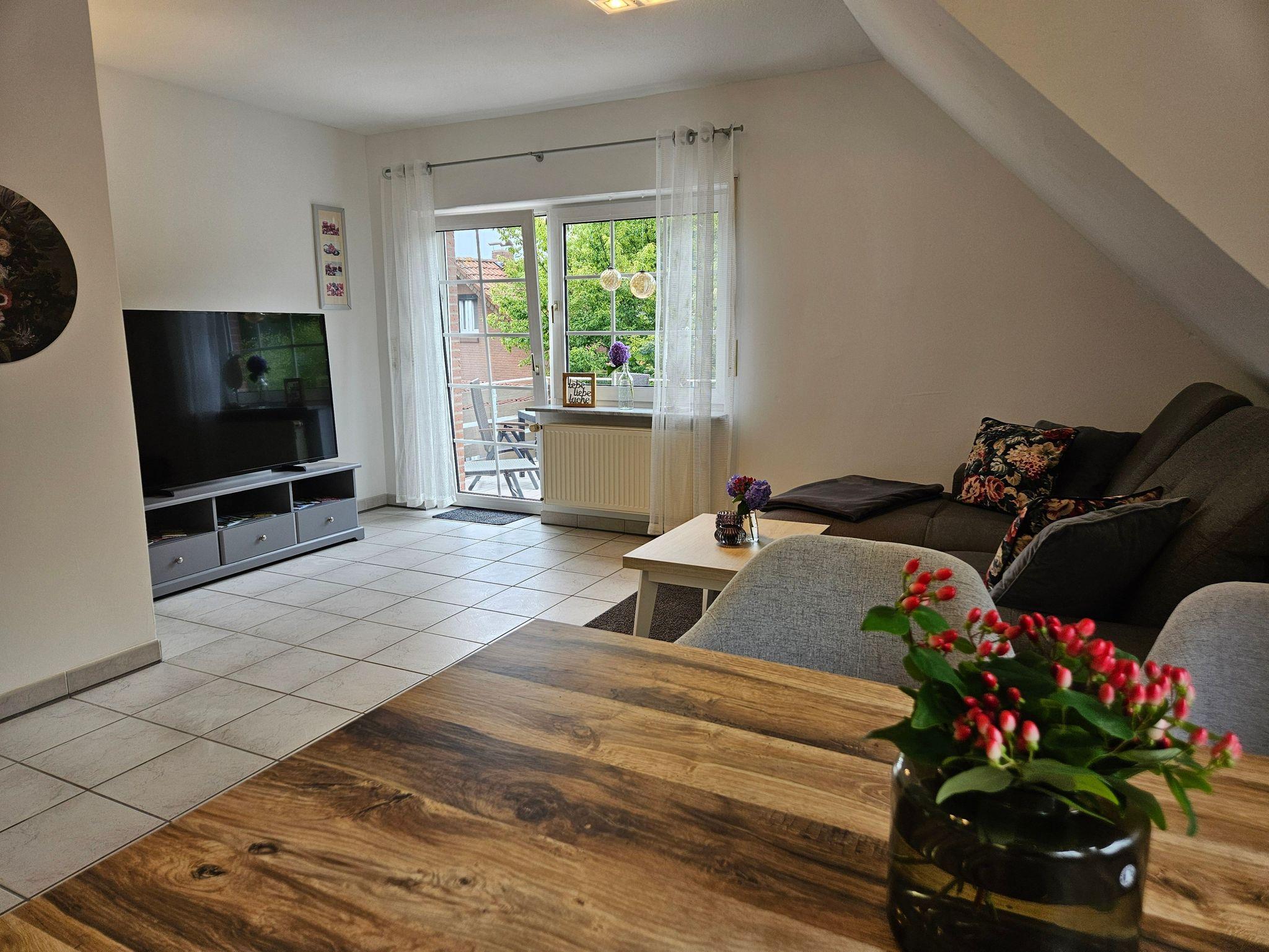 Die Wohnung verfügt über ein separates Schlafzimmer mit einem gemütlichen Doppelbett sowie einen großzügigen Wohn- und Schlafraum, der mit einem bequemen Schlafsofa ausgestattet ist ? perfekt als zusätzliche Schlafmöglichkeit. Der angrenzende offene Küchenbereich ist komplett ausgestattet und bietet alles, was man für einen entspannten Aufenthalt braucht: Backofen, Kühlschrank mit Gefrierfach, Mikrowelle, Spülmaschine, Kaffeemaschine, Wasserkocher und weiteres Kochzubehör.