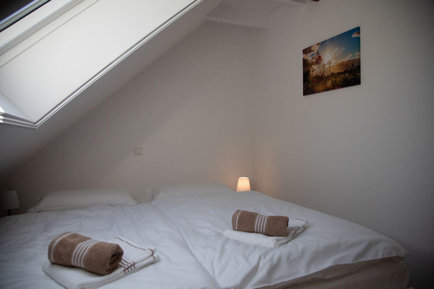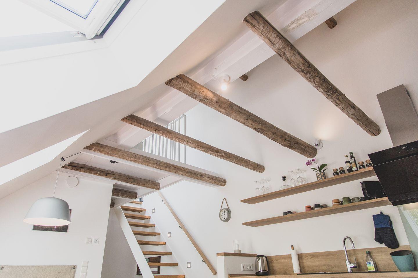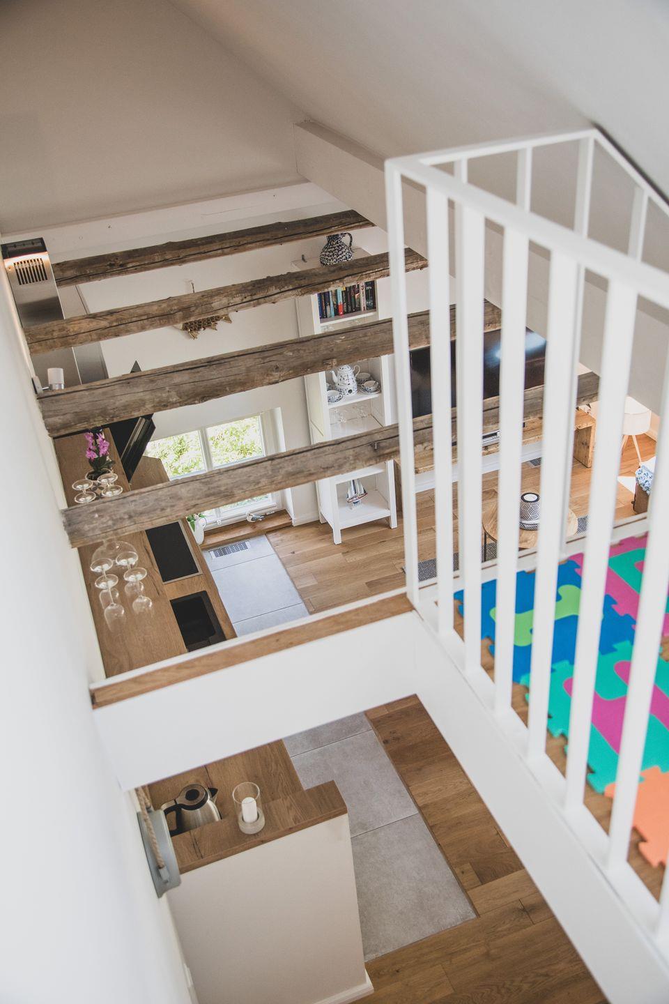 Mit einer Größe von 56 m² findet hier bequem Platz für bis zu vier Personen. Die Ferienwohnung im zweiten OG verfügt über zwei geschmackvoll eingerichtete Schlafzimmer mit hochwertige Parkettböden, die für eine warme Atmosphäre sorgen. In dem lichtdurchfluteten Wohnzimmer lädt eine gemütliche Sofaecke zum Entspannen ein, während ein Essbereich, der ausreichend Platz für gesellige Mahlzeiten bietet, dazu einlädt, die Zeit gemeinsam zu genießen. Die moderne Küche ist voll ausgestattet mit allen Annehmlichkeiten, die Sie benötigen: Ein Kühlschrank, Herd, Backofen und sogar eine Spülmaschine stehen Ihnen zur Verfügung. Genießen Sie Ihren Kaffee aus der bereitgestellten Kaffeemaschine auf dem "Balkon" oder der Terrasse im Garten.