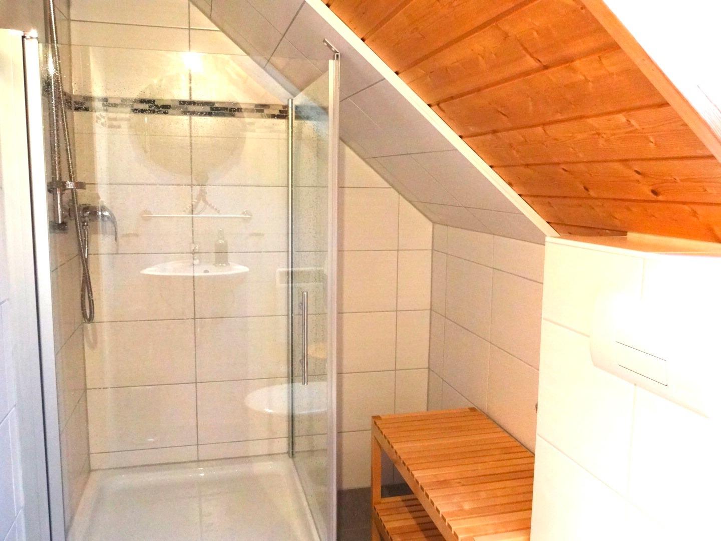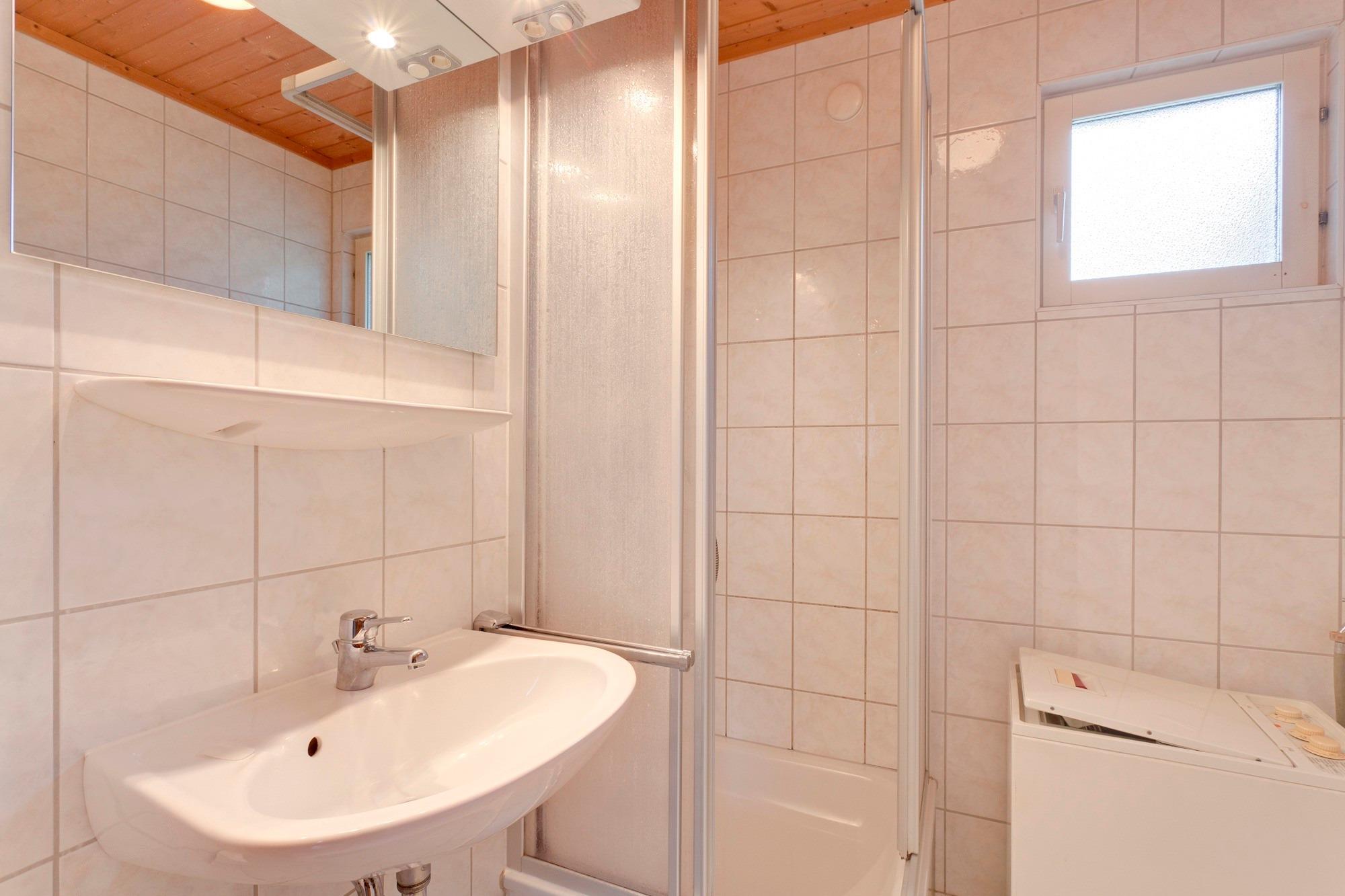 Im Badezimmer im Erdgeschoss befinden sich ein WC mit Dusche, Waschbecken, sowie die Waschmaschine zur Verfügung. Im Obergeschoss ist eine weiteres Waschbecken und WC.