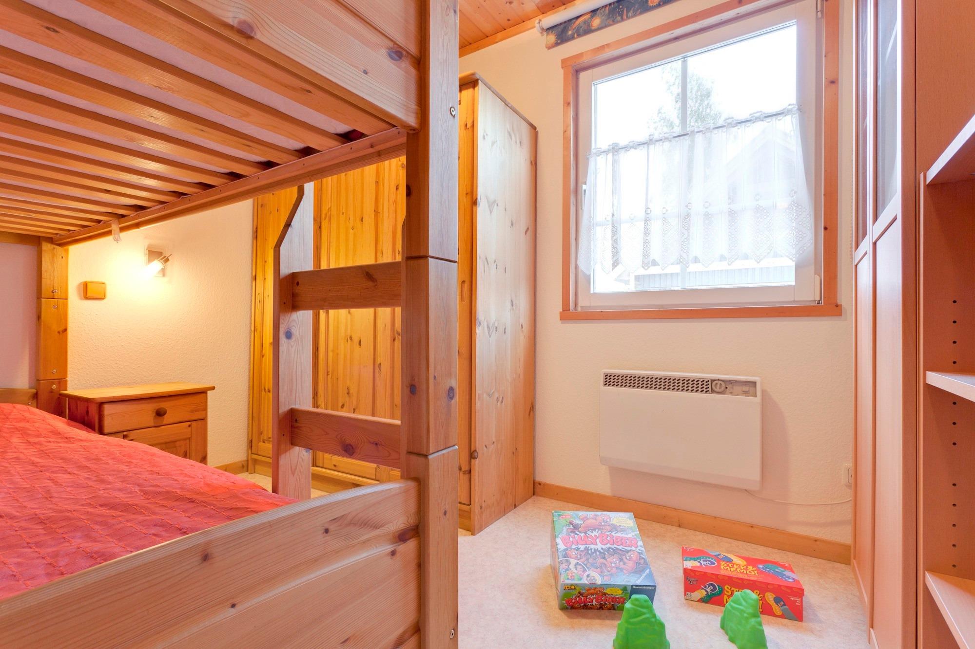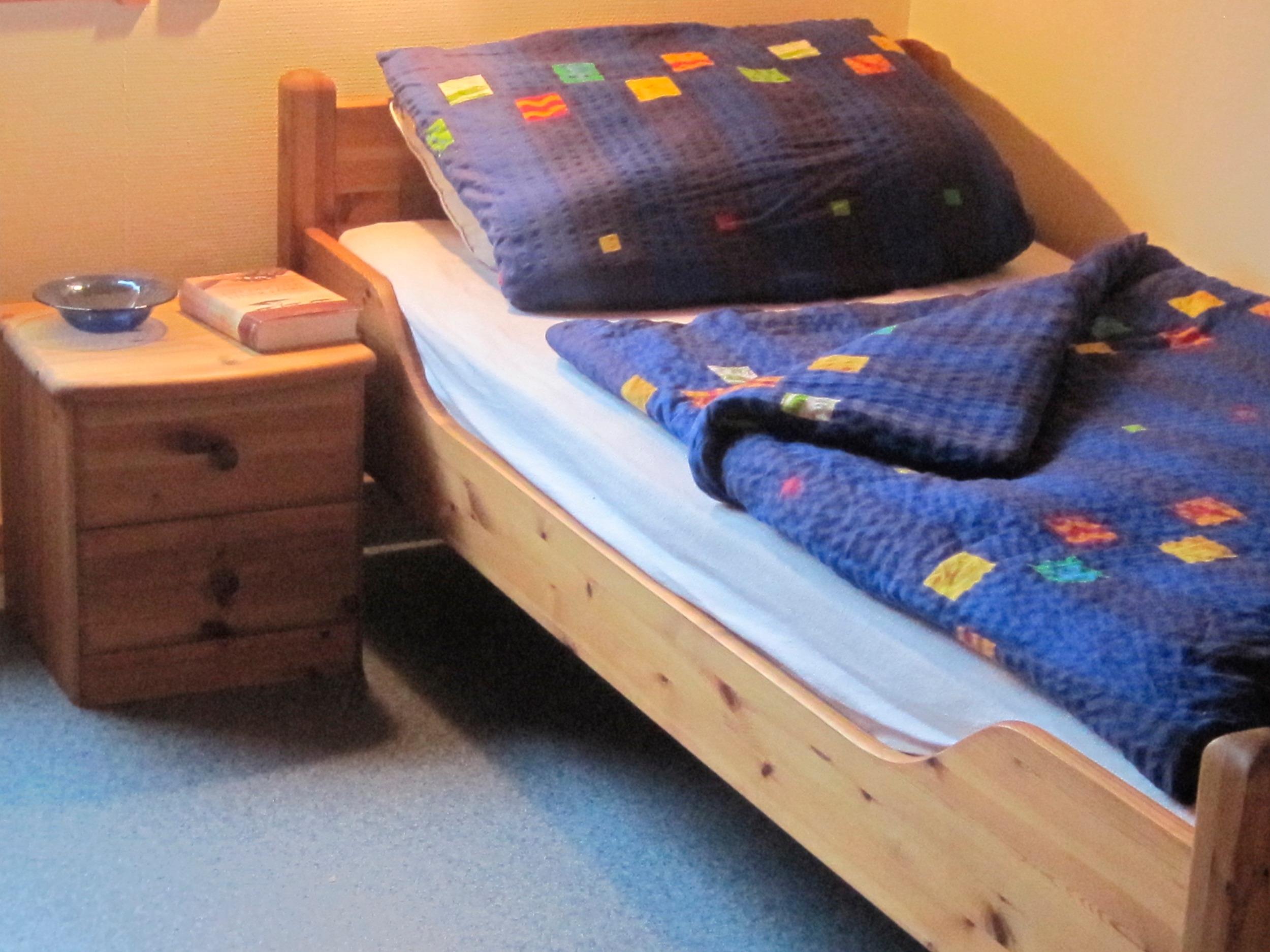 Im zweiten Schlafzimmer im Erdgeschoß steht ein massives, stabiles Etagenbett. Nachtschrank und Kommoden bieten Platz zum Verstauen. Hier steht auch das massive Holz-Kinderbett.