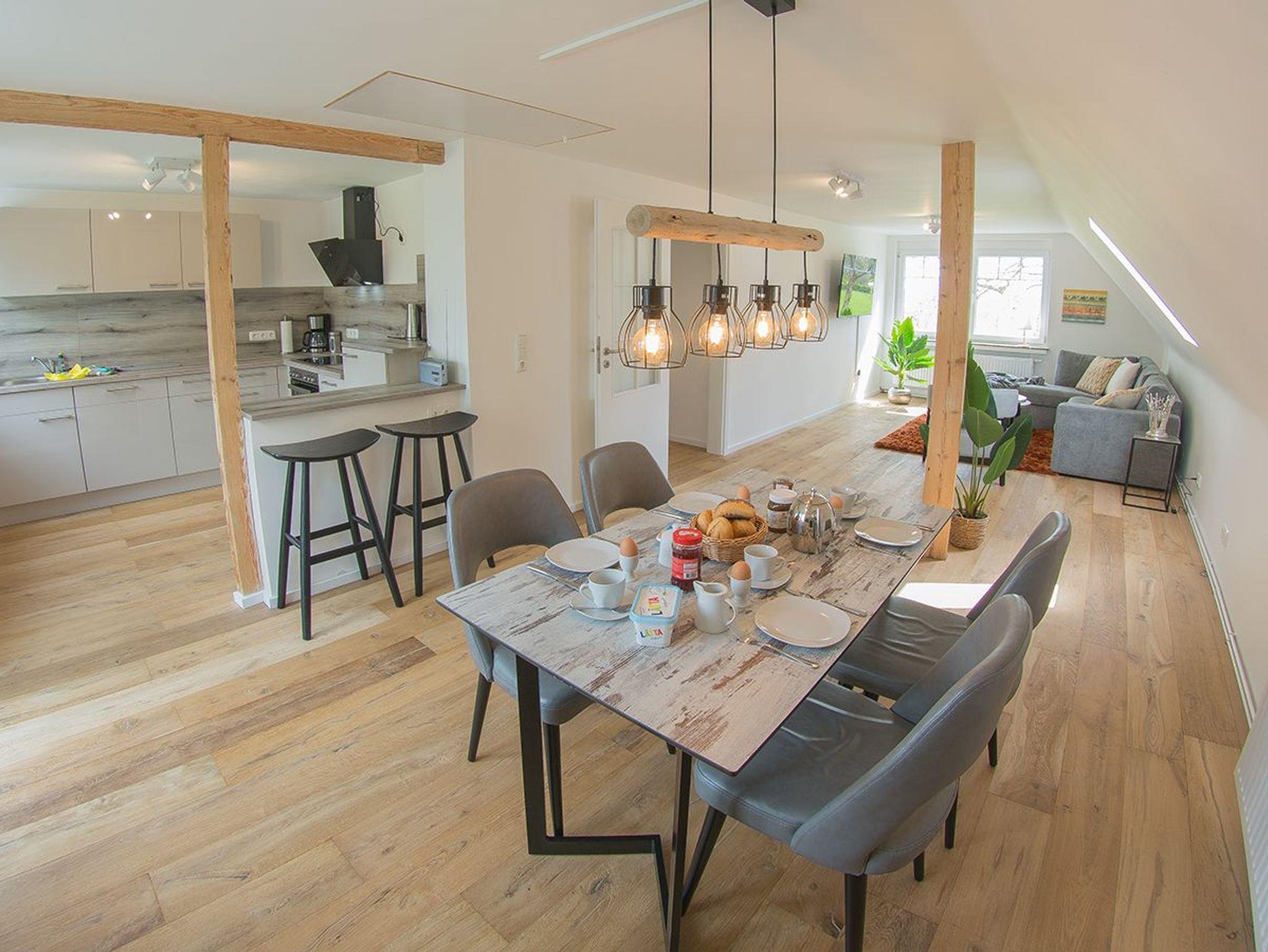 Willkommen in unserer Ferienwohnung Fresenhuus 2 im ersten OG links, Teil der Ferienwohnanlage achtteihn in der Oldeoogstraße. Sie surfen mit Highspeed-Internet; im gesamten Objekt wurde Echtholz-Eichenparkett verlegt Das Bad ist ausgestattet mit Fußbodenheizung und ebenerdiger Walk-In-Regendusche. Hier urlauben bis zu drei Personen und Kleinkind in frischer friesischer Luft. Ein langer heller Flur führt zunächst direkt links in das Schlafzimmer mit Einzelbett und dahinter zum Schlafzimmer mit Doppelbett. Beide Schlafräume sind mit einer Tür verbunden. Ab Diele geht es auch ins moderne Duschbad. Sie gelangen weiter zum großen Raum für die Bereiche Wohnen/Kochen/Essen. Rechts die offene Küche mit vorgelagertem Essplatz und weitere 2 Sitzgelegenheiten an einer Küchentheke direkt vor dem Balkonausgang. Links das bequeme Ottomanen-Sofa mit Schlaffunktion. Der große Balkon bietet einen schönen Rundumblick auf achtteihn, Felder und Wiesen.