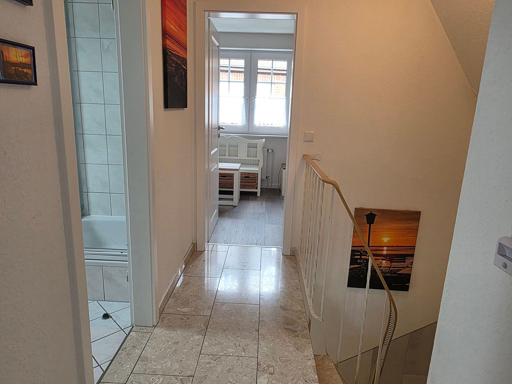 Im ersten Obergeschoß befinden sich ein Schlafzimmer mit Doppelbett und ein Schlafzimmer mit zwei getrennt stehenden Betten sowie das Badezimmer mit Dusche.