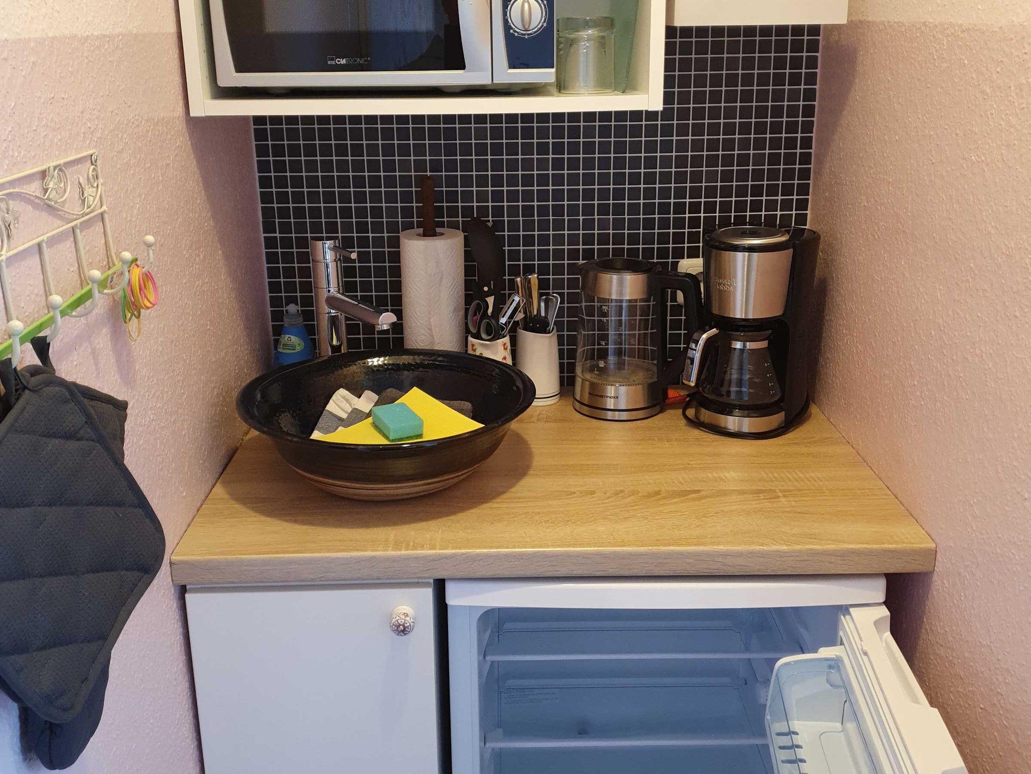 Unser kleines aber feines Appartement Deichblick im Dachgeschoss (1. Stock) des Haupthauses verfügt über eine Miniküche, die mit Mikrowelle, Kühlschrank, Wasserkocher und Kaffeemaschine ausgestattet ist (KEIN Herd/Ofen!).