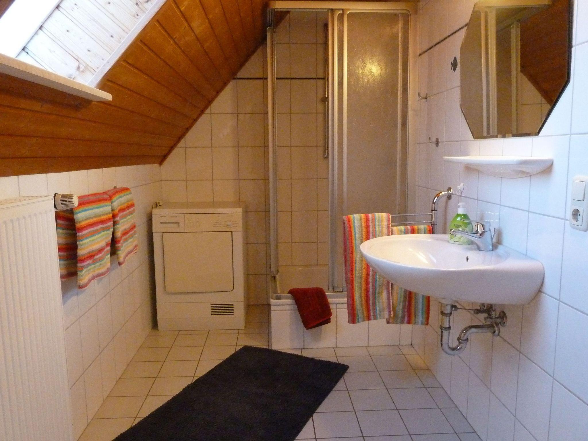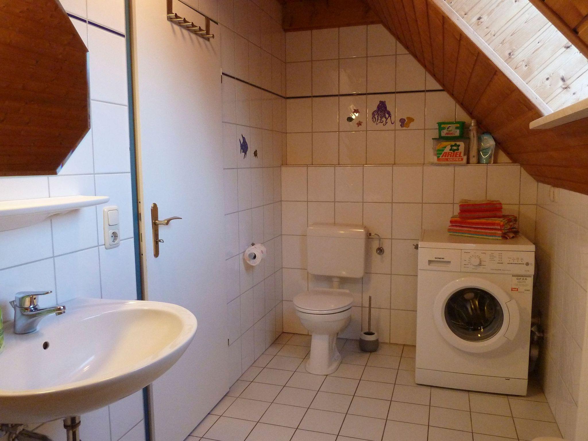 helles Bad mit Tageslicht mit Waschmaschine und Wäschetrockner