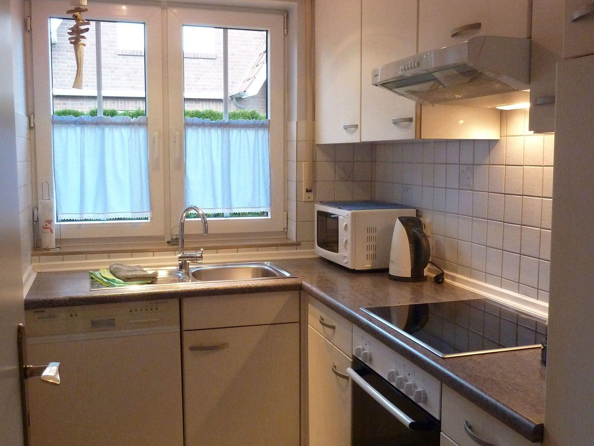 Küche mit Spülmaschine, Kühlschrank, Backofen, Ceran-Kochfeld, Toaster, Kaffeemaschine...