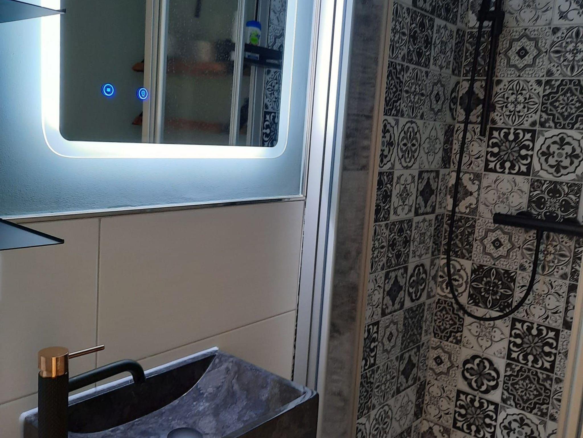 Vom Eingangsbereich gleich rechts gehalten geht es in das schicke Duschbad mit WC. Die moderne Dusche, eine Handtuchheizung sowie der beleuchtete und beheizbare Spiegel über dem Waschbecken bieten aller höchsten Komfort.