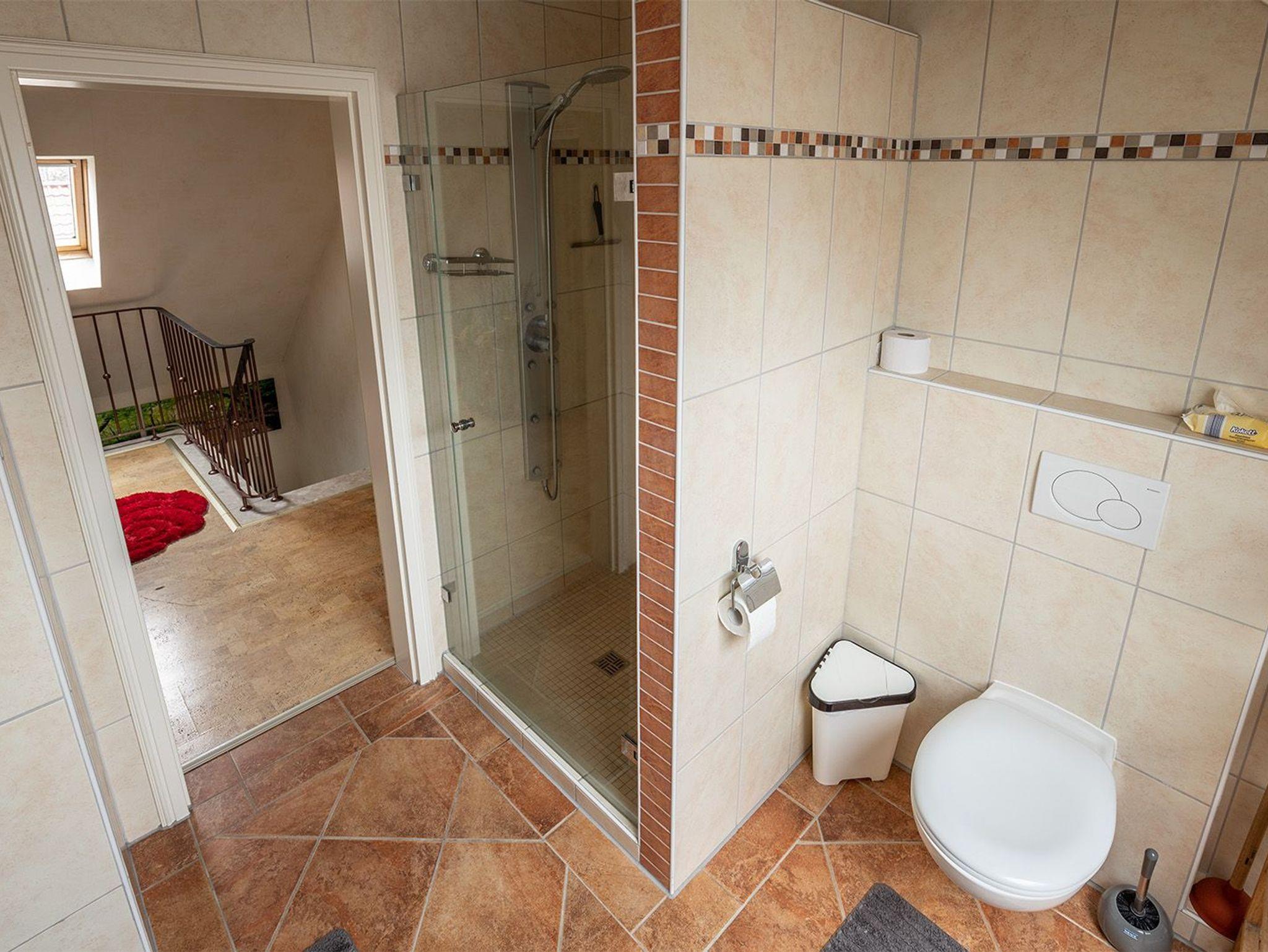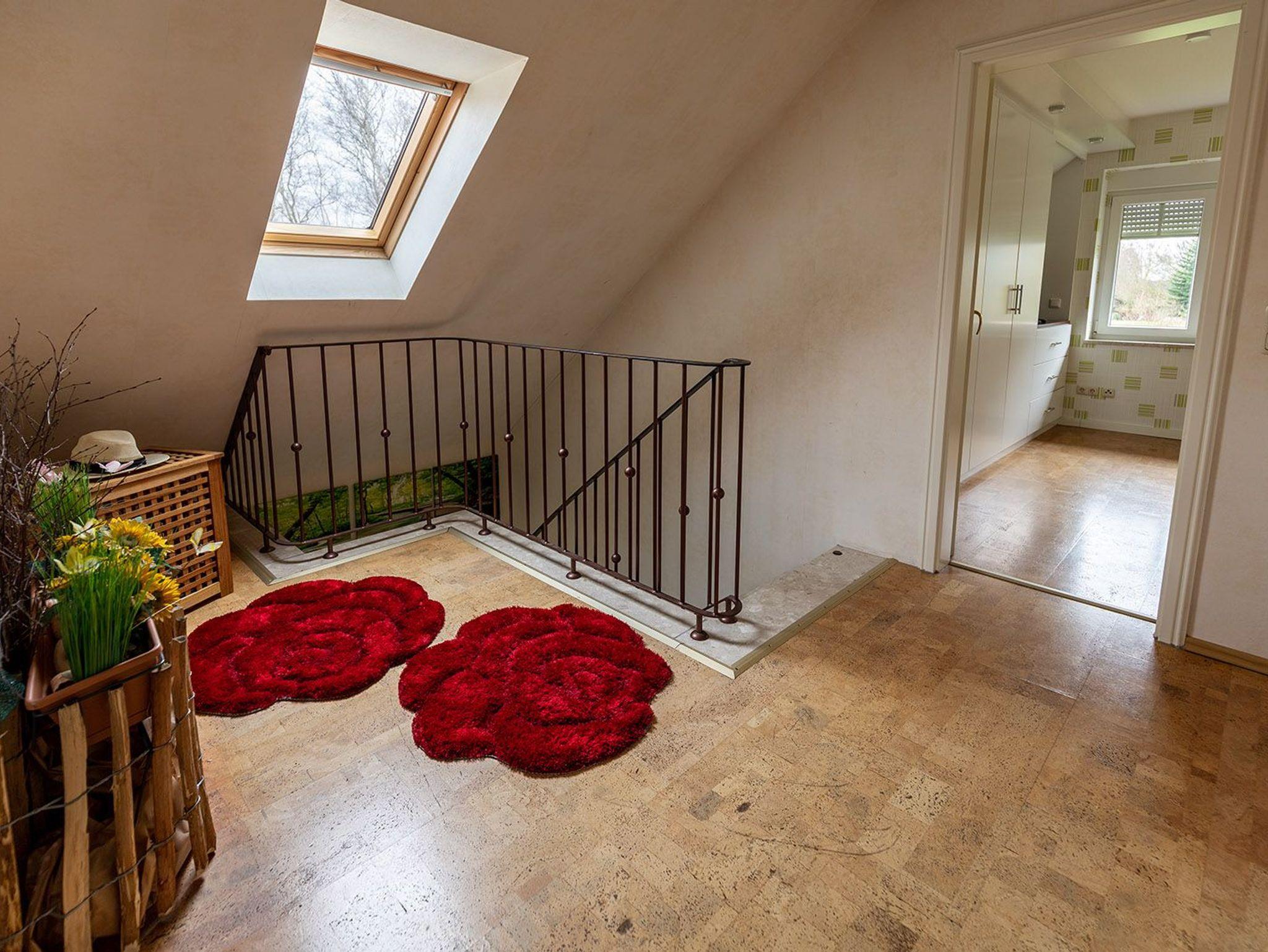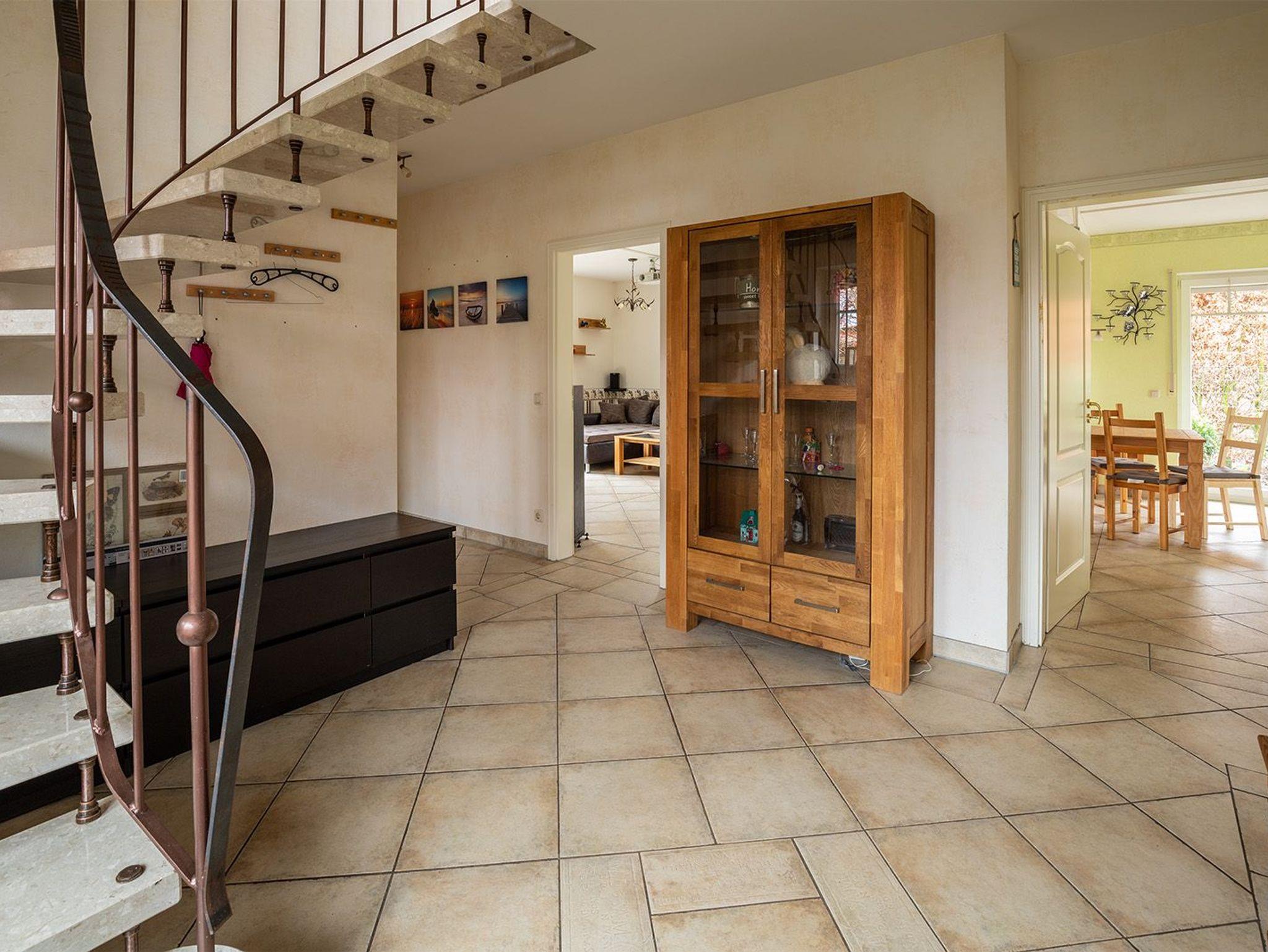 Sie betreten das Haus durch eine große Diele mit Durchgang rechts zum Hauswirtschaftsraum sowie dem Gäste-WC. Weiter geradeaus gelangen Sie in den geräumigen Wohn- und Kochbereich mit Kamin und Essplatz. Eine bequeme Wohnlandschlaft sorgt für Entspannung. Im EG befindet sich das Schlafzimmer mit Einzelbett. Ins Obergeschoss gelangen Sie über eine offene Steintreppe zu den weiteren 4 Schlafräumen mit je einem Doppelbett und je 2 Einzelbetten sowie dem Fensterduschbad mit sowohl Badewanne als auch Dusche im mediterranen Stil.