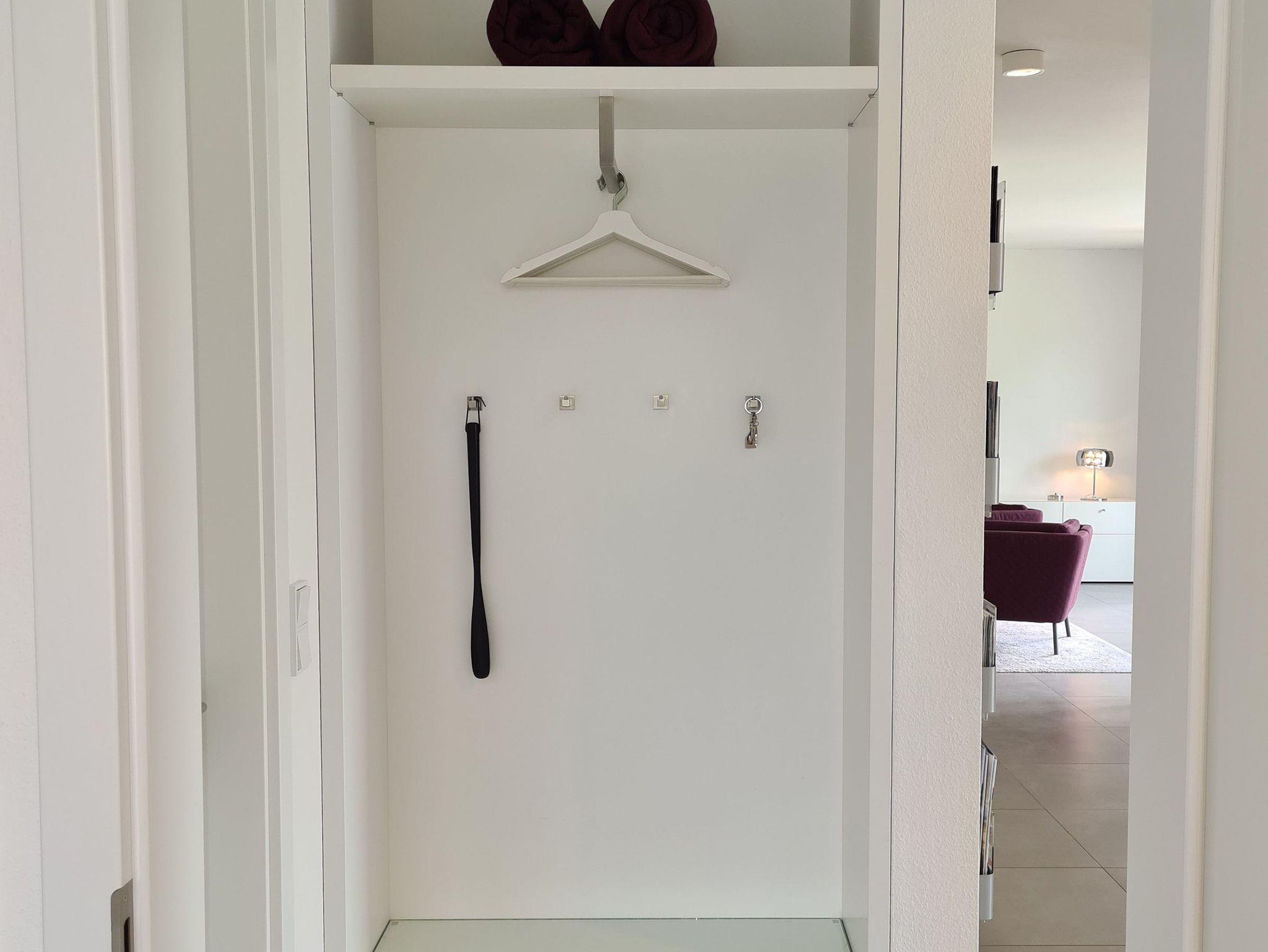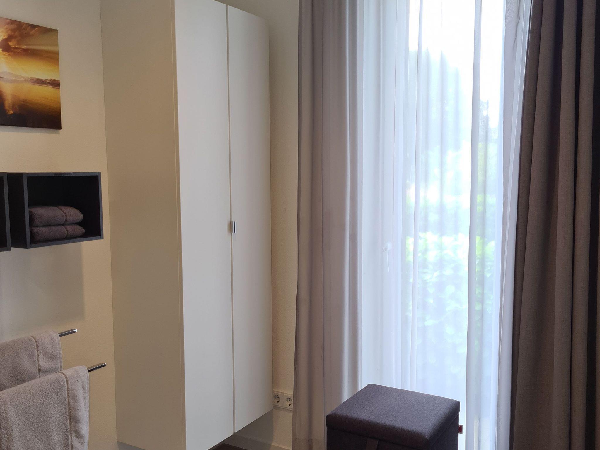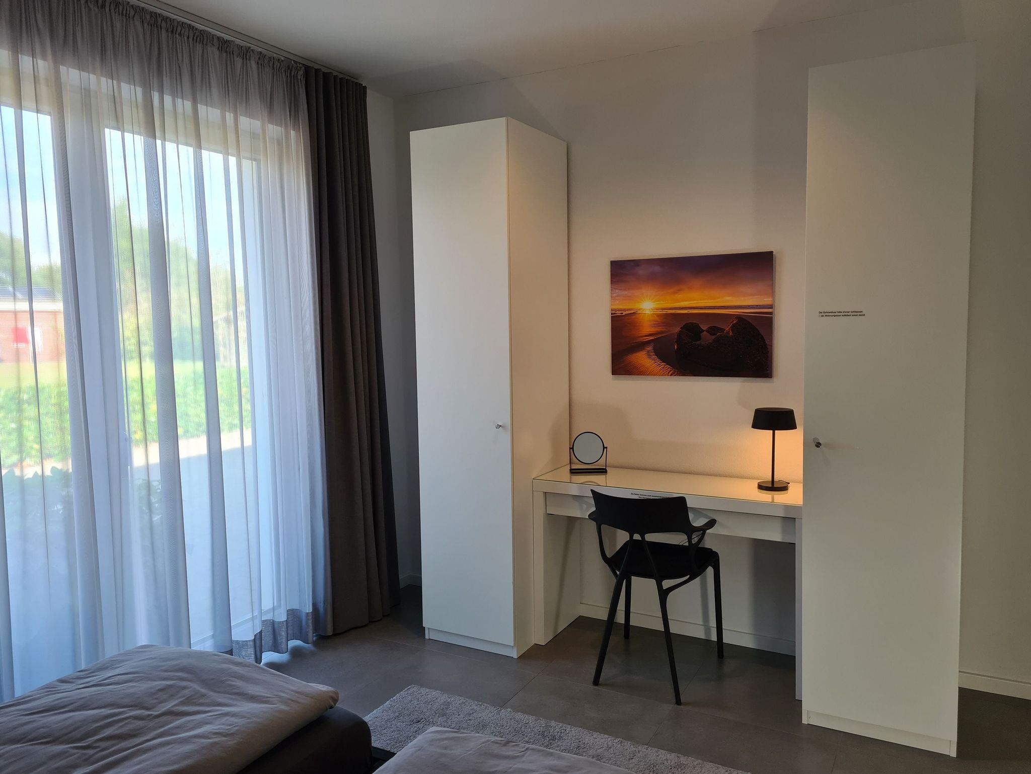 Die integrierte Garderobe im Flur sorgt sofort für Abhilfe. Gleich rechts gehalten finden Sie das geschmackvolle Duschbad mit begehbarer Dusche, Waschtisch und WC. Direkt gegenüber geht es in das erste Schlafzimmer mit Doppelbett plus Schränke und Kosmetikkommode. Die Fenster sind dank blickdichter Vorhänge schnell und einfach abzudunkeln.Eine Tür weiter vom Flur geht es in das zweite Schlafzimmer mit Doppelbett. Auch hier verfügen Sie über viel Stauraum dank hoher Schränke und zusätzlicher Kommode. Die Vorhänge sorgen auch hier für eine schnelle und einfache Abdunklung.
