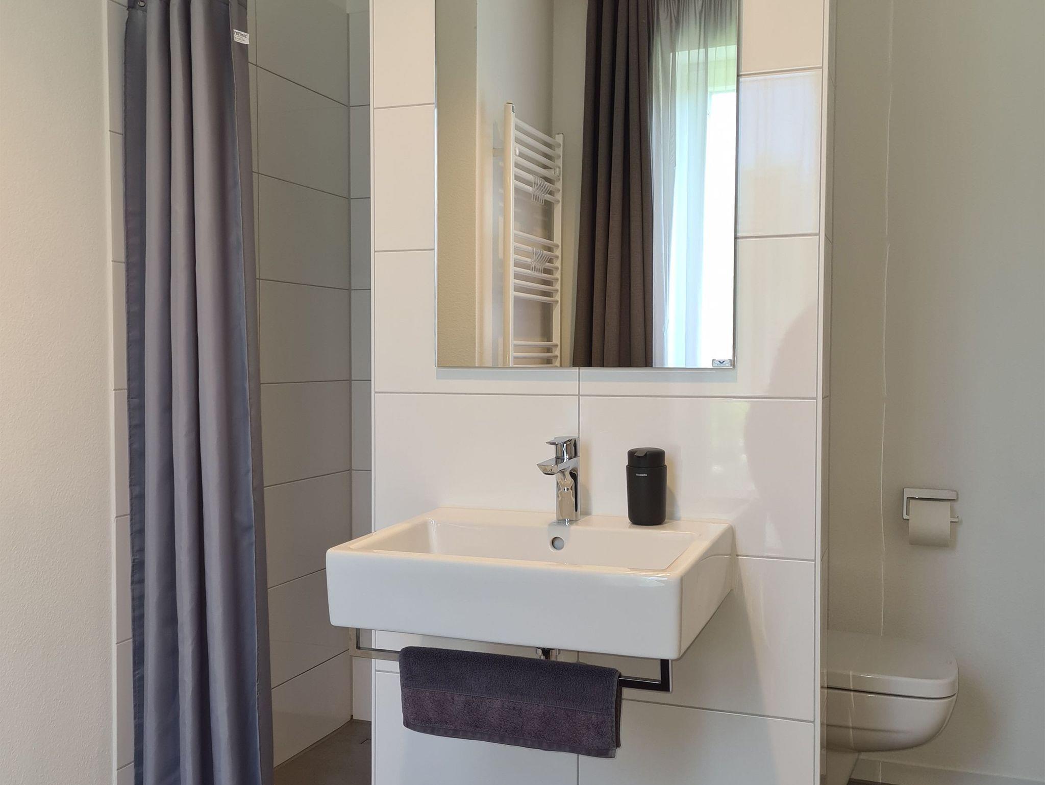 Bodentiefe Dusche, Waschtischanlage mit Spiegel, Föhn, WC,