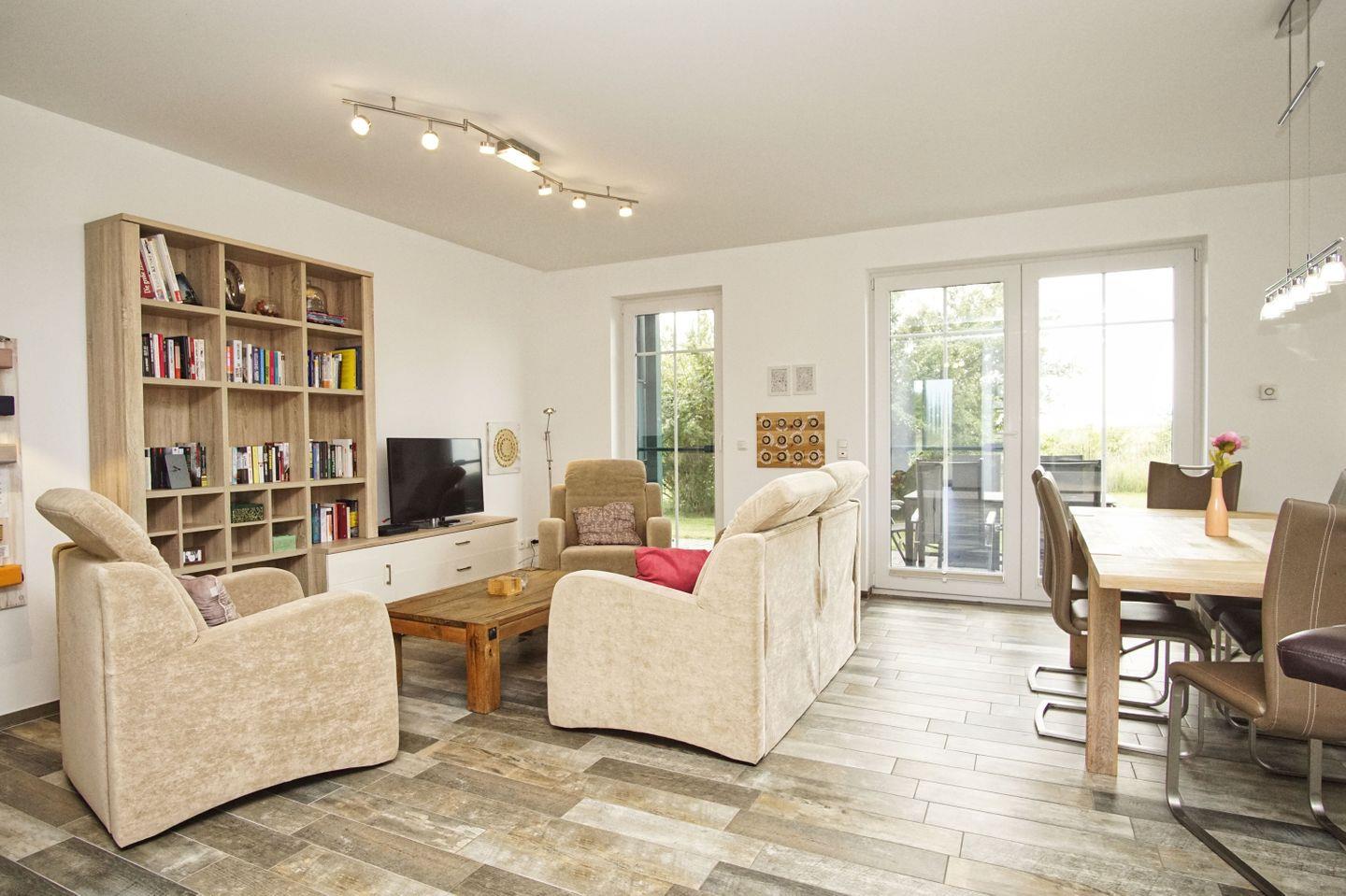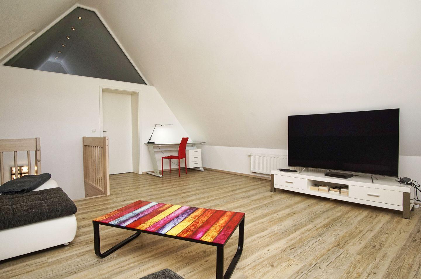 WOHNEN // Wohnraum mit Essbereich, Sitzgarnitur mit bequemer Couch und Sessel, Flachbild-TV, CD + DVD-Player, zweites Wohnzimmer im DG mit bequemer Couch, Flachbild-TV ++