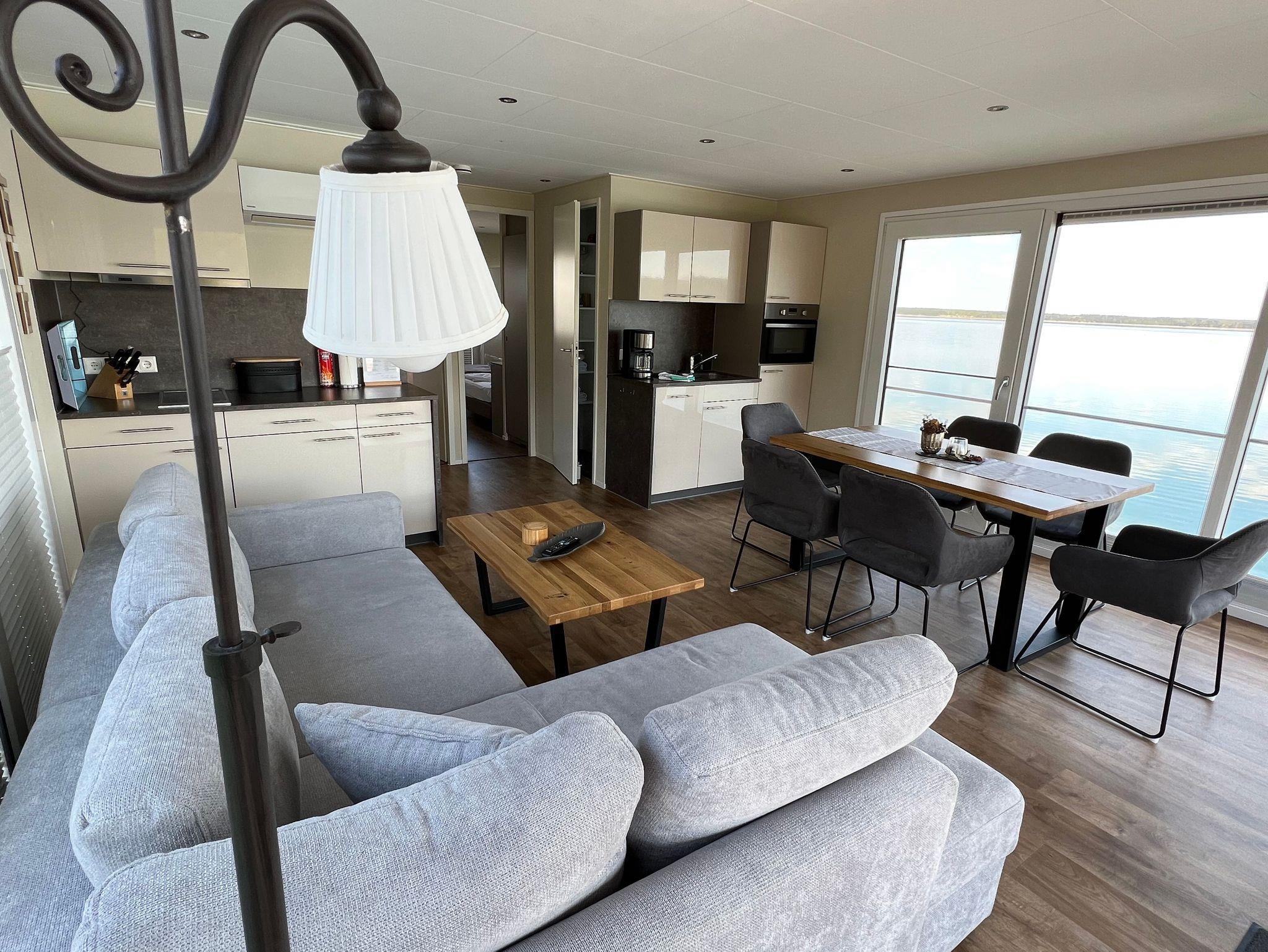 Dieses schwimmende Ferienhaus hat einen offenen Wohn-, und Essbereich mit integrierter, voll ausgestatteter Küche und bietet, Dank dem dreiseitigen Glasfront, einen tollen Ausblick auf den Gräbendorfer See. Es besitzt zwei separate Schlafzimmer mit je einem Doppelbett und Einbauschränken für ausreichenden Stauraum. Des Weiteren verfügt es über eine moderne Heizungs-/Klima-Technik, ein gefliestes Badezimmer mit Dusche und Waschtisch, ein separates WC mit Waschtisch sowie ein Panorama-Wohnzimmer mit Elektrokamin.