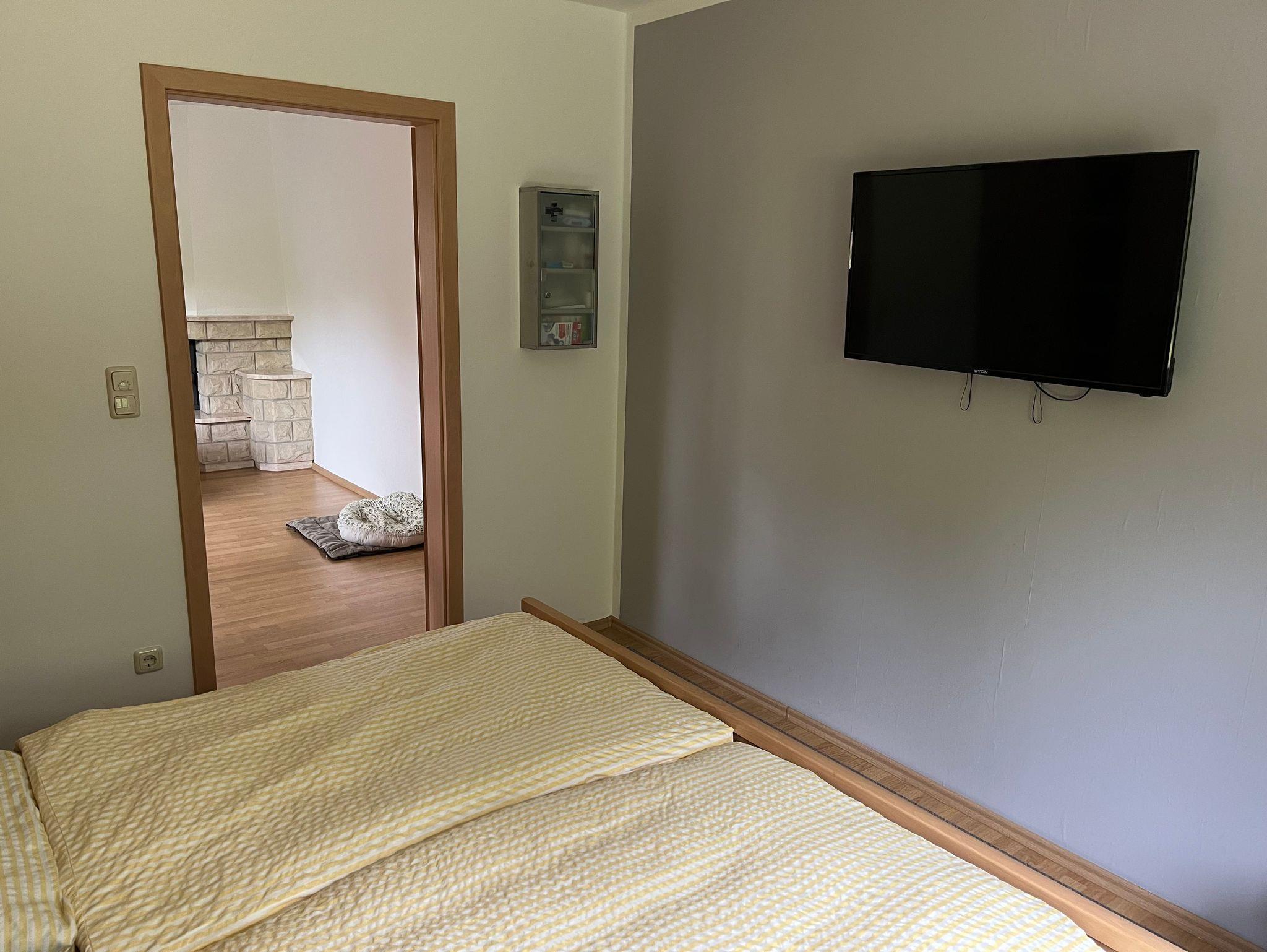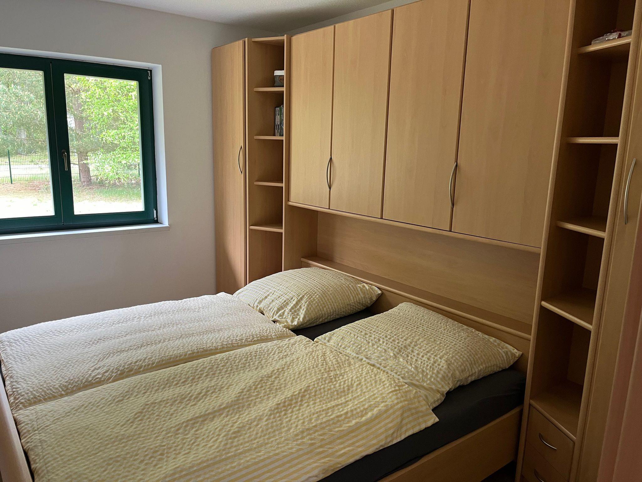 Schlafzimmer: Laminat, Doppelbett, Fernseher, viel Stauraum