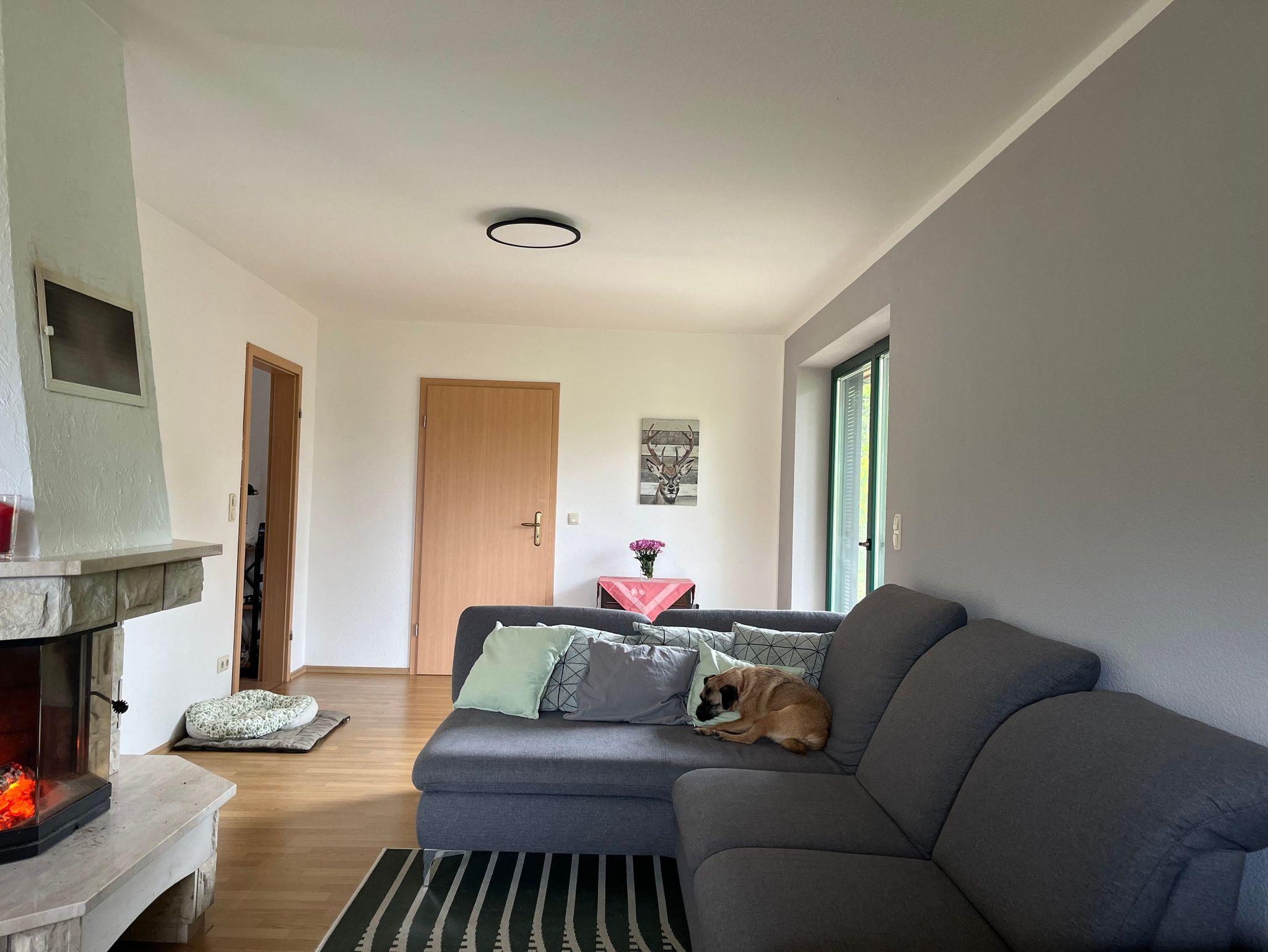 Wohnzimmer: Laminat, Kamin, Fernseher, gemütliche Sitzgelegenheiten (Schlafcouch)