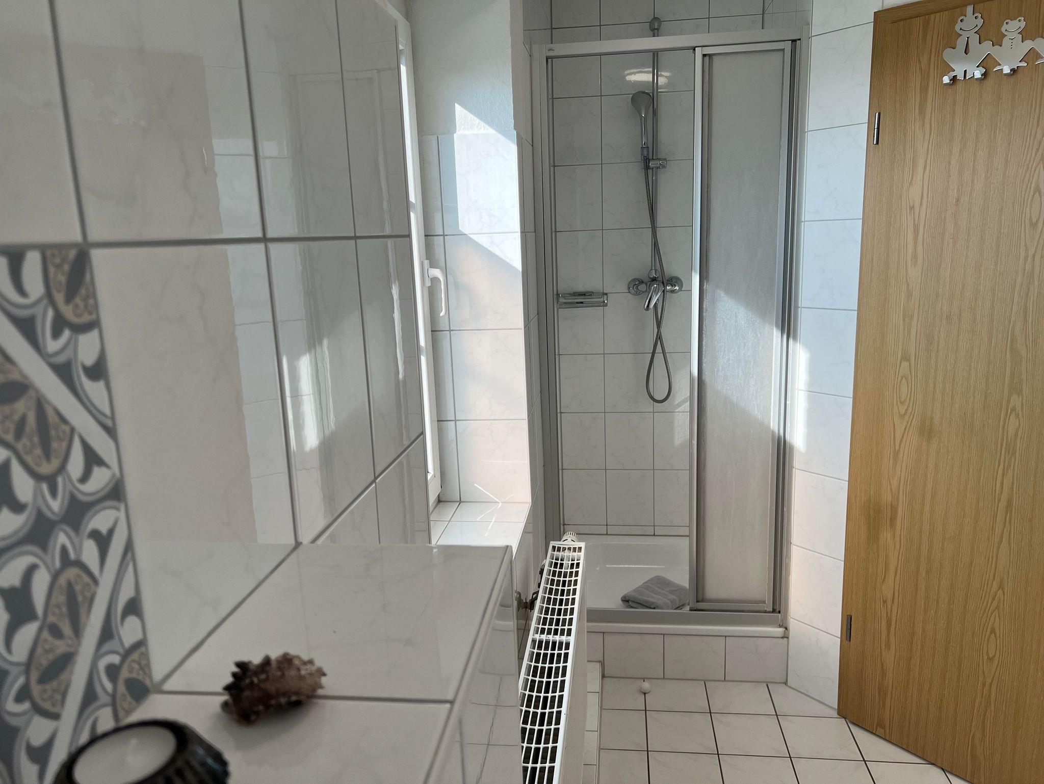 Das Duschbad ist mit einer Fußbodenheizung und ebenso mit einem Fön ausgestattet.