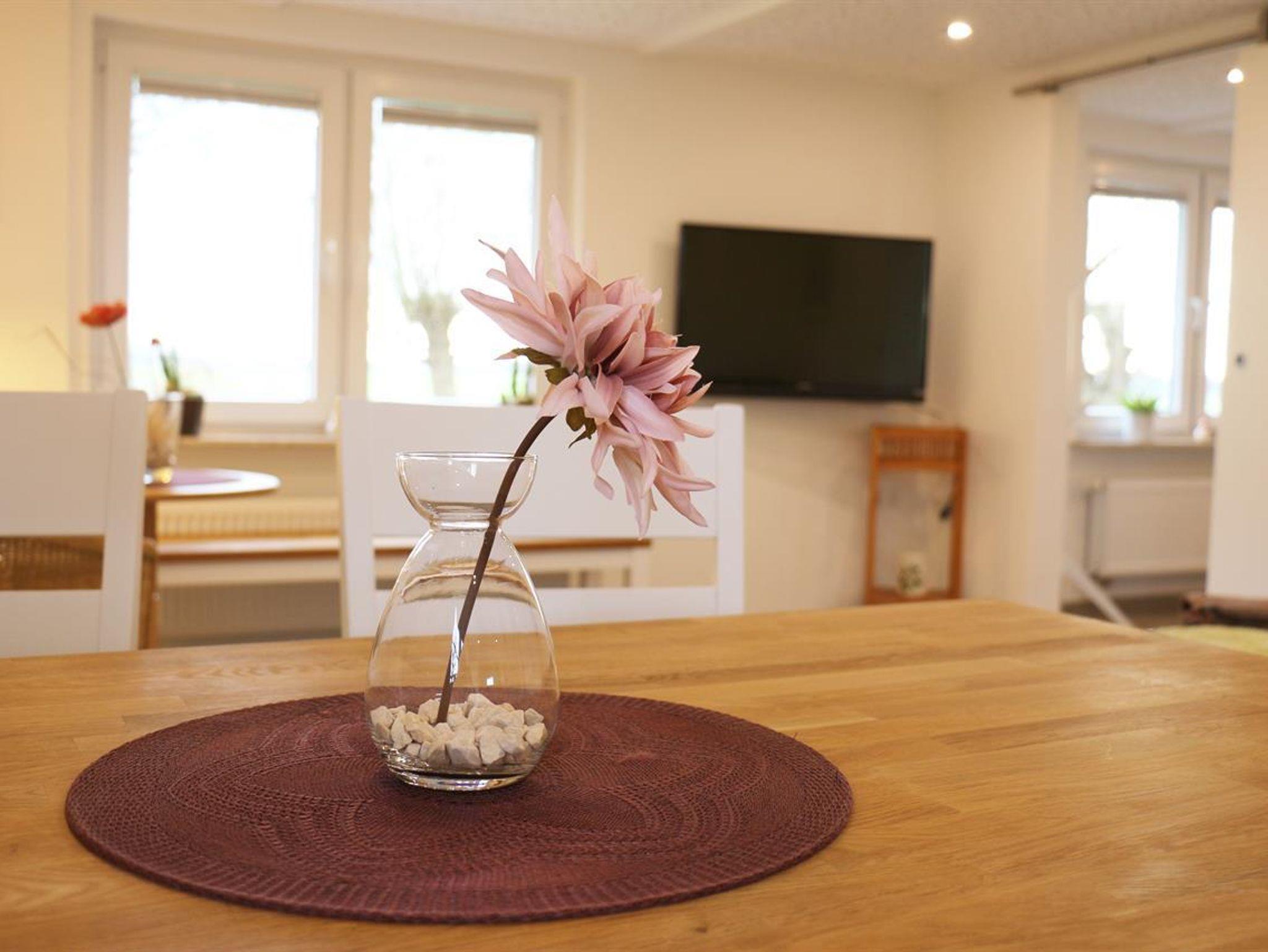 Unsere Wohnung „ Uns Tohus“ hat eine Größe von ca. 70m² und befindet sich im Erdgeschoss. Die Wohnung ist komplett modernisiert und behinderten freundlich eingerichtet u.a. mit rollstuhlgeeignetem Bad, Handgriffen, Sitz und Notfallknopf. Die offene Wohnküche ist ebenfalls mit dem Rollstuhl unterfahrbar. Die Wohnung hat zwei separate Schlafräume. Für einen ungehinderten Zugang zur Wohnung sorgt eine Rampe vor der Wohnungstür. Eine eigene Terrasse mit Ausblick über die Felder rundet die Ausstattung der Wohnung ab. Waschmaschine und Trockner zur Gemeinschaftsnutzung sind vorhanden.
