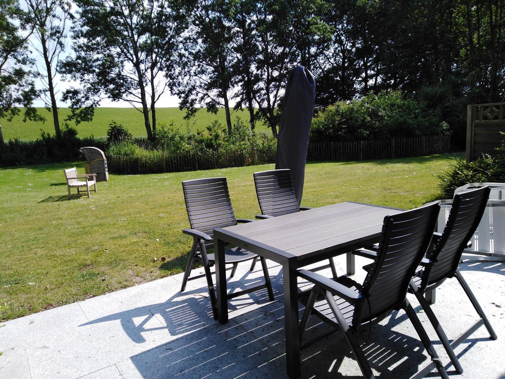 Sie können die Terrasse mit Strandkorb und Loungecke vorne im Garten gemeinsam mit Wohnung 4 nutzen