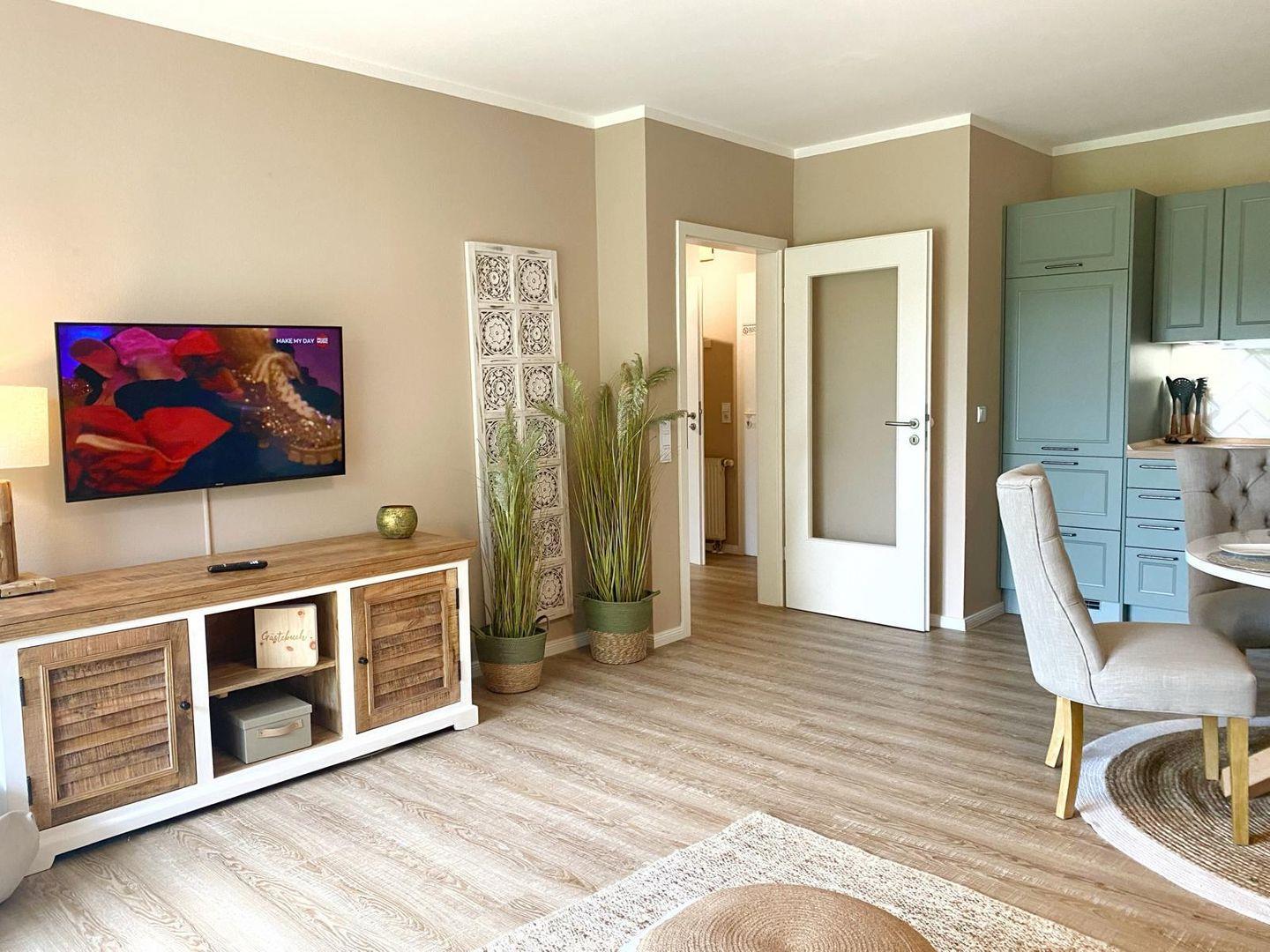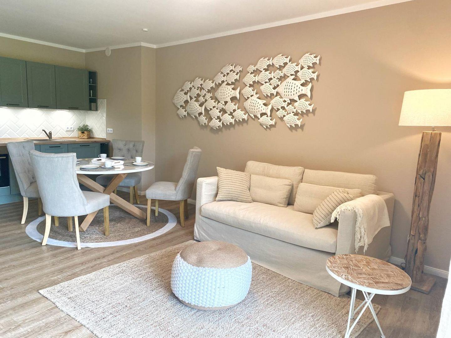 Sie besteht aus einem Wohnzimmer mit Sitzecke, Essplatz und einer vollausgestatteten Küchenzeile mit Kühlschrank, Spülmaschine, Induktionsherd, Backofen ect.