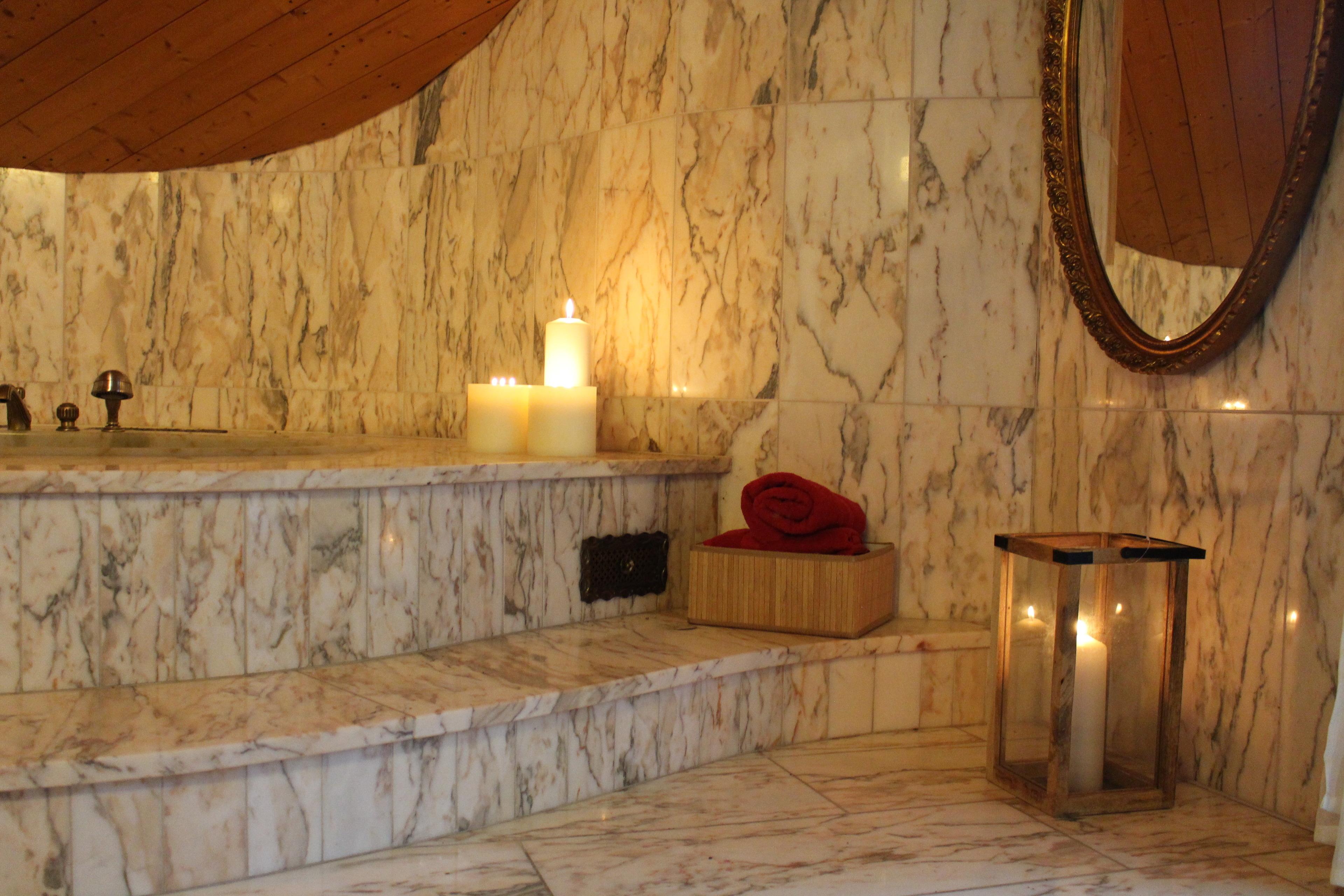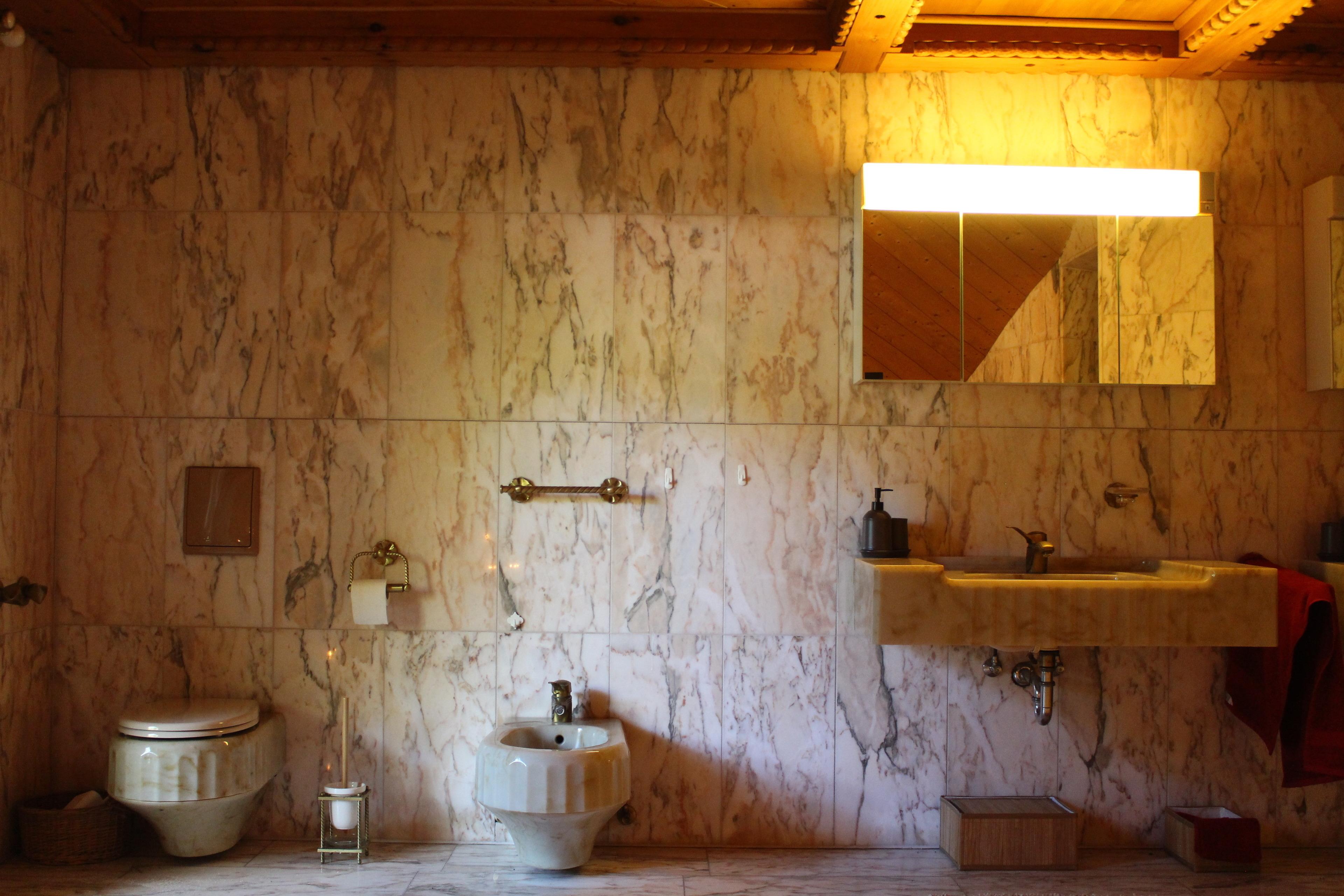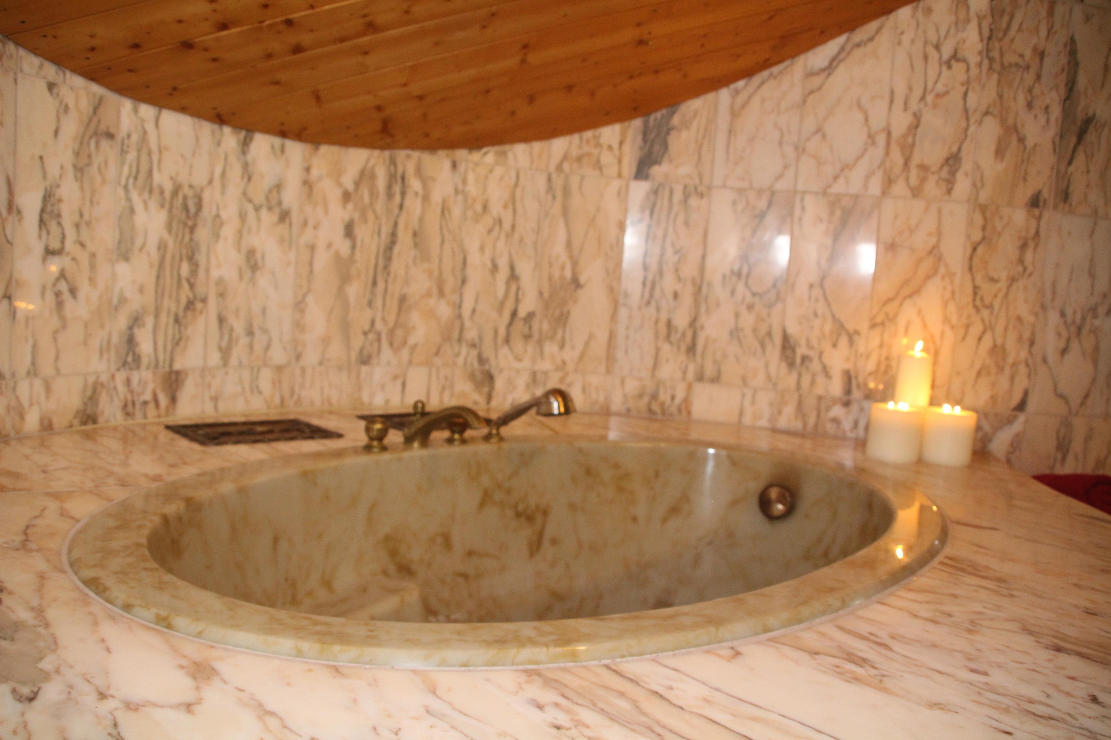 Das große marmorierte Badezimmer hat eine geräumige Dusche, eine Badewanne für zwei, WC und ein Doppelwaschbecken.