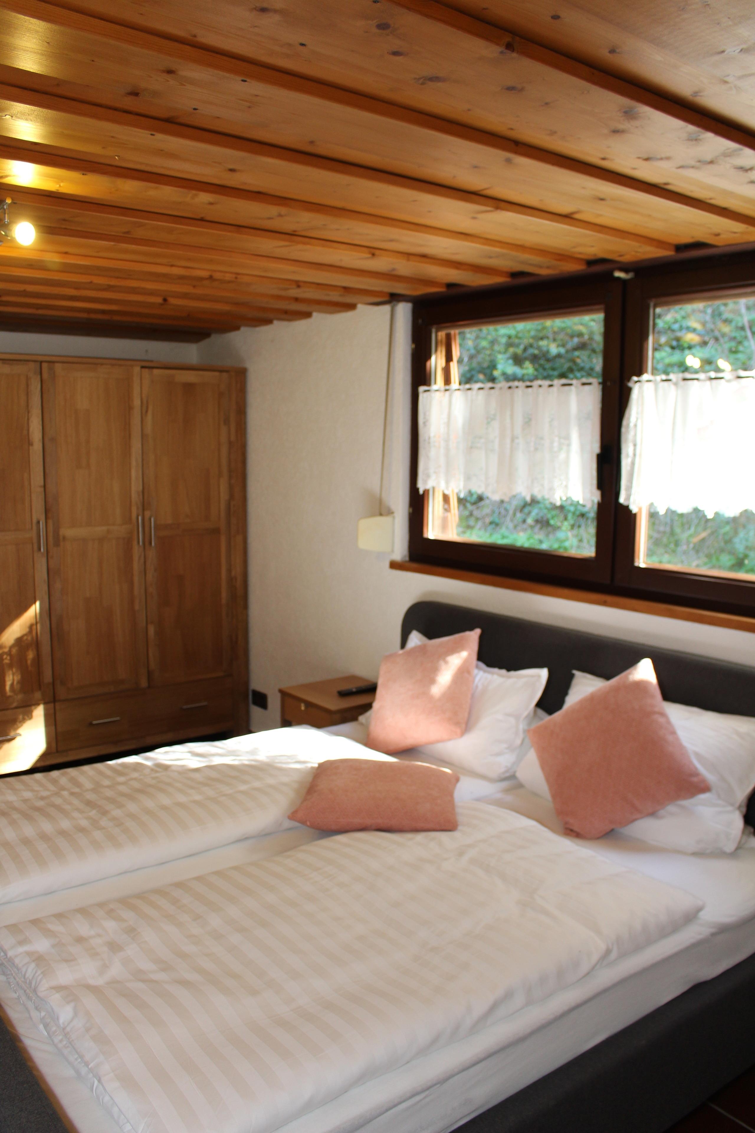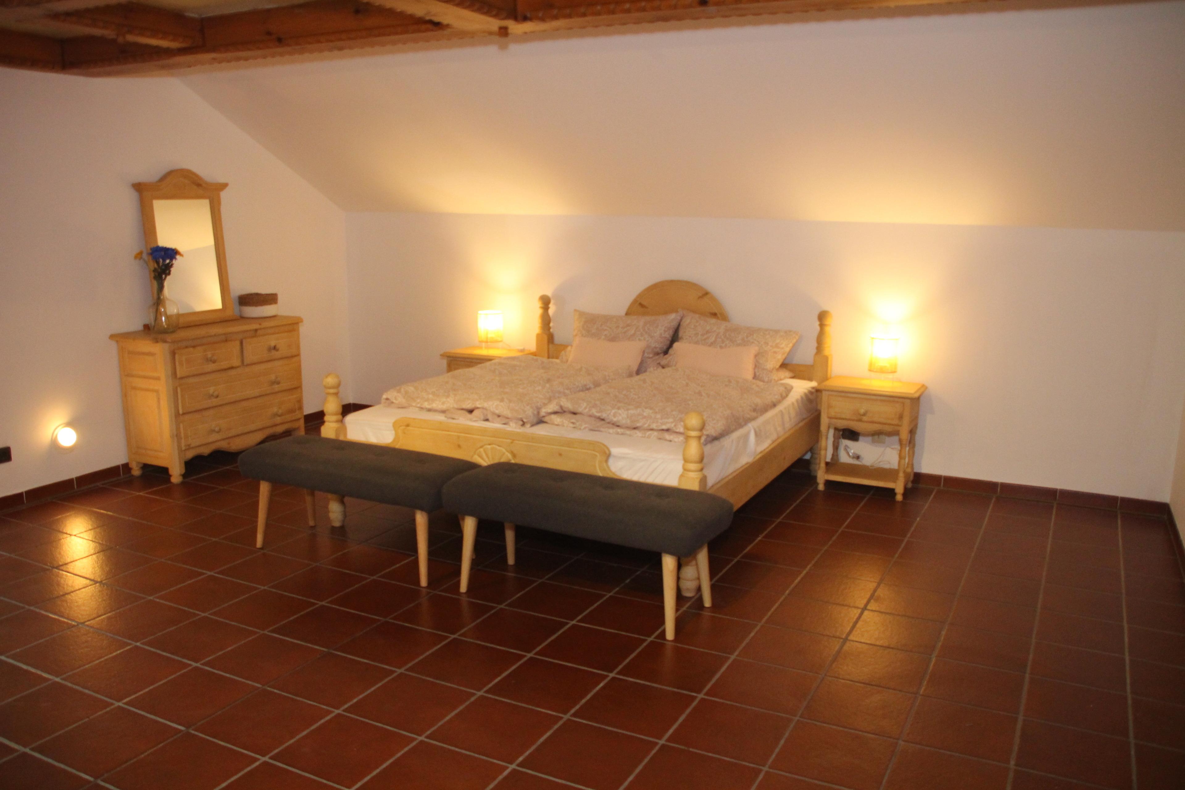 Das geräumige Schlafzimmer von ca. 40 qm hat einen offenen Dachstuhl mit viel sichtbarem Holz und einem großzügigen, fantastischen Blick auf den Pfälzer Wald.