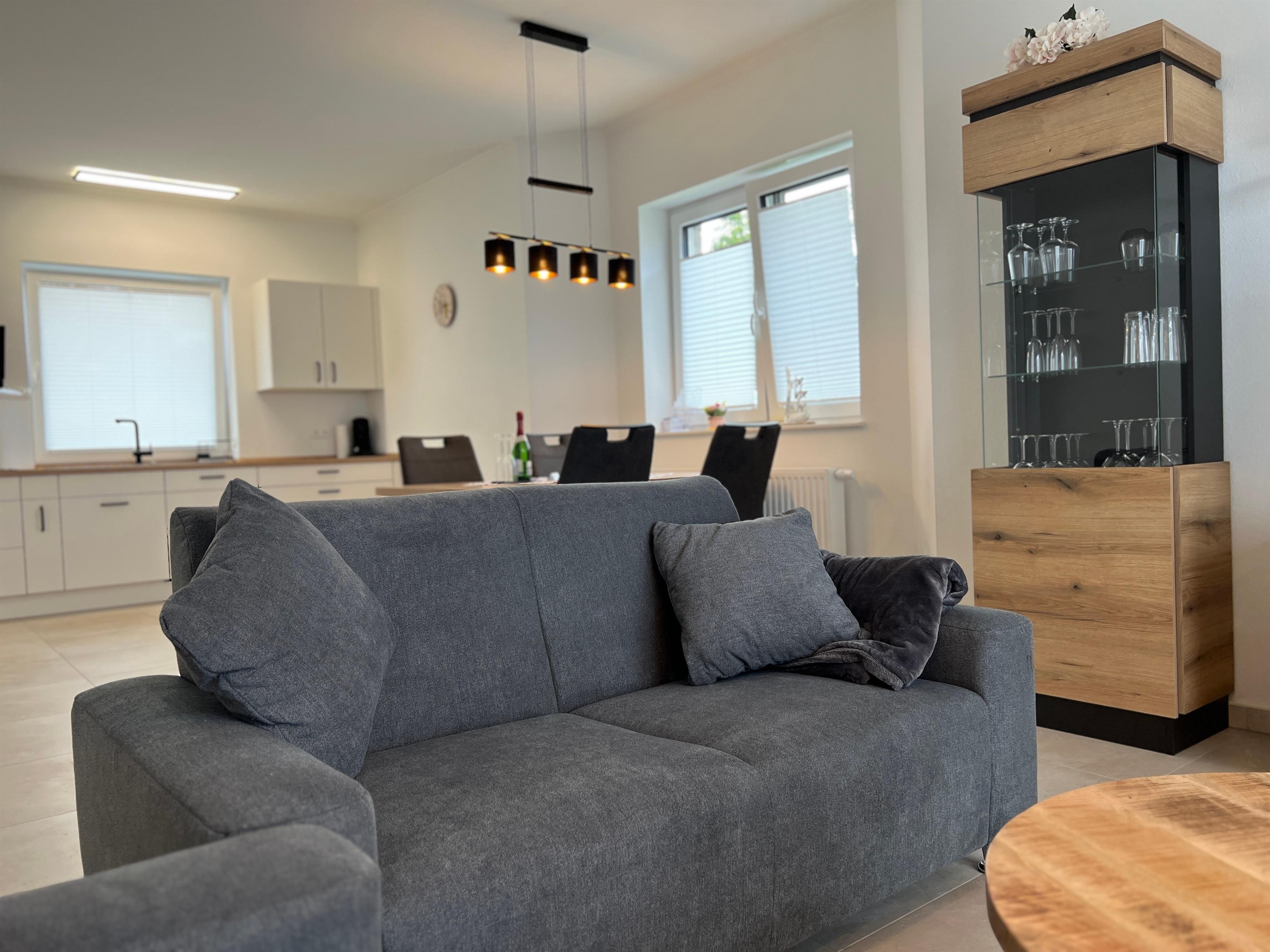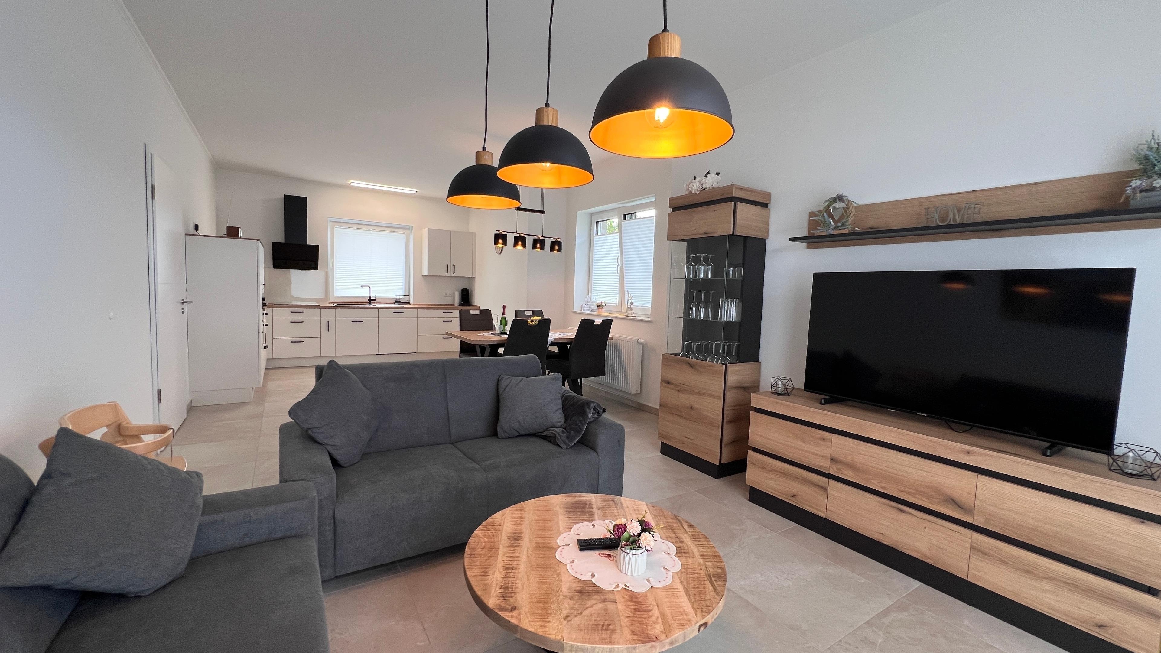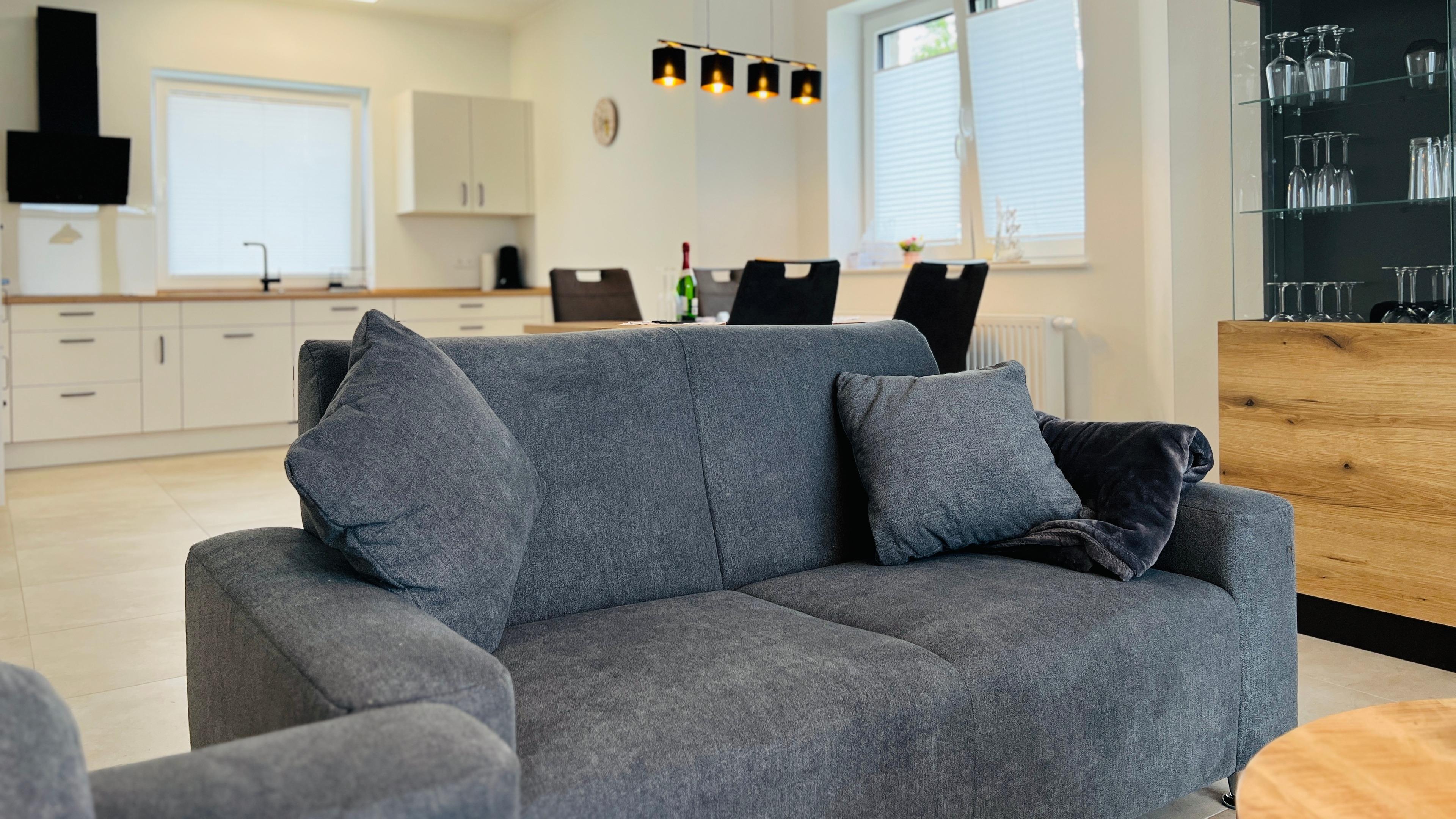 Das Herzstück des Hauses ist das Wohnzimmer mit einer offenen modernen Küche kombiniert sowie einer großzügigen Essecke. Im Haus sind große Fenster die viel Licht in die Räume lassen.