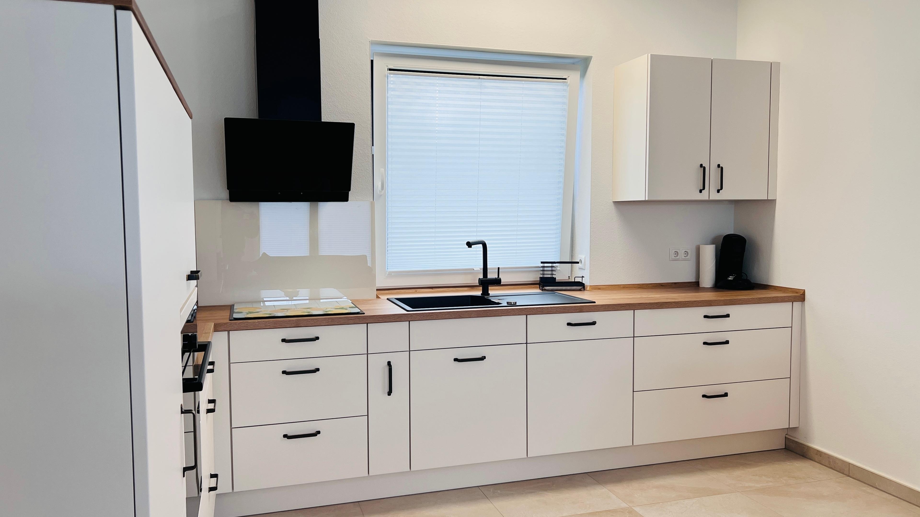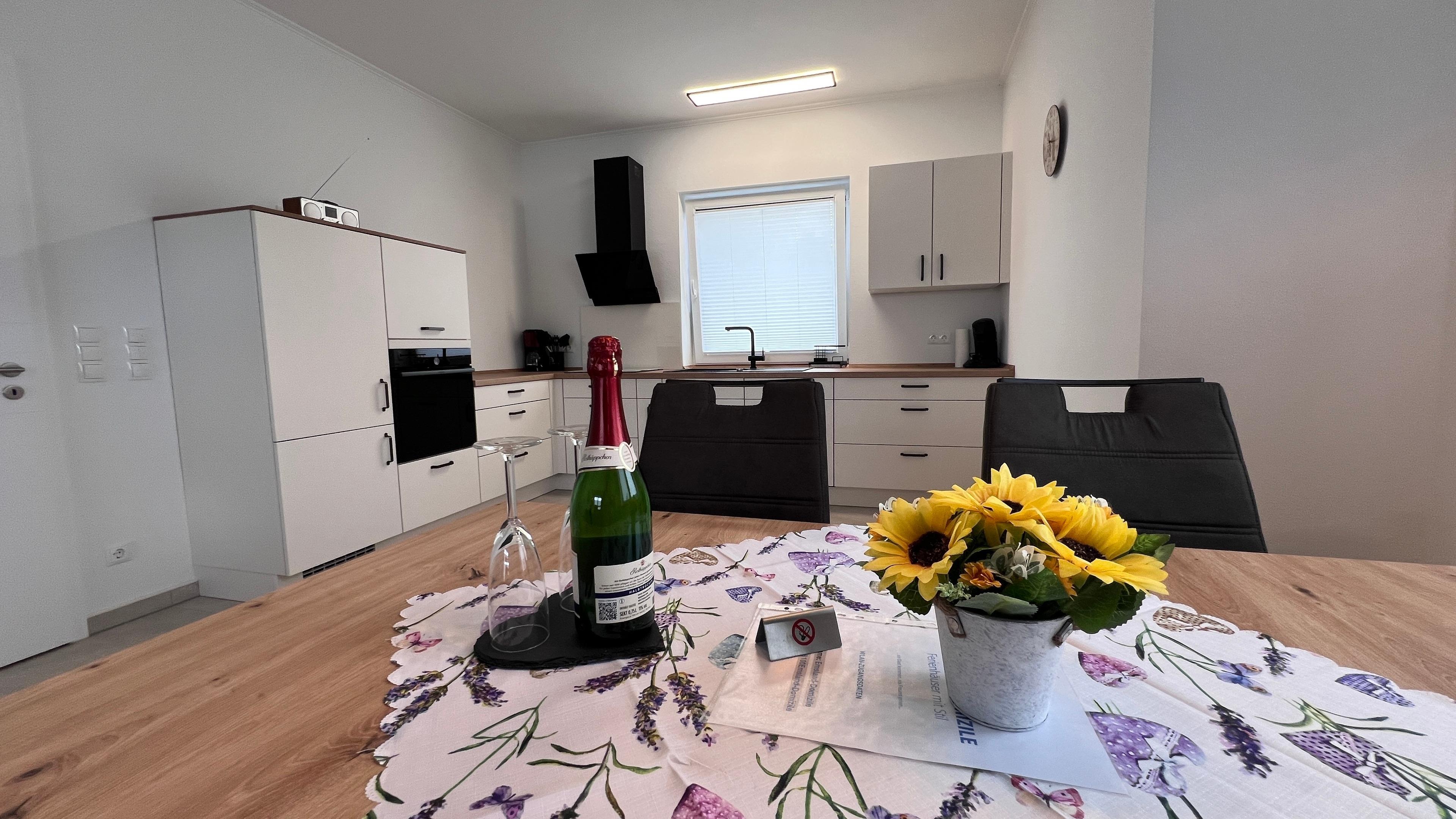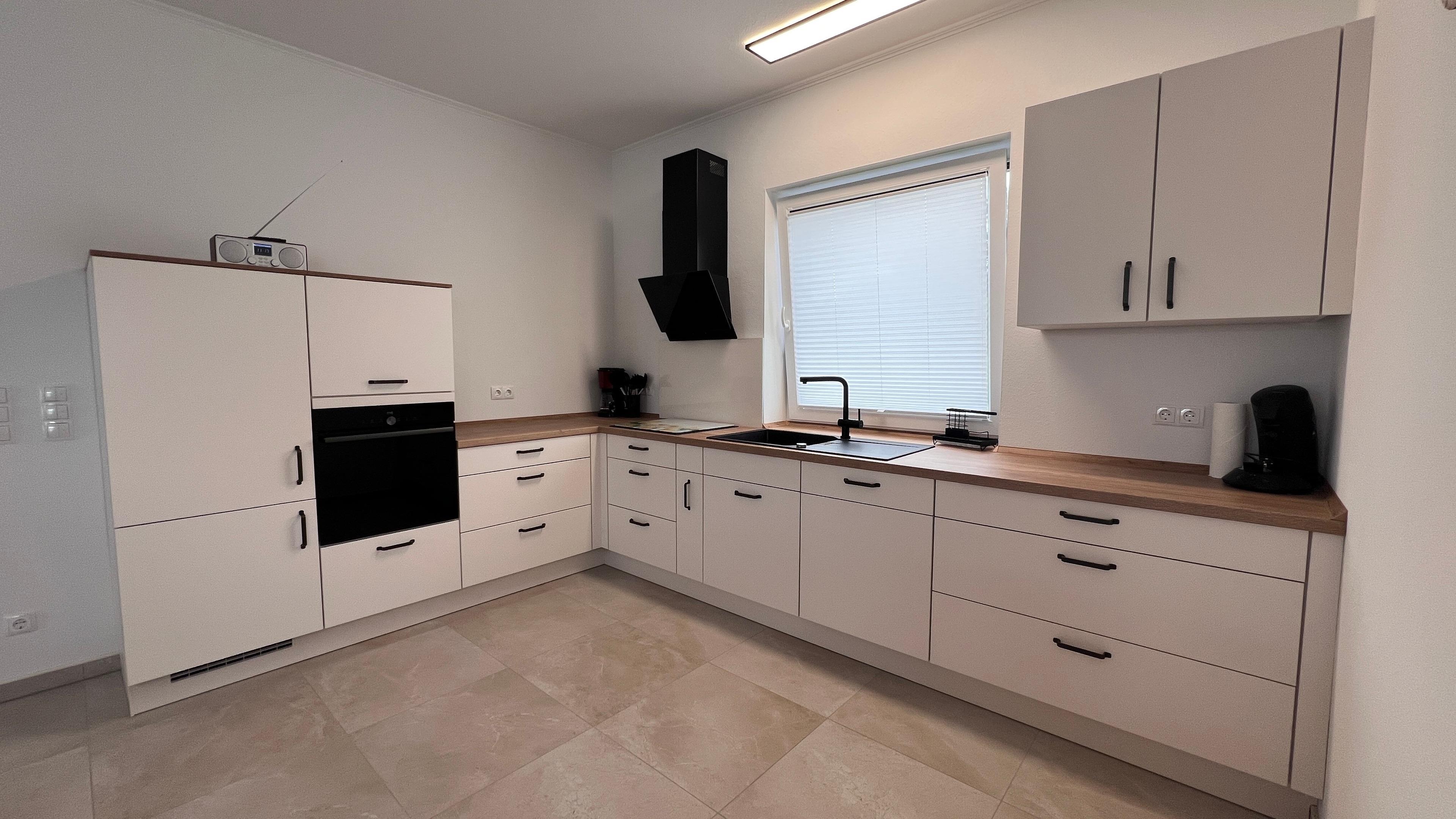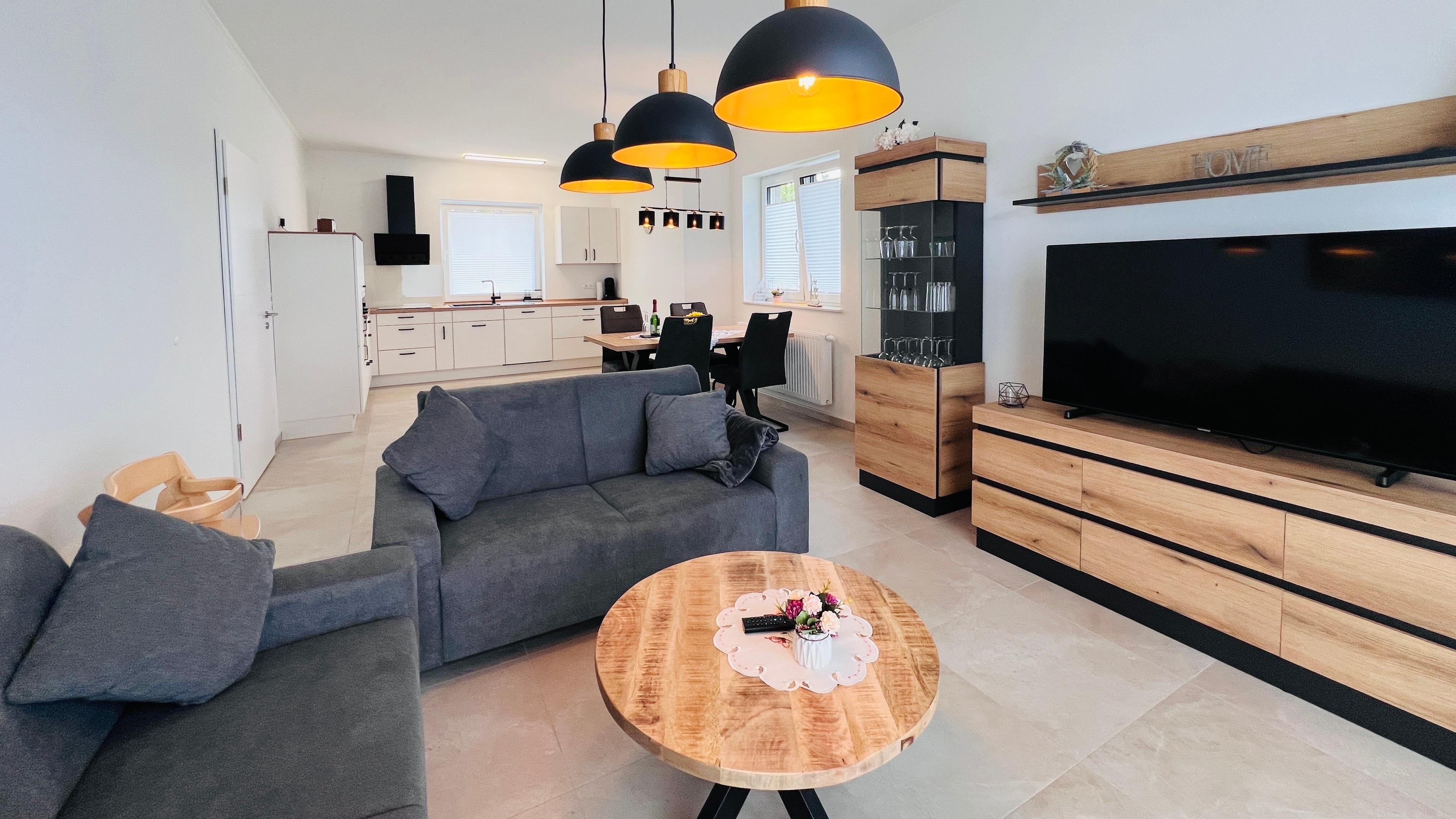 Das Herzstück des Hauses ist das Wohnzimmer mit einer offenen modernen Küche kombiniert sowie einer großzügigen Essecke. Im Haus sind große Fenster die viel Licht in die Räume lassen.
