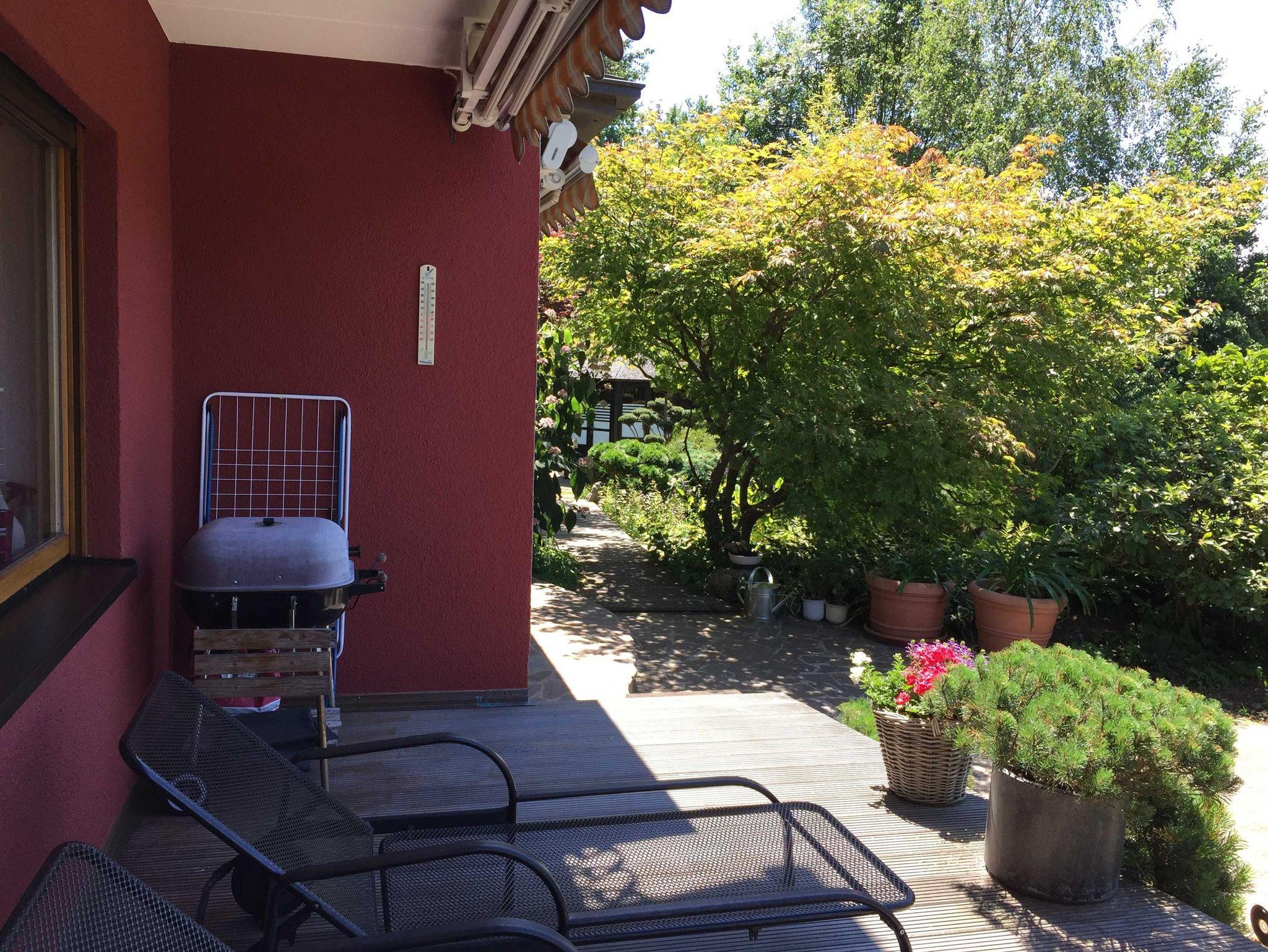 Die süd-westlich ausgerichtete Terrasse bietet Ihnen nicht nur am Nachmittag genügend Sonne, sondern lässt Sie auch an dem wunderschönen Sonnenuntergang teilhaben. Von der Terrasse aus haben Sie einen herrlichen Blick auf einen gepflegten, parkähnlichen Garten mit Gartenteich. Fliegengitter an Fenstern und Türen, ein Grill, Gartenliegen und eine vollautomatische Kaffeemaschine runden das Angebot ab.