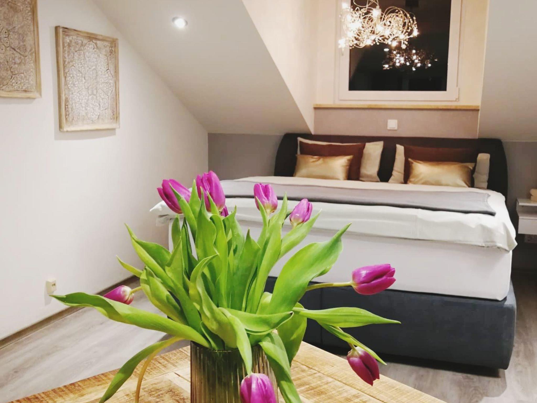 The approx. 50 square metre loft is furnished in a minimalist design. Walnut, white and green make the room very cosy. 3 windows flood the room with natural light. The ideal oasis of well-being for 2 people.