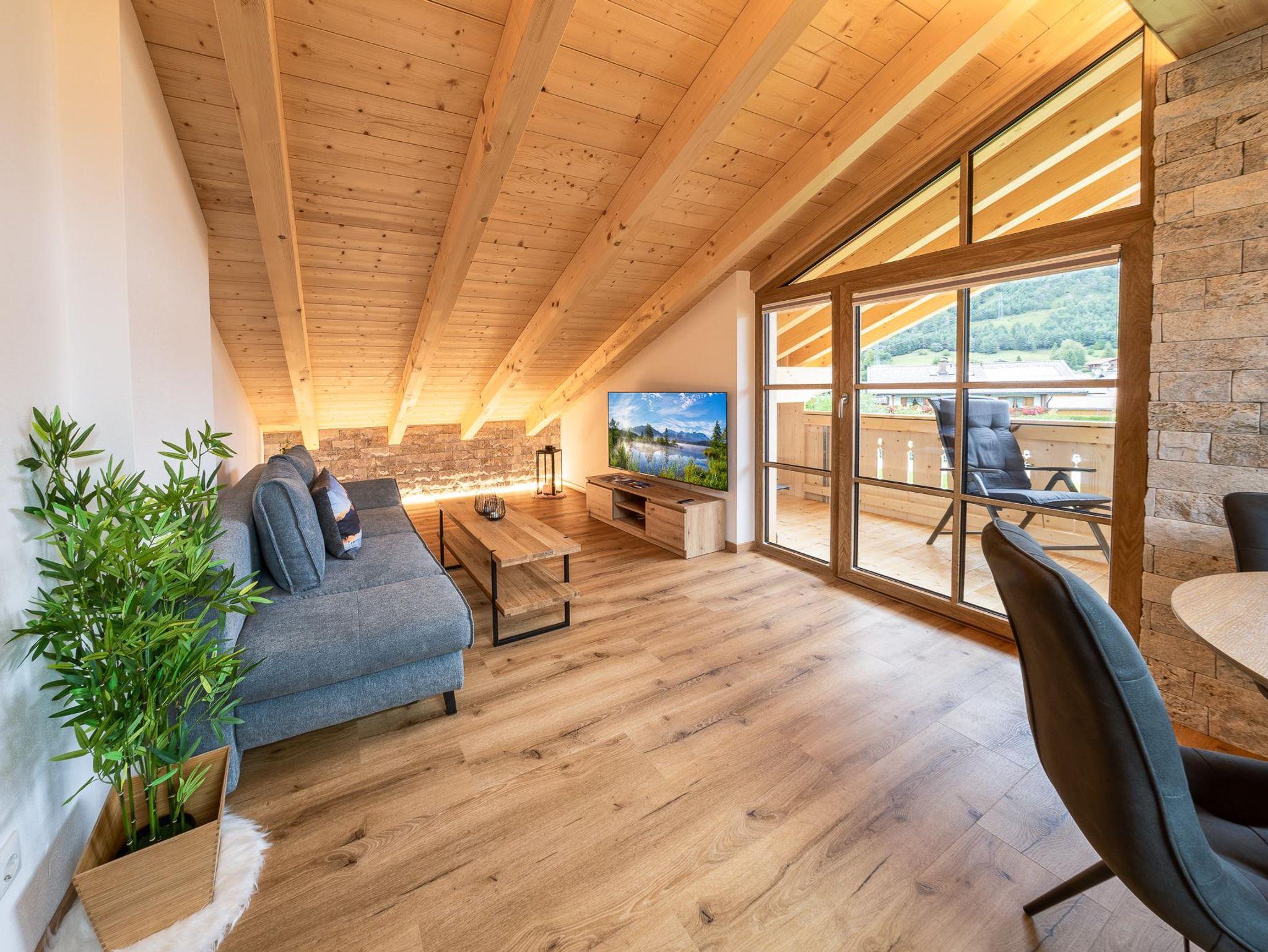 Genießen Sie entspannte Stunden auf dem Balkon und lassen Sie Ihren Blick über die umliegende Bergwelt schweifen. Für wohlige Wärme sorgt die Fußbodenheizung.