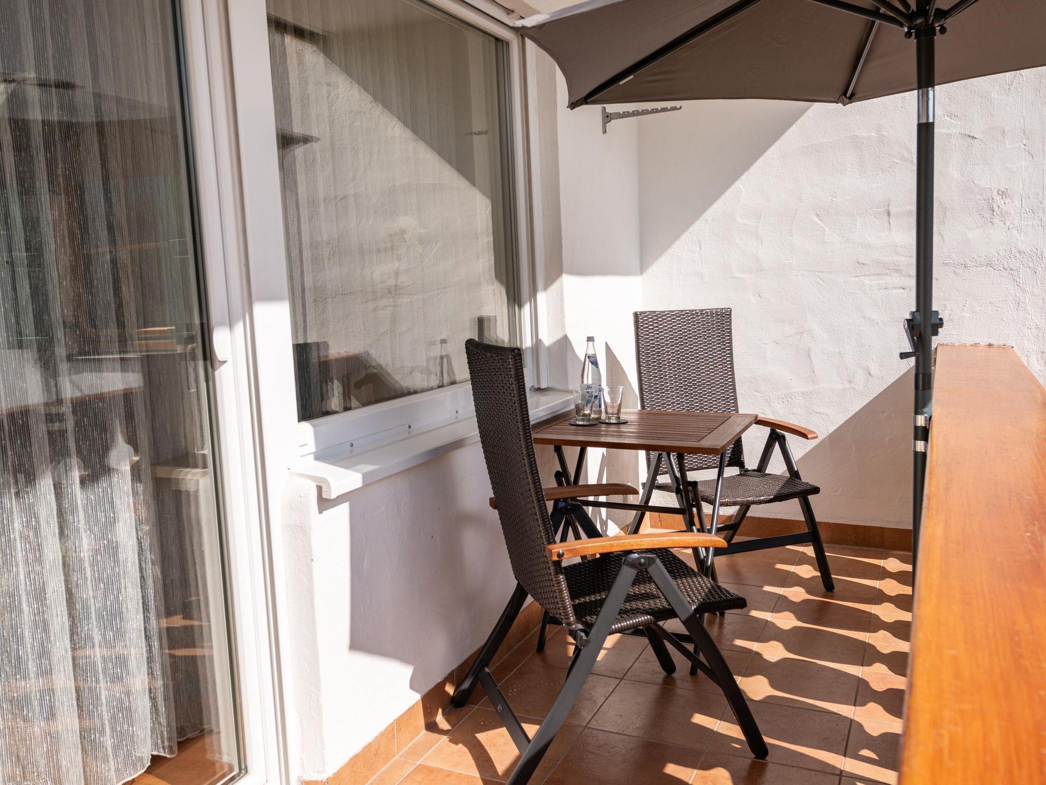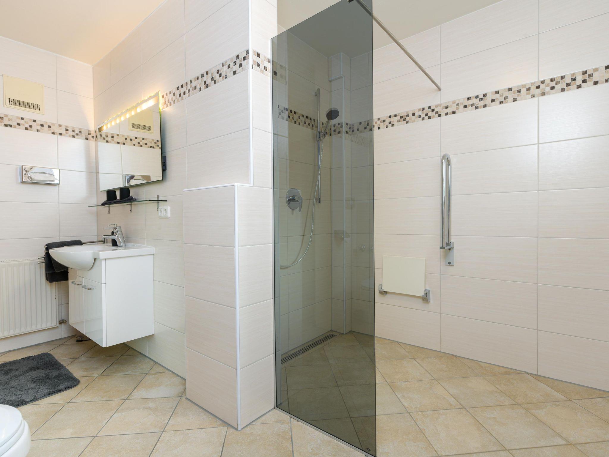 Das Schlafzimmer ist mit einem komfortablen Doppelbett, einem geräumigen Kleiderschrank, einem Nachttisch und einem direkten Zugang zum Balkon ausgestattet. Das Badezimmer mit ebenerdiger Dusche, großem Spiegel und Fenster rundet das Gesamtbild ab.