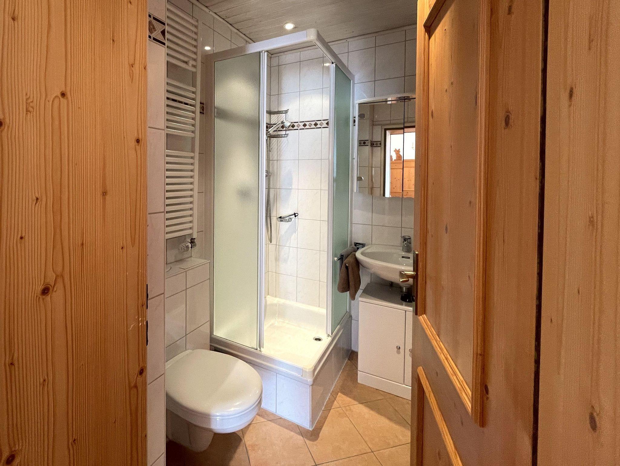 Das Badezimmer ist mit Dusche und WC ausgestattet.