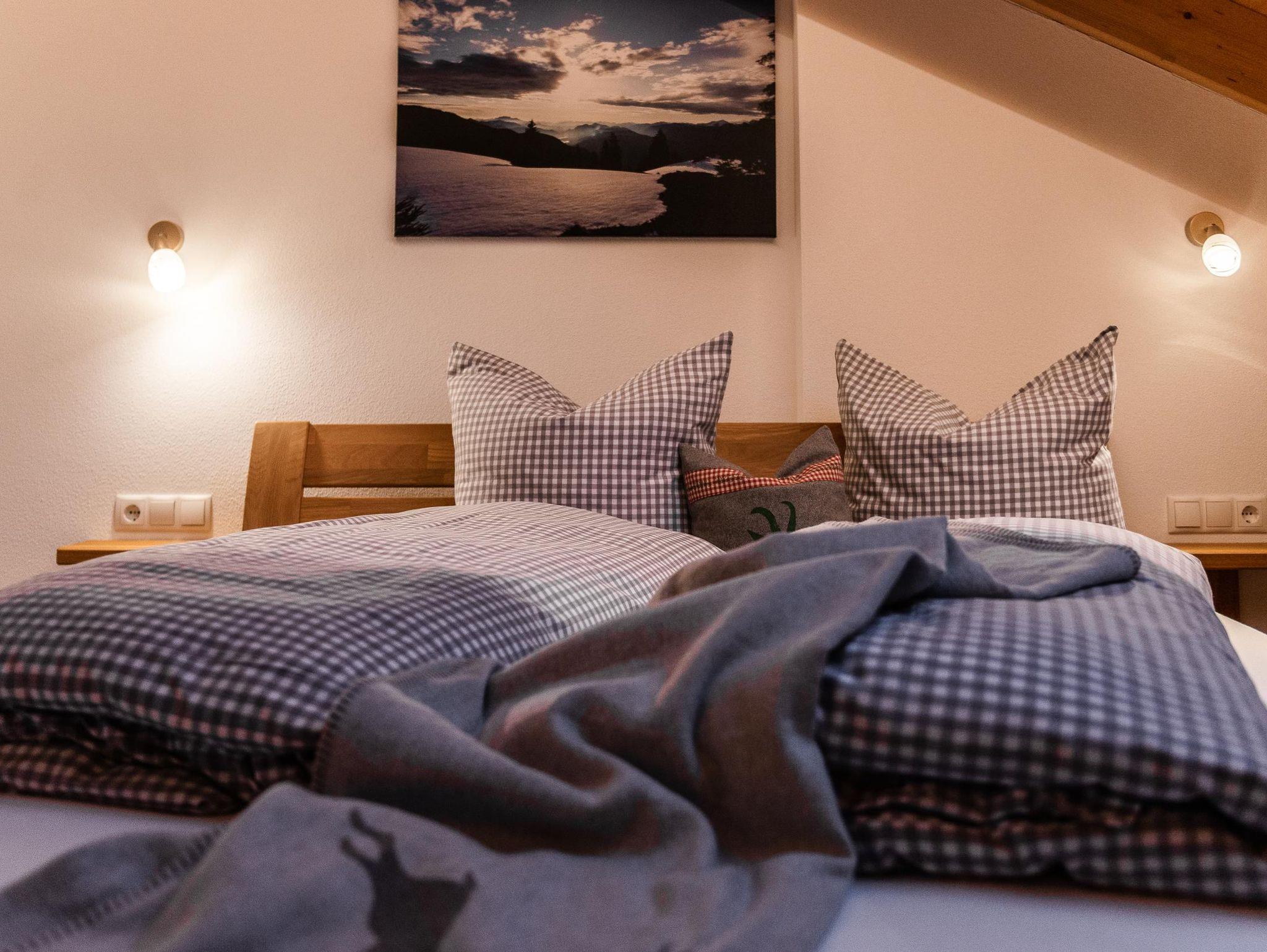 Unsere gemütliche Ferienwohnung im ländlichen Stil mit 70 m² Wohnfläche befindet sich im 2.Stock und bietet Platz für 1-5 Personen. Die komplett ausgestattete Wohnküche mit Geschirrspüler, Kühlschrank, Herd, Backofen, Mikrowelle, Wasserkocher und Kaffeemaschine lässt keine Wünsche offen. In der Wohnküche befindet sich eine gemütliche Essgruppe mit einzigartigem Panoramablick auf das Karwendelgebirge. Die Ferienwohnung verfügt insgesamt über 2 Schlafzimmer, davon ein Schlafzimmer mit einem Doppelbett und ein Schlafzimmer mit einem Doppelbett und einem Einzelbett. Der Wohnraum verfügt über einen TV 55 Zoll und einer gemütlichen Couchgarnitur, die das Gesamtbild abrunden. Vor allem im Sommer können Sie entspannte Abende auf dem großen Südost Balkon ausklingen lassen. Das barrierefreie Badezimmer verfügt über eine Dusche und ein WC. Bettwäsche, Handtücher, kostenfreie WLAN-Nutzung, Parkplatz und Endreinigung sind im Preis enthalten.