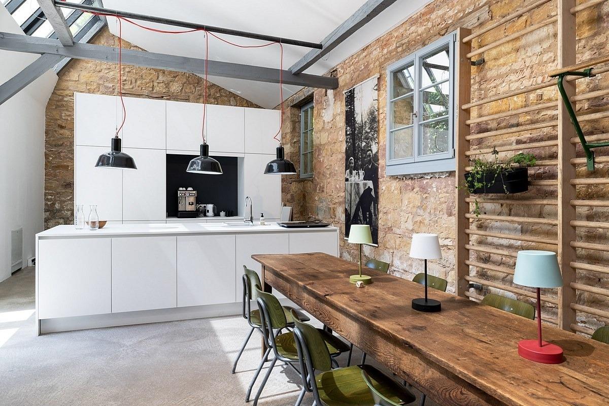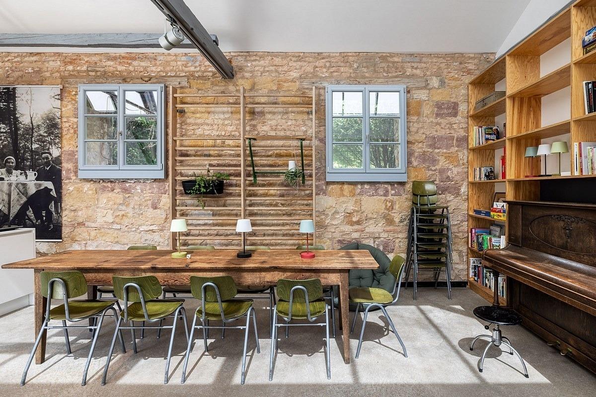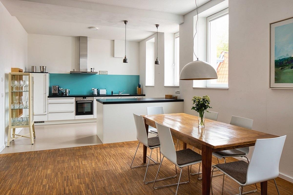 Zum Wohnen treffen sich alle vier bis sechs im geräumigen Koch-, Ess- und Wohnbereich (zum kochen, essen und wohnen) - wie, wo und für was auch immer: Es gibt reichlich Platz für alle. Parkettboden und weiße Wände, schlicht-modern-geschmackvolle Einrichtung und hohe Decken, toller Raum.