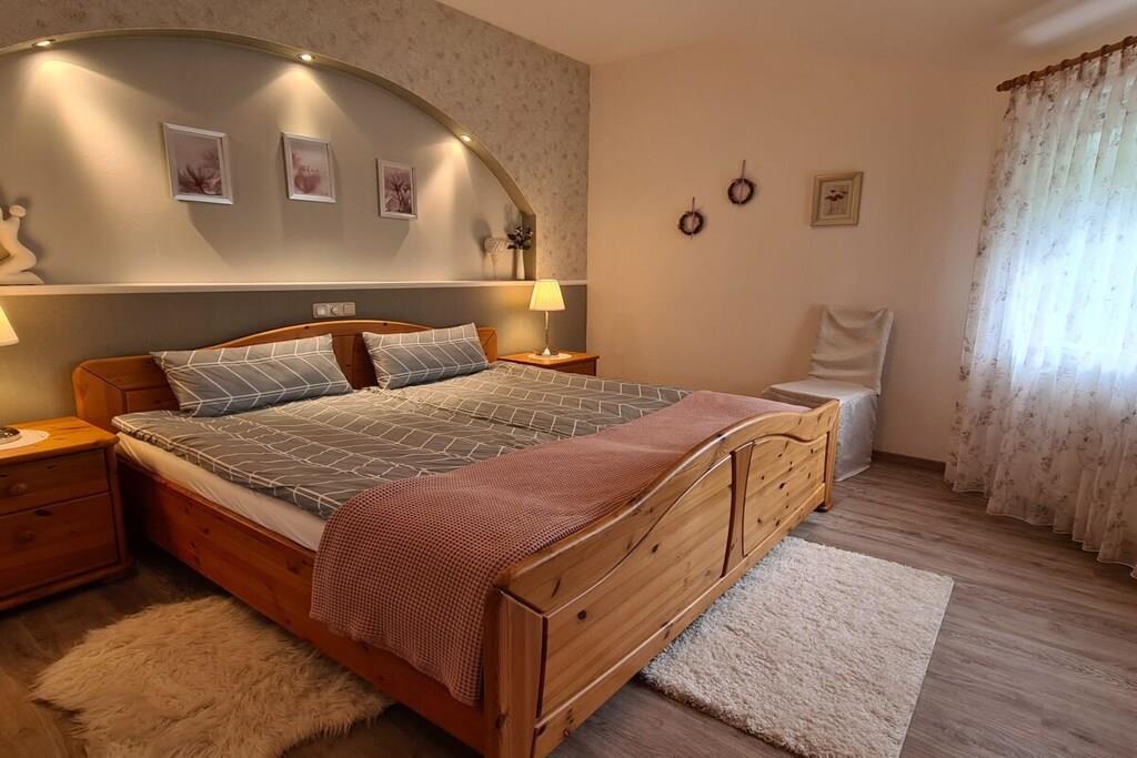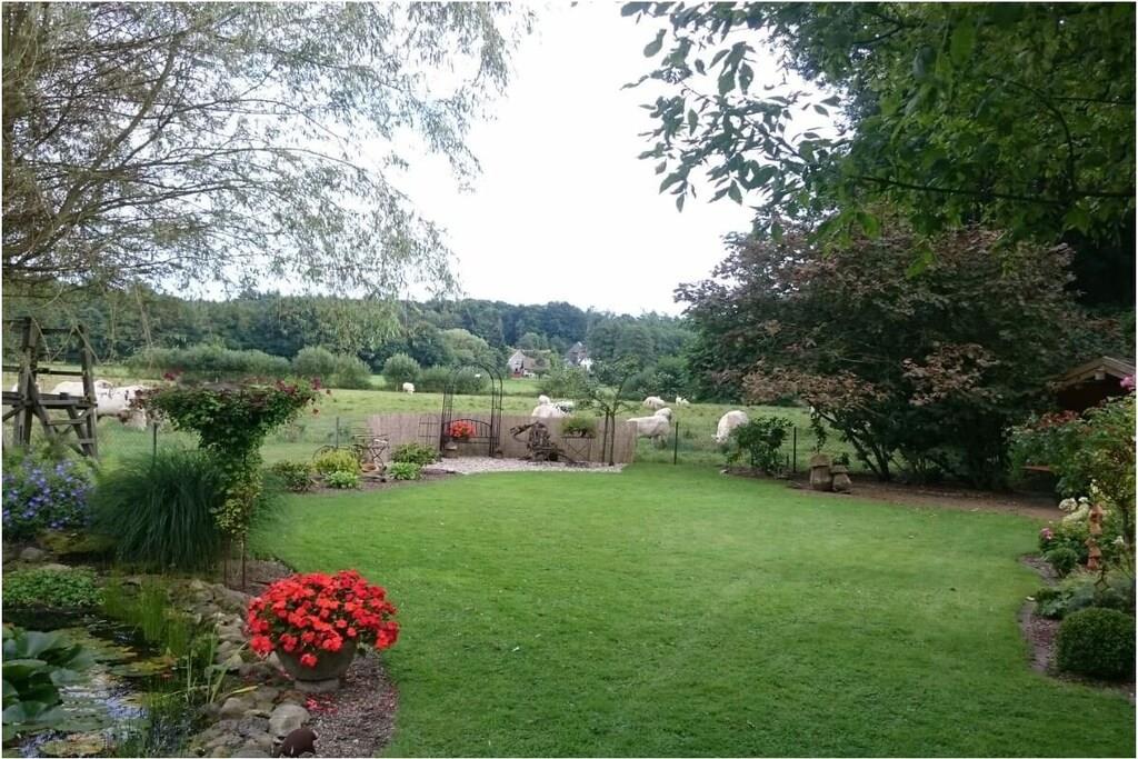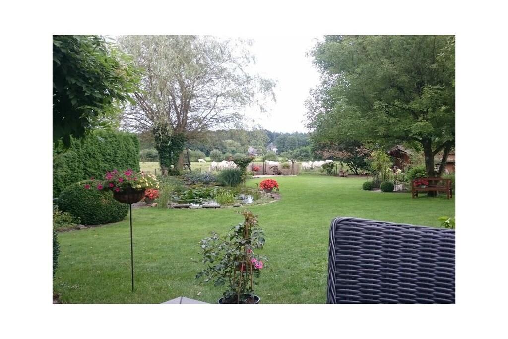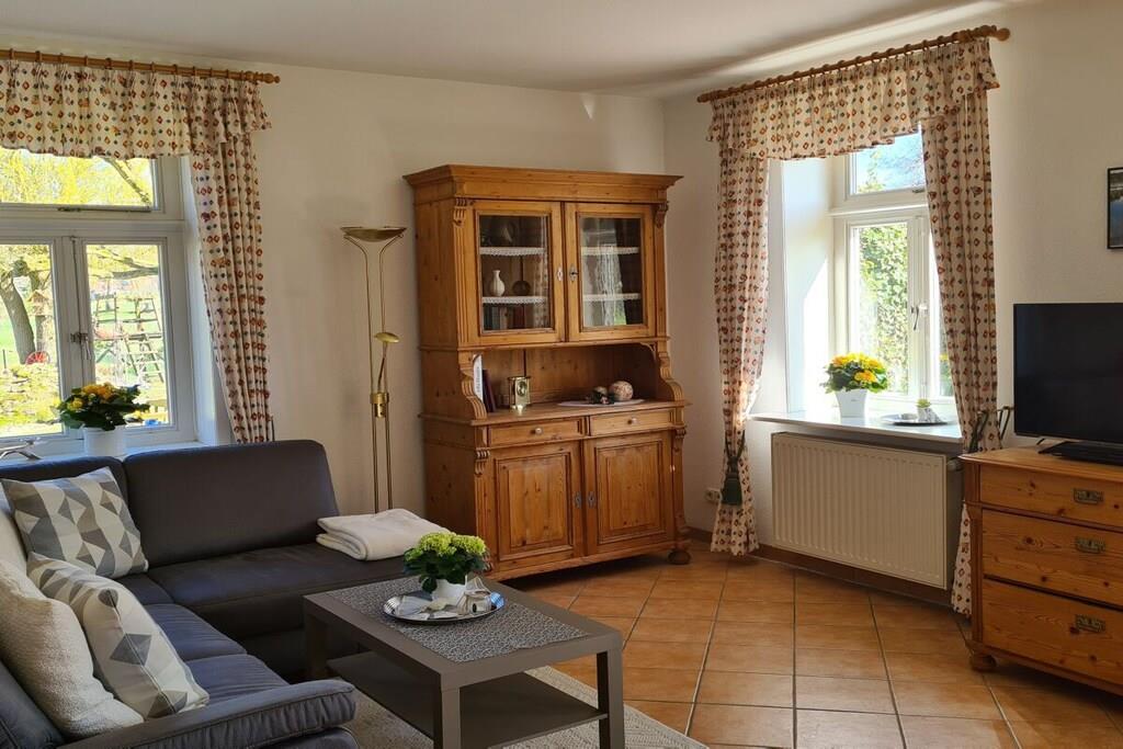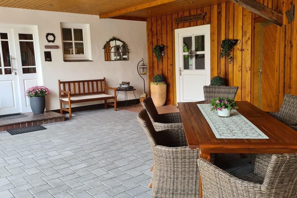 Ferielejligheden på 78 kvm har separat indgang, to separate soveværelser og en stue med integreret køkken. Badeværelset har bruser, toilet, spejlskab og håndvask. Der er hårtørrer. Stuen har satellit-tv og stereoanlæg. Telefon og internetadgang er også tilgængelige. Terrassen er møbleret med et havebord, stole og to liggestole. Der er grill. En markise giver skygge. Der er en parkeringsplads i gården.