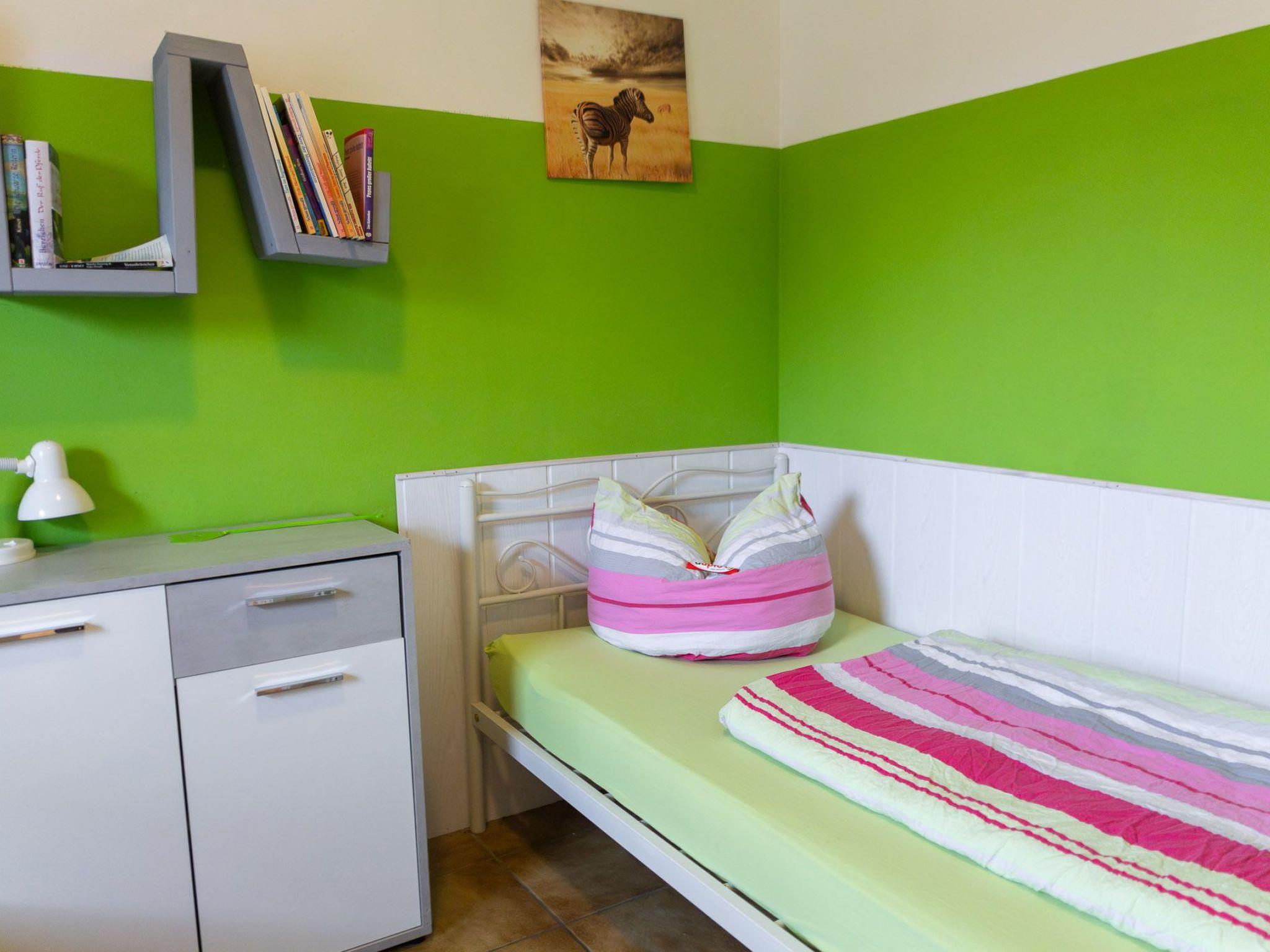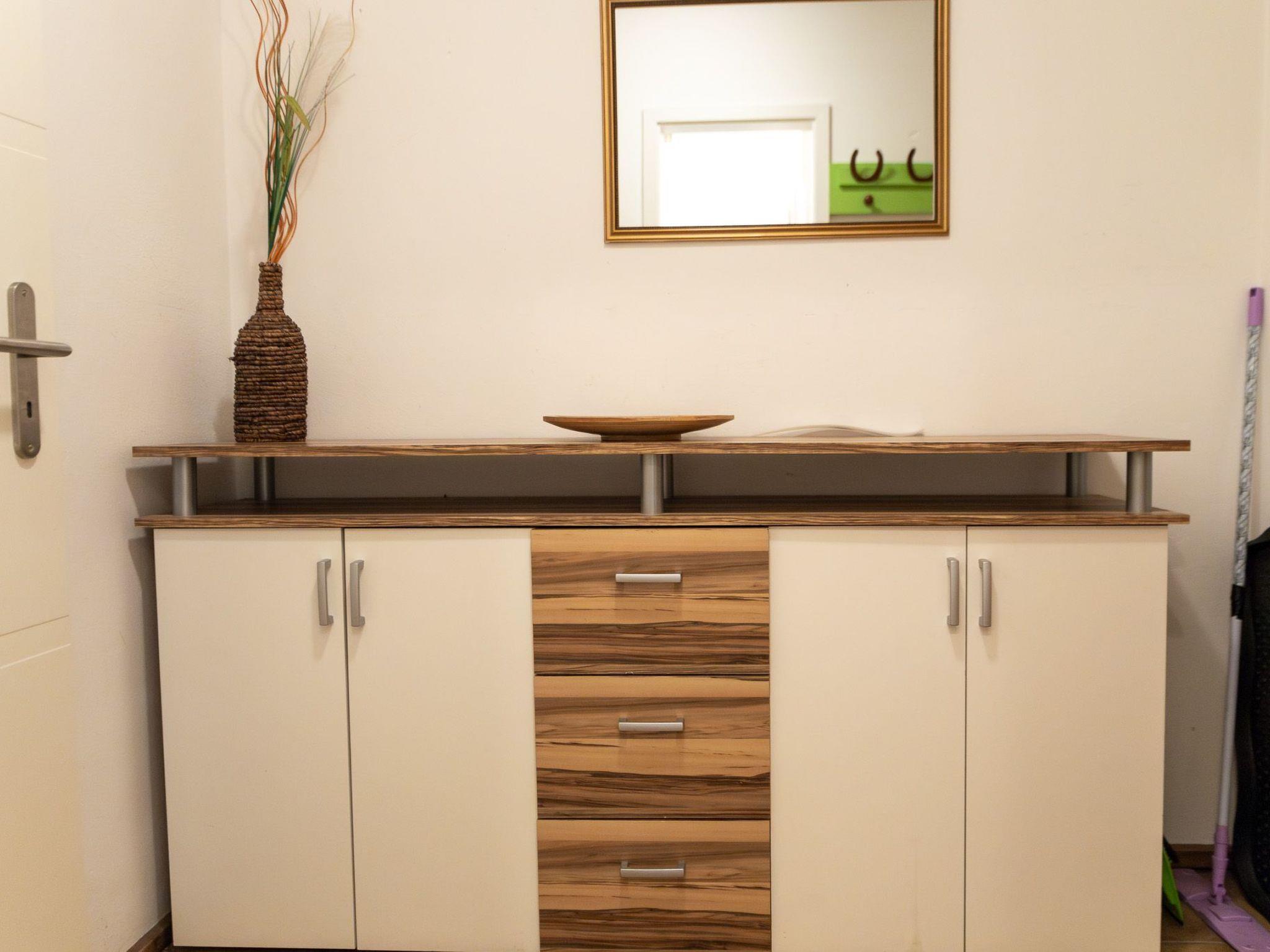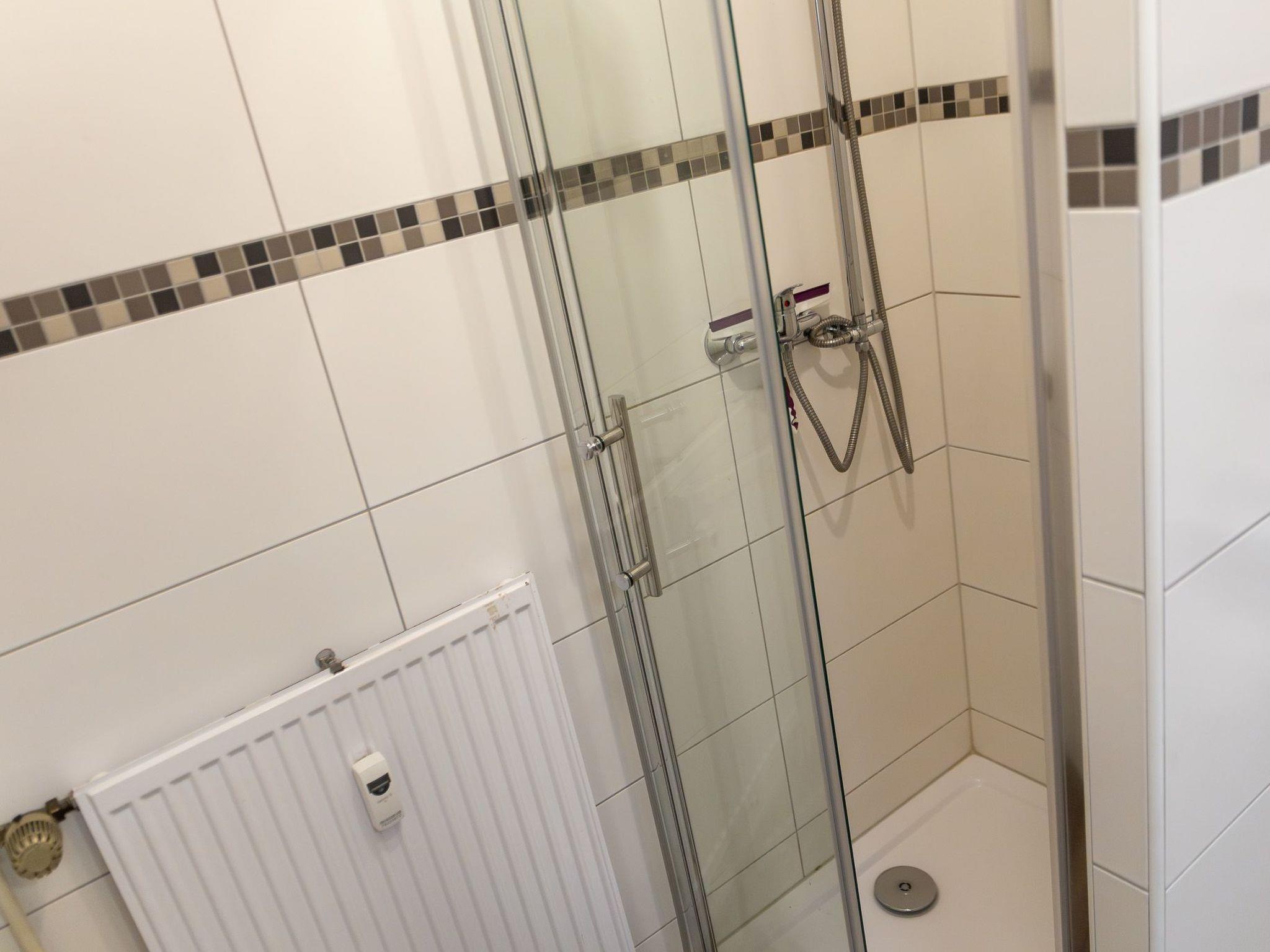 The apartment hallway with a rustic cupboard provides access to the two bedrooms, the living and dining room and the shower room with a WC. The first bedroom is furnished with a double bed ((140 x 200cm), while the second has two single beds (80 x 200cm) that can also be joined together. The centrepiece of the apartment is the living and dining room with a sofa with a recamiere for relaxing after a day trip. Satellite TV provides entertainment in the evening. You can dine together at the dining table with four chairs. The well-equipped, integrated, built-in kitchen includes an electric stove with four rings and an oven, a fridge, a dishwasher, a coffee machine, toaster and kettle.