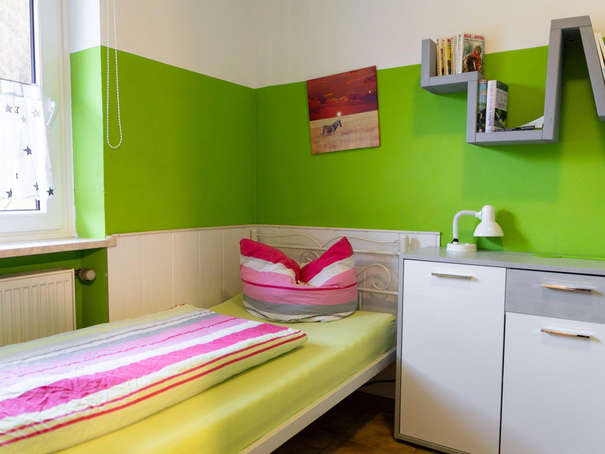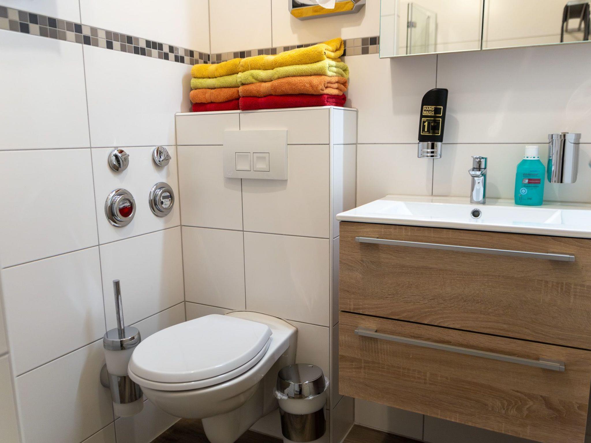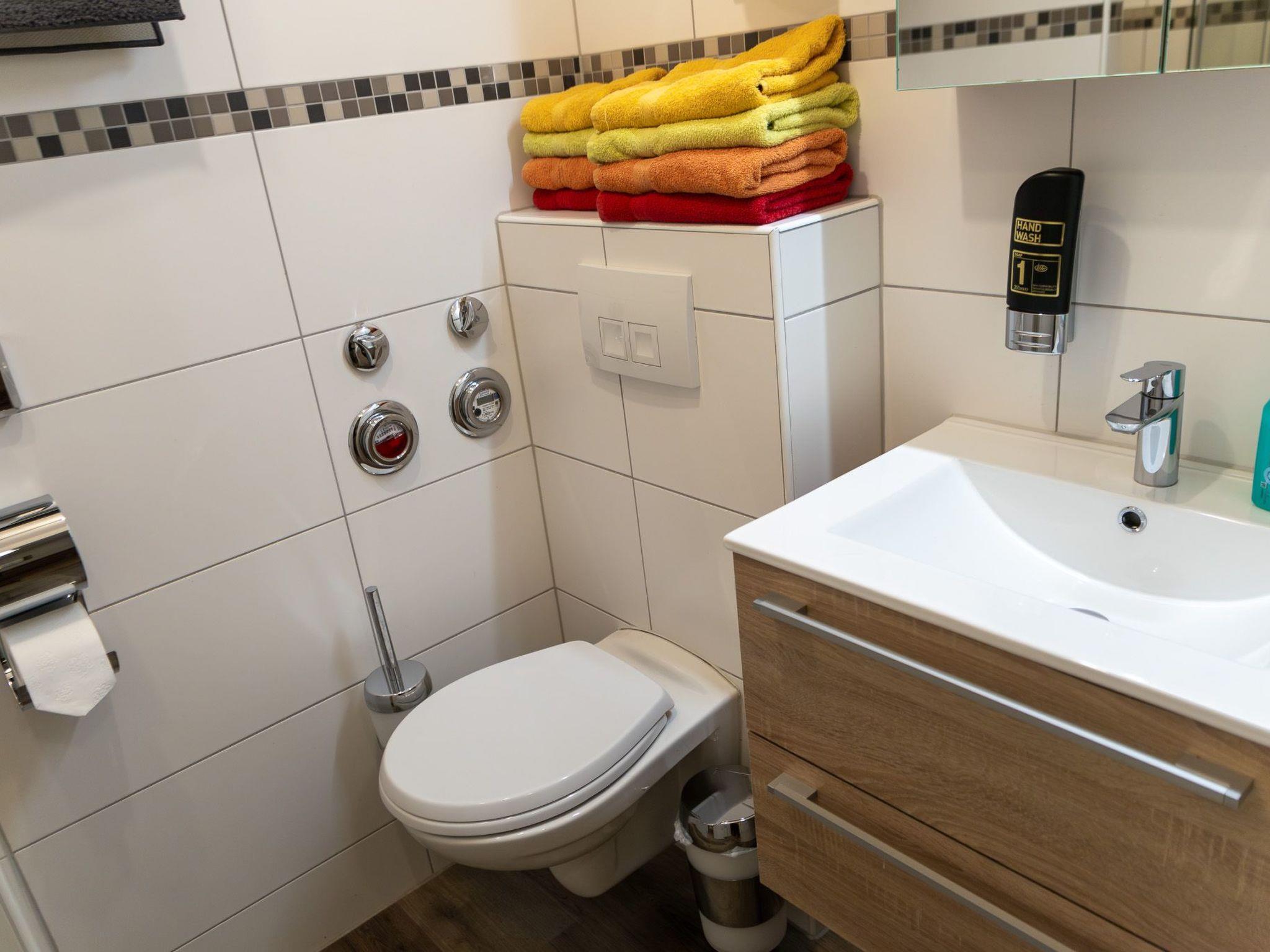 The apartment hallway with a rustic cupboard provides access to the two bedrooms, the living and dining room and the shower room with a WC. The first bedroom is furnished with a double bed ((140 x 200cm), while the second has two single beds (80 x 200cm) that can also be joined together. The centrepiece of the apartment is the living and dining room with a sofa with a recamiere for relaxing after a day trip. Satellite TV provides entertainment in the evening. You can dine together at the dining table with four chairs. The well-equipped, integrated, built-in kitchen includes an electric stove with four rings and an oven, a fridge, a dishwasher, a coffee machine, toaster and kettle.