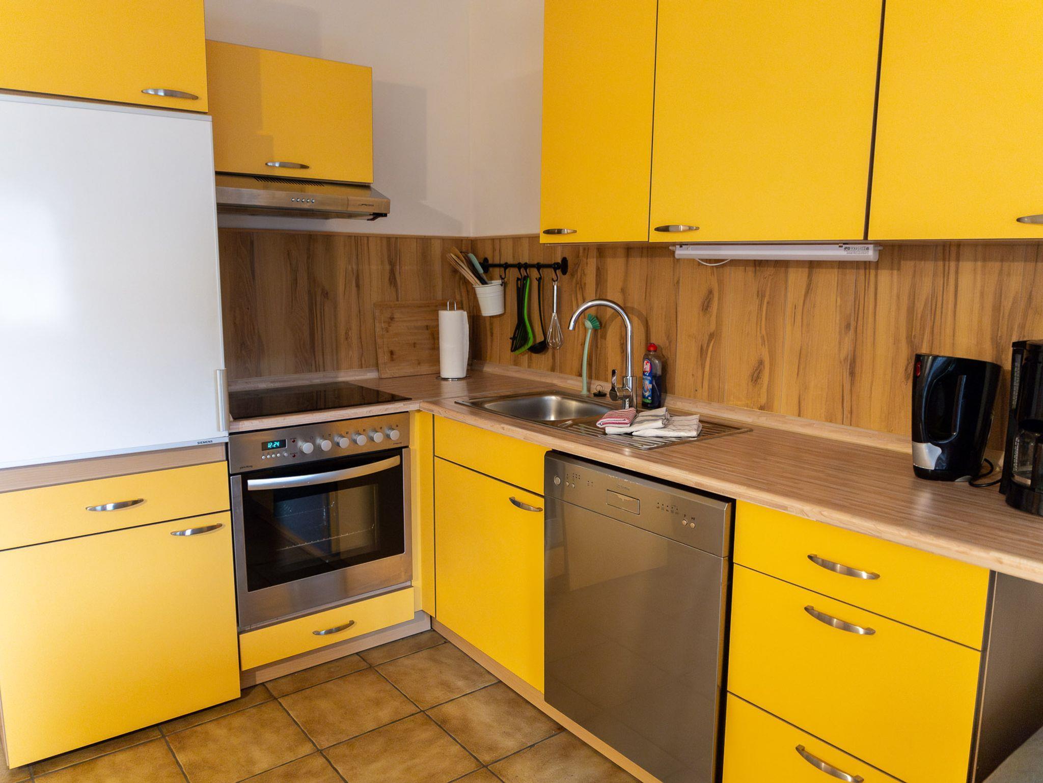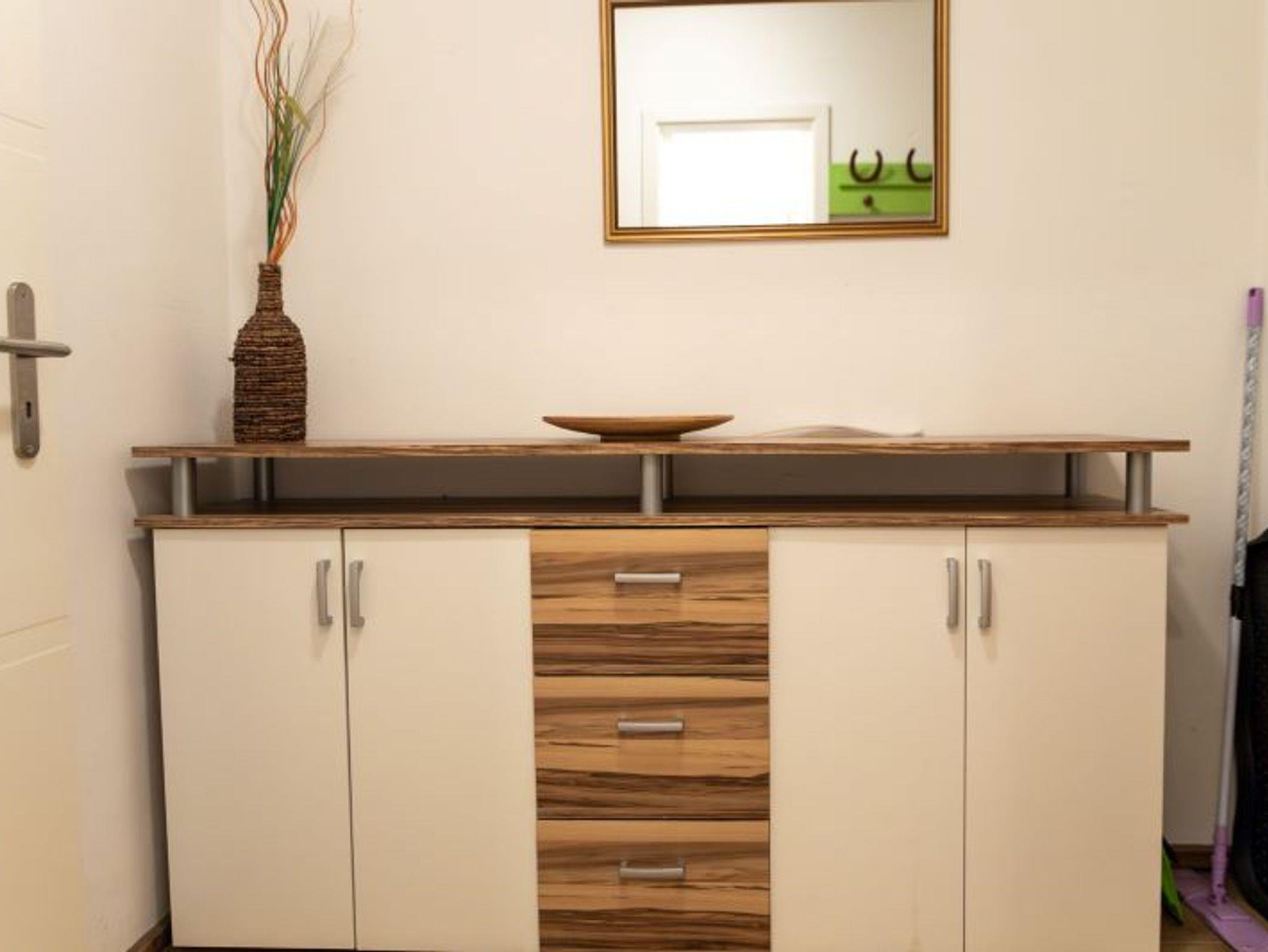 Sie verfügt über einen Flur, einem Koch-/Wohn-/und Essbereich, einem Schlafzimmer mit Ehebett (140cm x 200cm), einem Schlafzimmer mit zwei Einzelbetten (90cm x 200cm) und einem Bad mit Dusche, WC sowie beleuchtetem Spiegelschrank. Die Einbauküche ist mit einem Herd mit Backofen, einer Spülmaschine, einem Kühlschrank mit Gefrierfach sowie mit Kaffeemaschine, Toaster, Wasserkocher, etc. bestens ausgestattet.